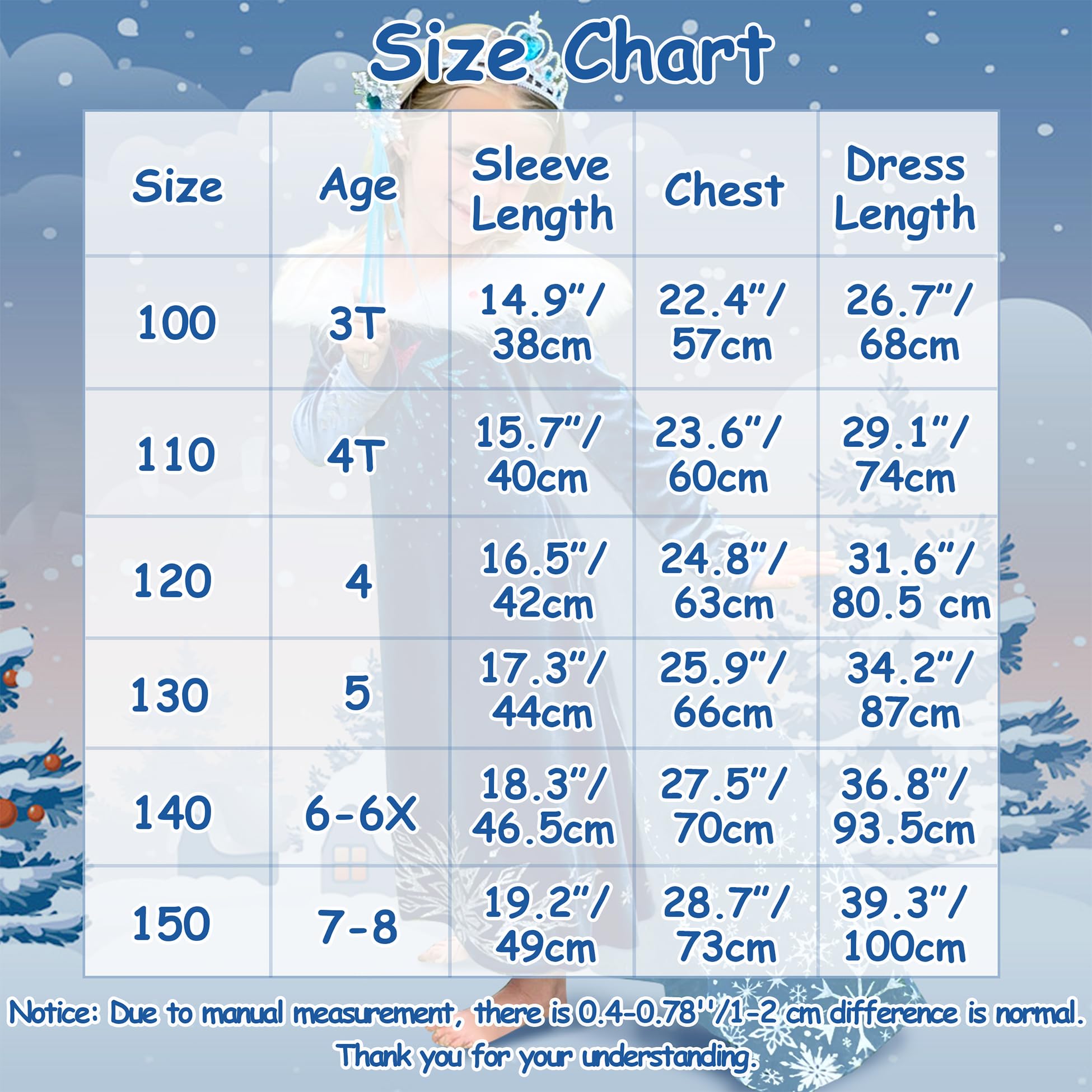 Applicable Occasions: Perfect for daily wear, Halloween cosplay, theme party, Christmas, role-playing Game, etc. Perfectly cosplay new style and fashion will receive much praise. This pretty princess dress is available in 6 sizes to fit girls ages 3-8. To ensure your best fit size, please check the "Size Chart" before placing an order.