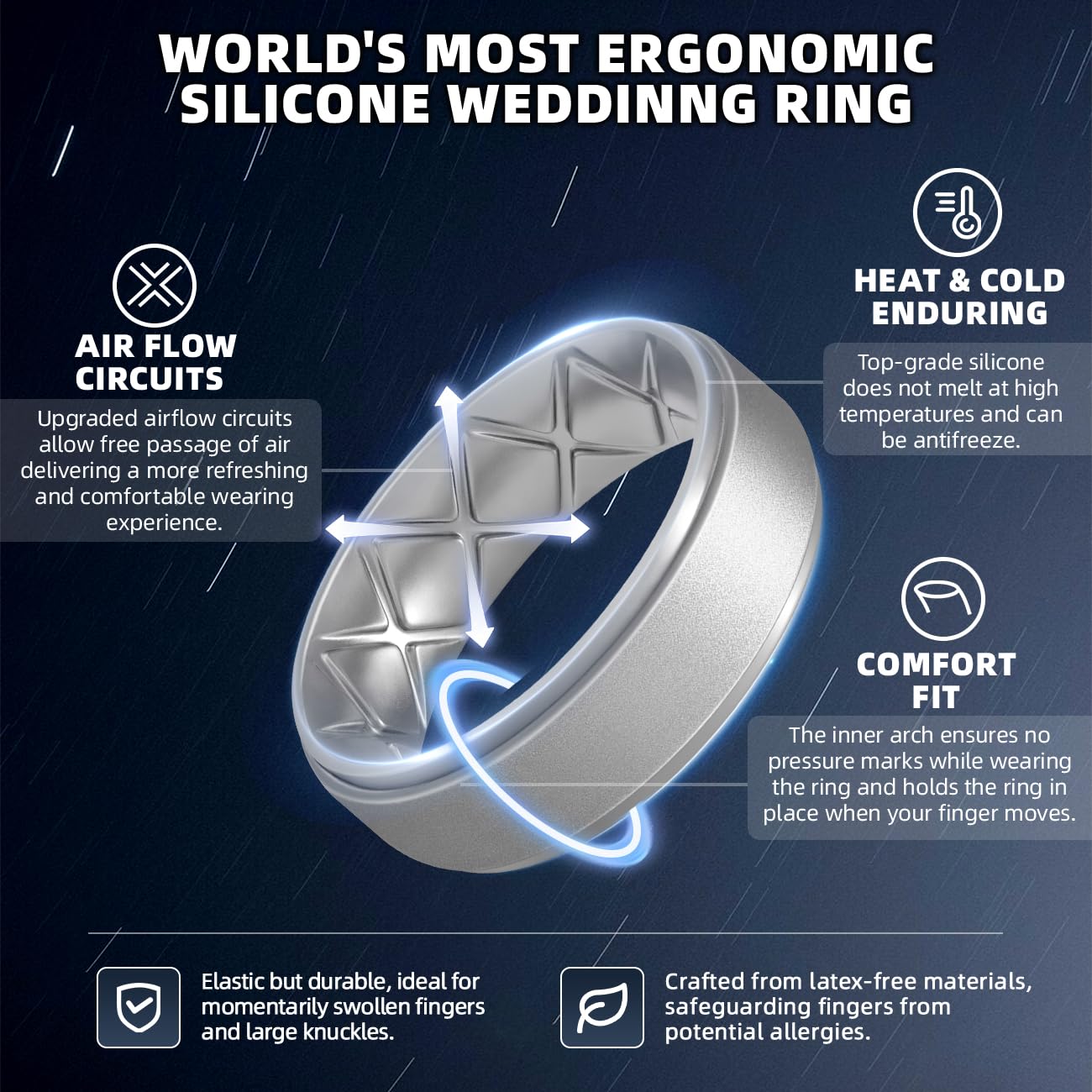 FLEXIBALE & SAFE: Top grade silicone is hypoallergenic, lightweight and soft. Superior than plastic rings in elasticity, skin adaptability and will break away while rubber wedding bands are under extreme stress to protect fingers. Easy to accommodate temporary swollen fingers or large knuckles and ideal for guys working with tools or electronics