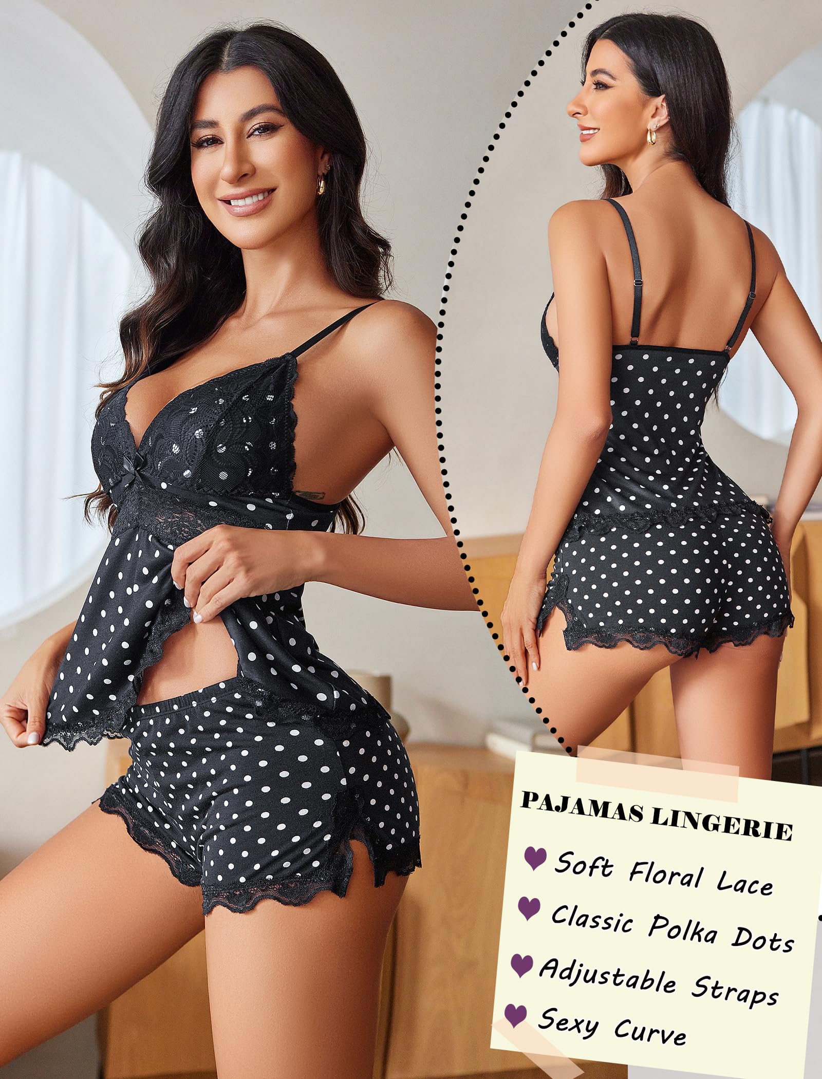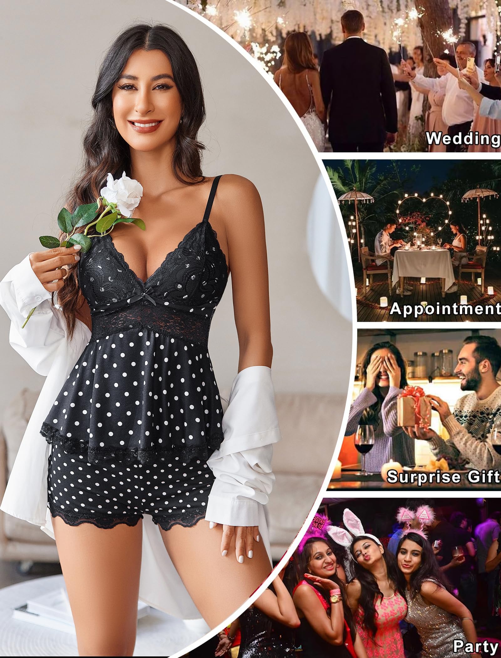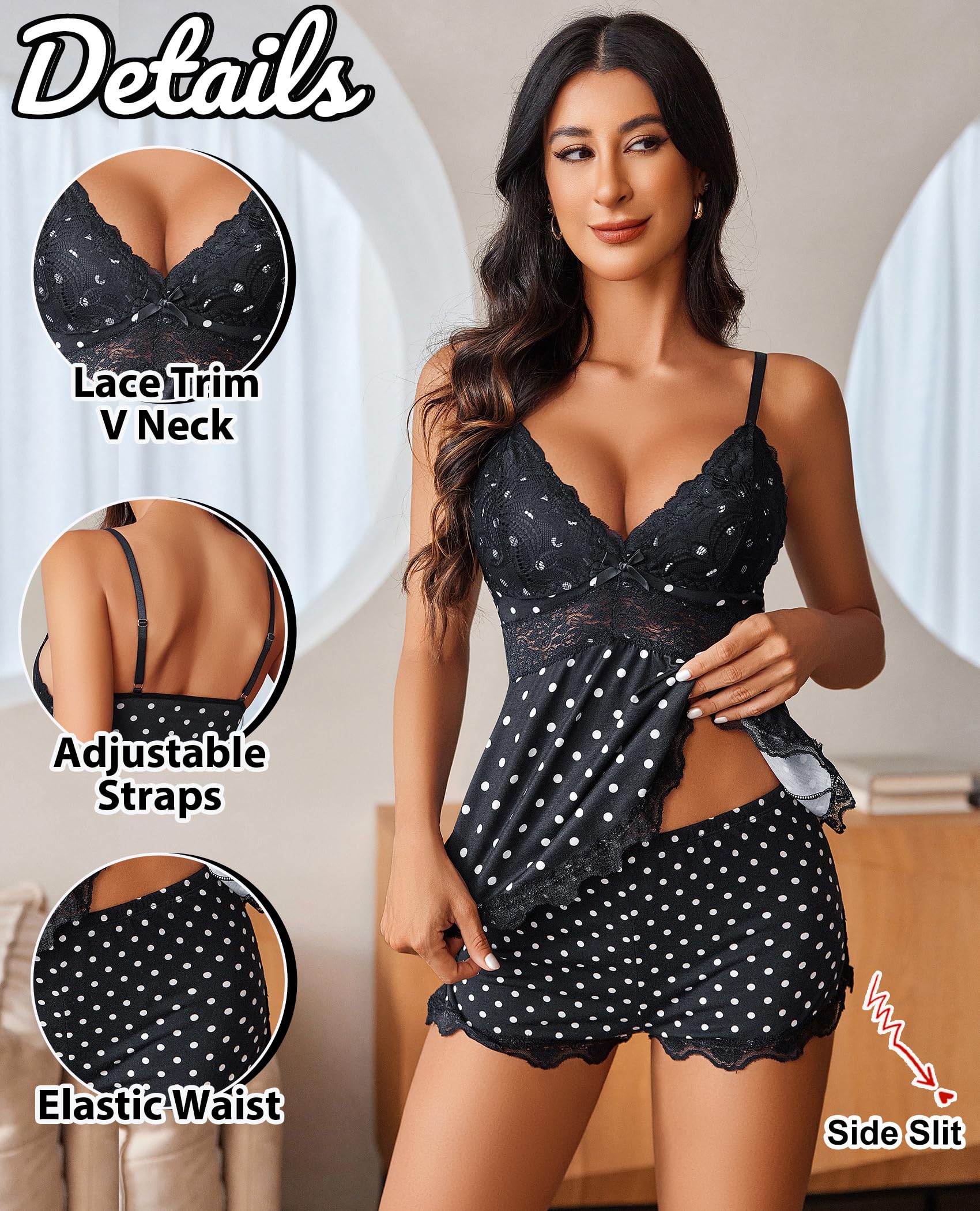 Avidlove short pajamas camisole Set featuring lace cups patchwork, adjustable spaghetti straps, drawstring waist. Very cute. Its casual style makes it not awkward even when kids at home or guest visits. The Pajamas Set is comfortable for your life