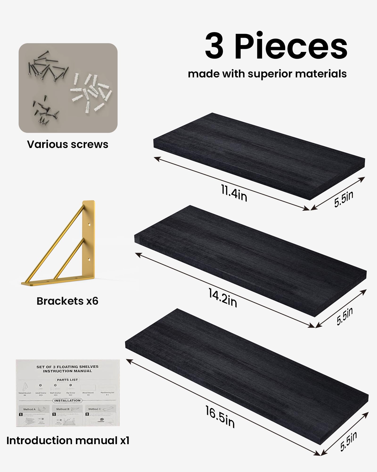 Three floating shelves made of solid Paulownia wood and metal brackets allow flexible layout and decor options for any room