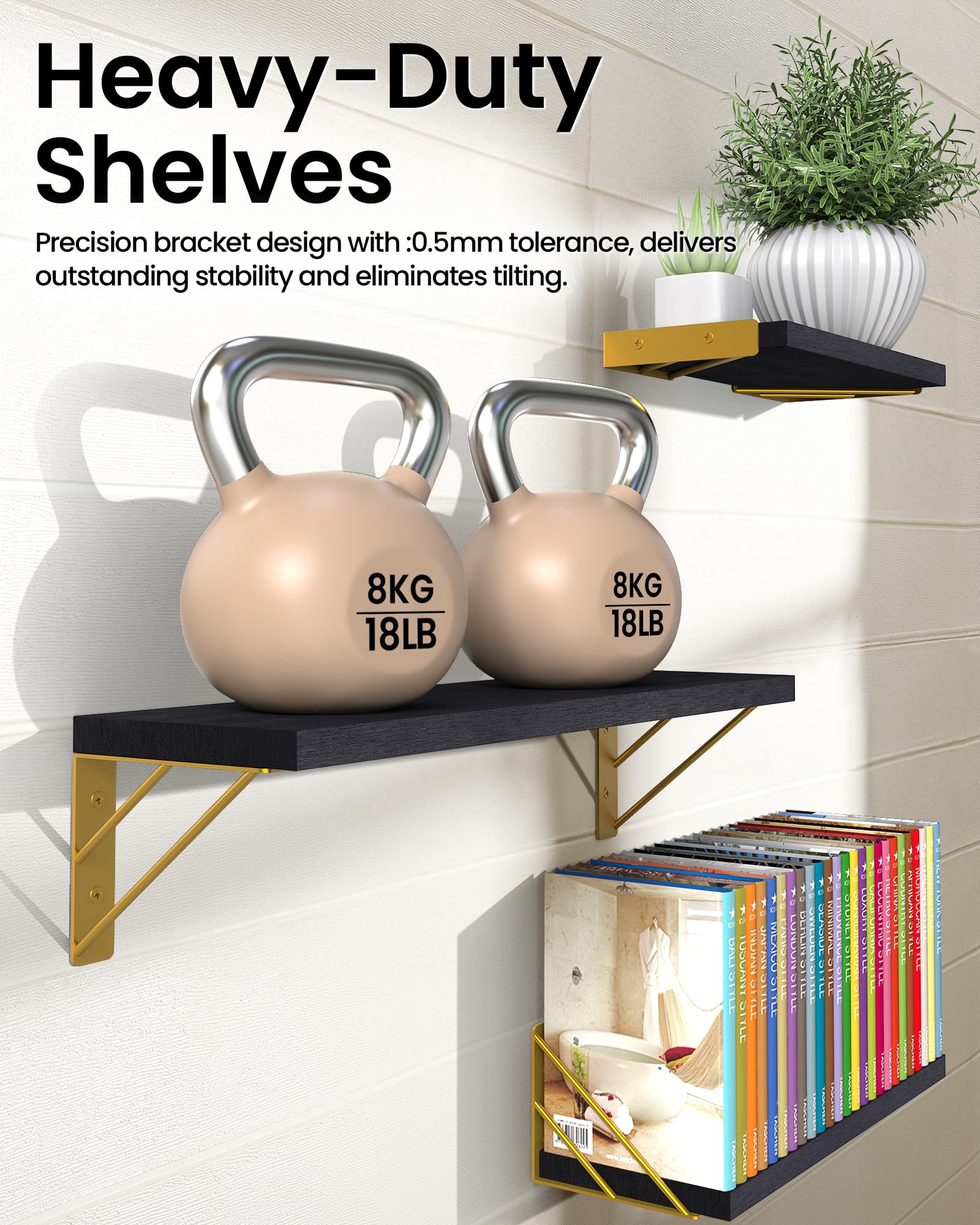 Wide and sturdy shelves to safely organize photos, plants, books, and collectibles; each shelf holds up to 40 lbs