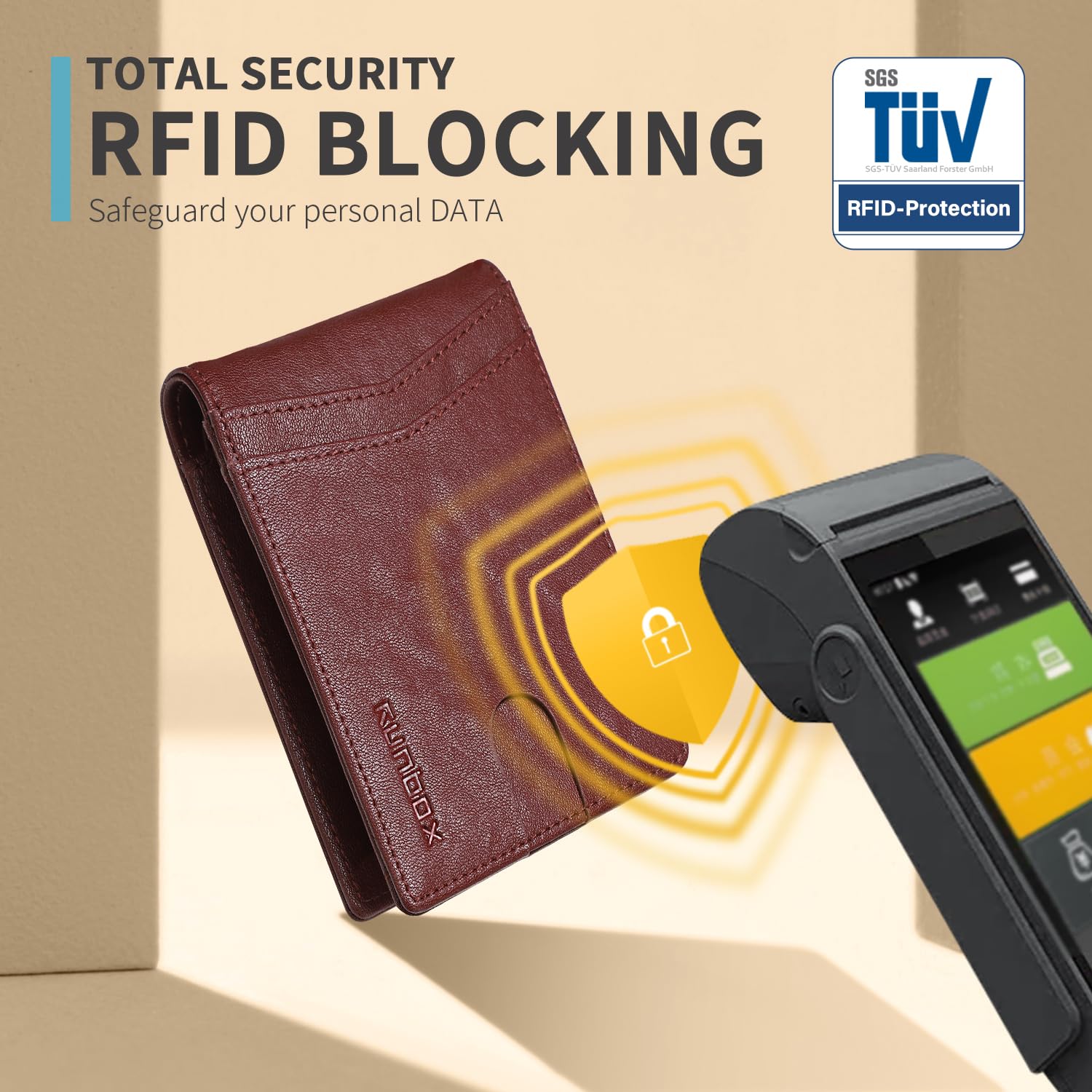 RFID Blocking - Our wallets are equipped with advanced RFID SECURE Technology, a unique metal composite, engineered specifically to block 13.56 MHz or higher RFID signals and protect the valuable information stored on RFID chips from unauthorized scans. License and ID cards will be protected effectively. Blocking the 13.56 MHz band and protect against data theft by RFID scanners
