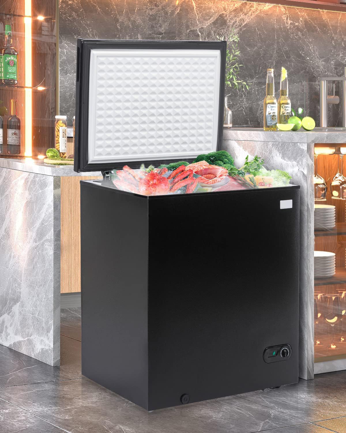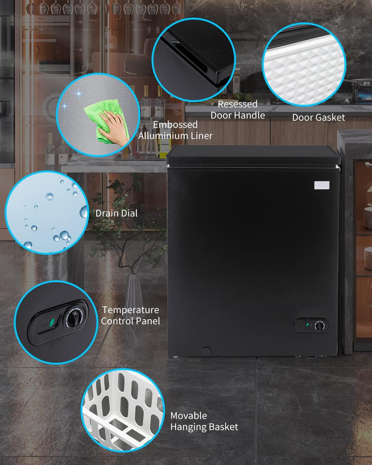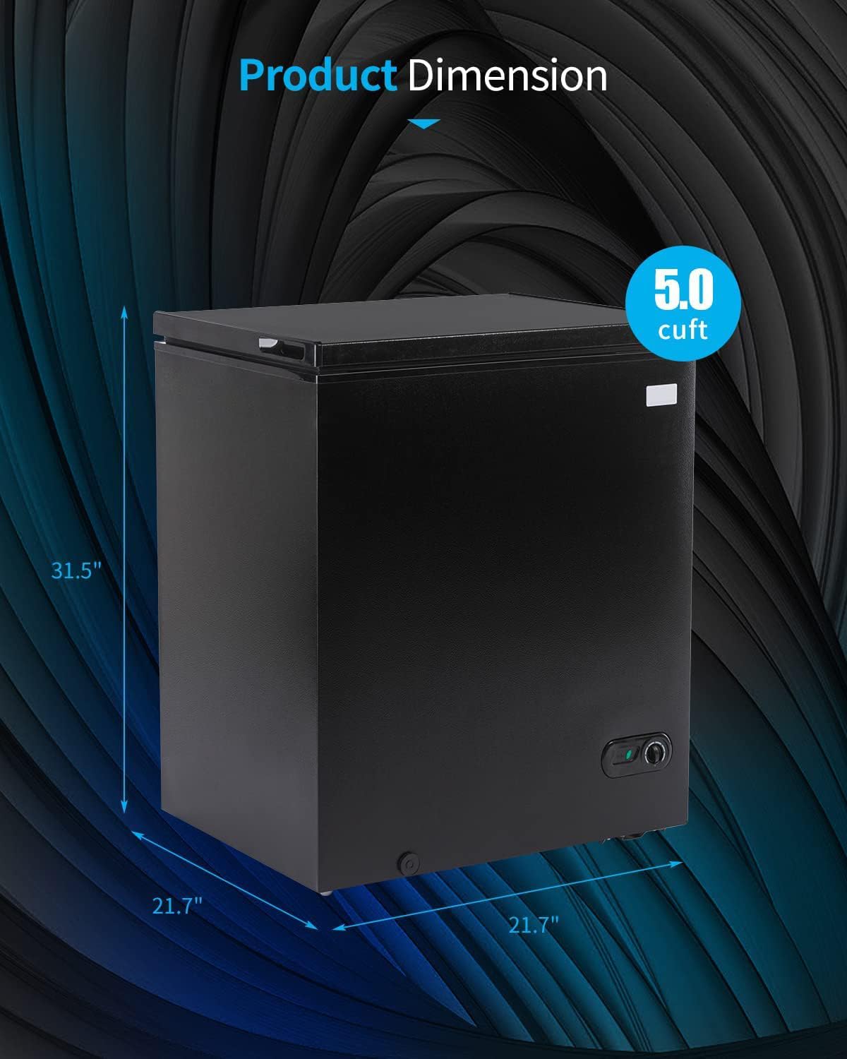 【Compact but Large Capacity】All functions of our chest freezer are designed so compact (21.7 x 21.7 x 31.5 inches). Our 5.0 cubic foot compact freezer is designed to save a lot of food in the kitchen. It can be used to preserve seafood, ice cream, meat, etc.
