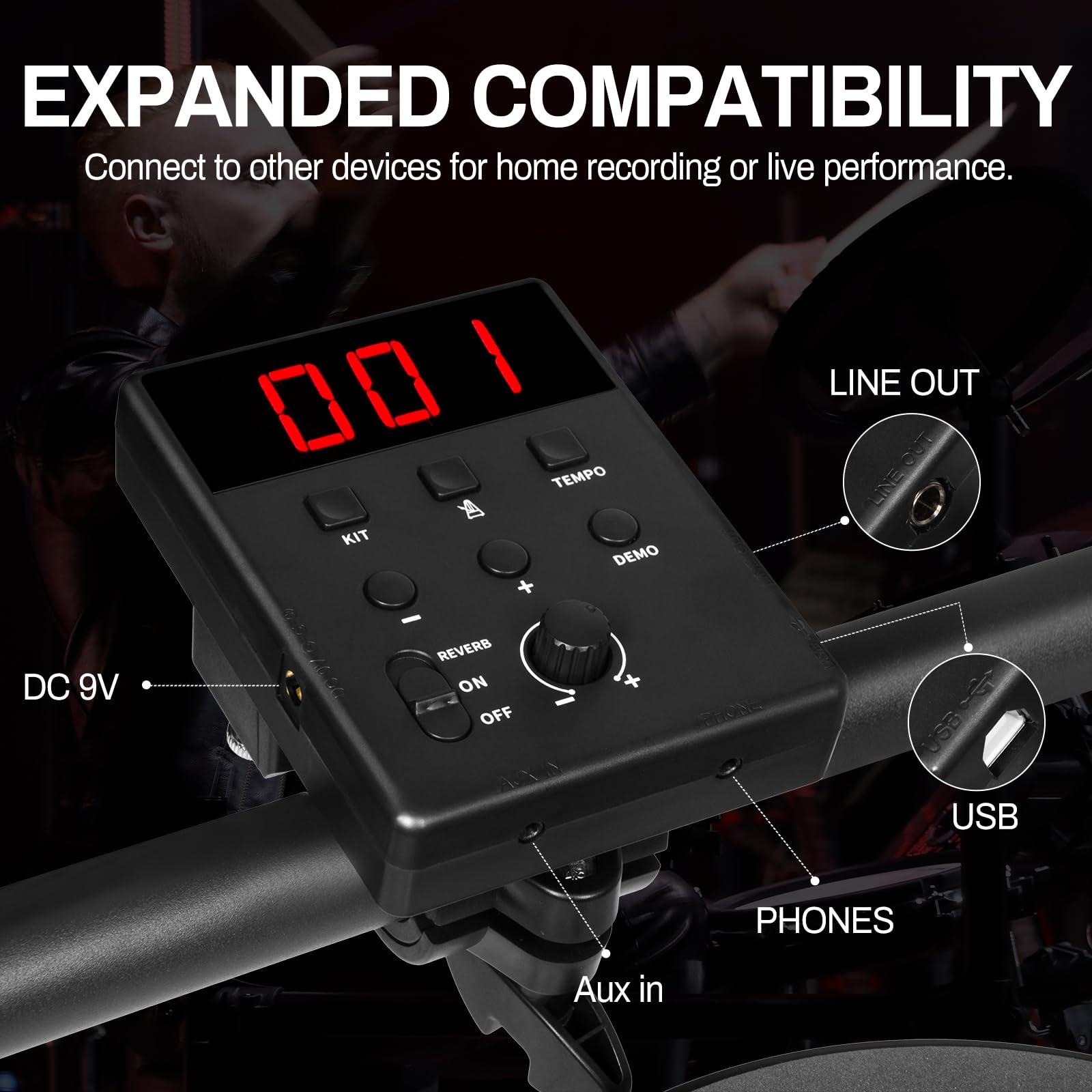 [Complete Electric Drum Set]:AODSK Electric Drum Set,a realistic drumming experience,It comes with 4x8'' drum pads,3x10" cymbals with 20 play-along songs and 120 Sounds,a full strike zone,a sturdy metal frame,drum module,drum throne, drumsticks,headphones, and all cables needed.It is portable and can be folded and can be easily stored and practiced.Come with drum throne,drum stick,earphones,and printer cables