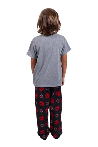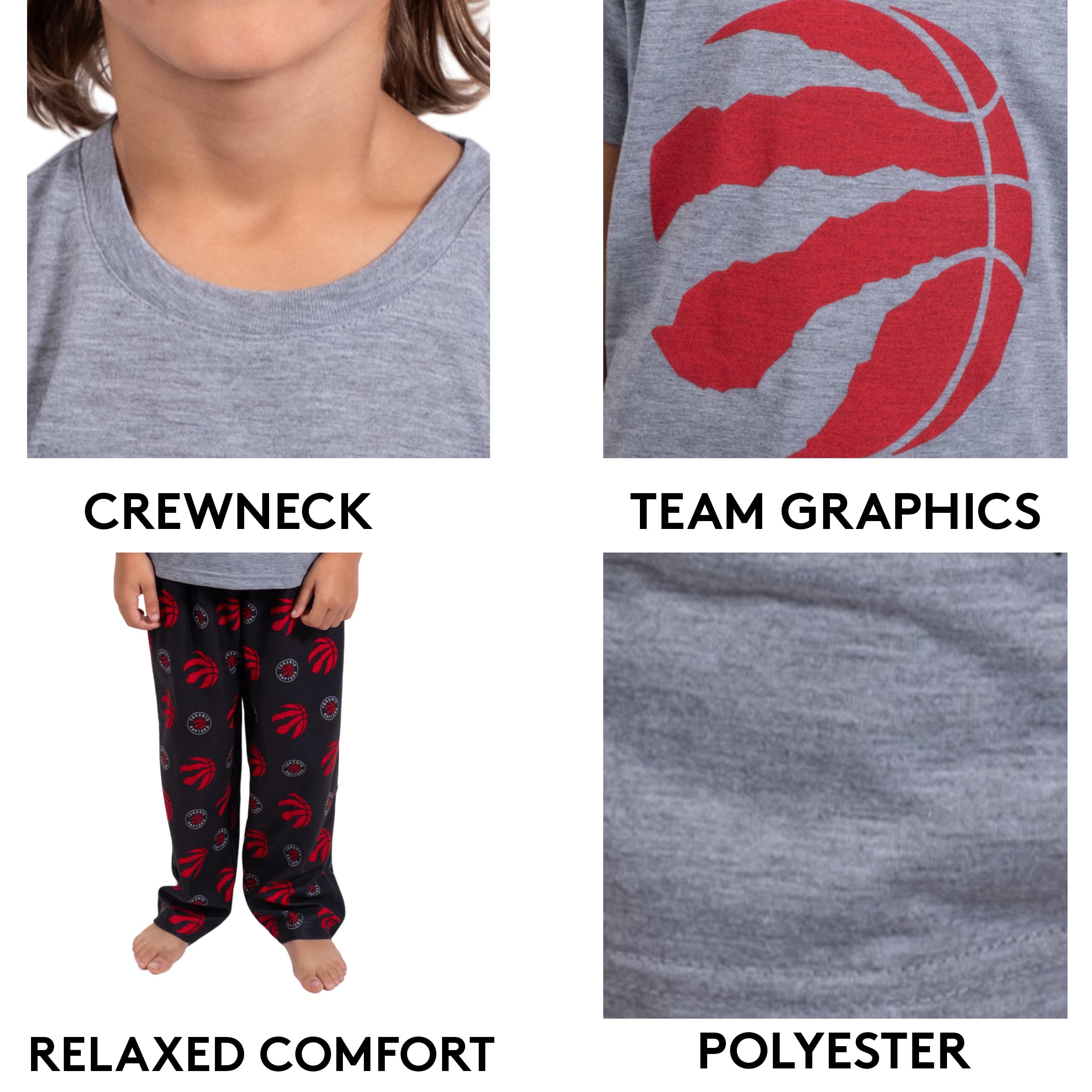 TEAM PRIDE: kids can show their NBA team pride from top to bottom with this set. The bottoms have an all-over print with the team's primary and secondary logos. The top has one large screen print of the primary logo across the front.