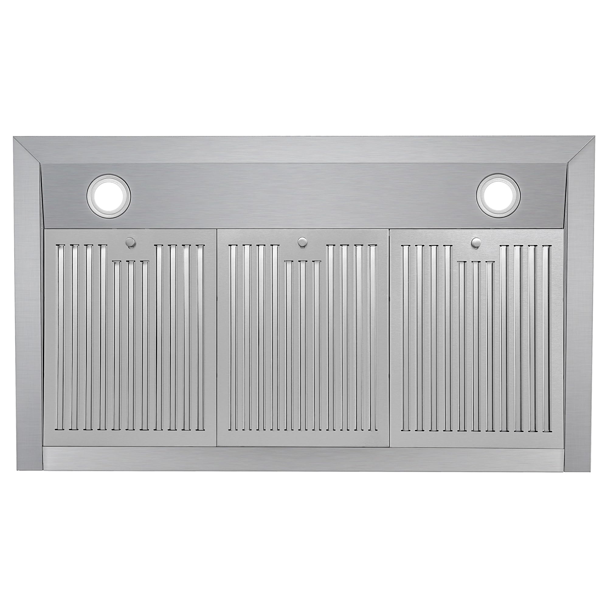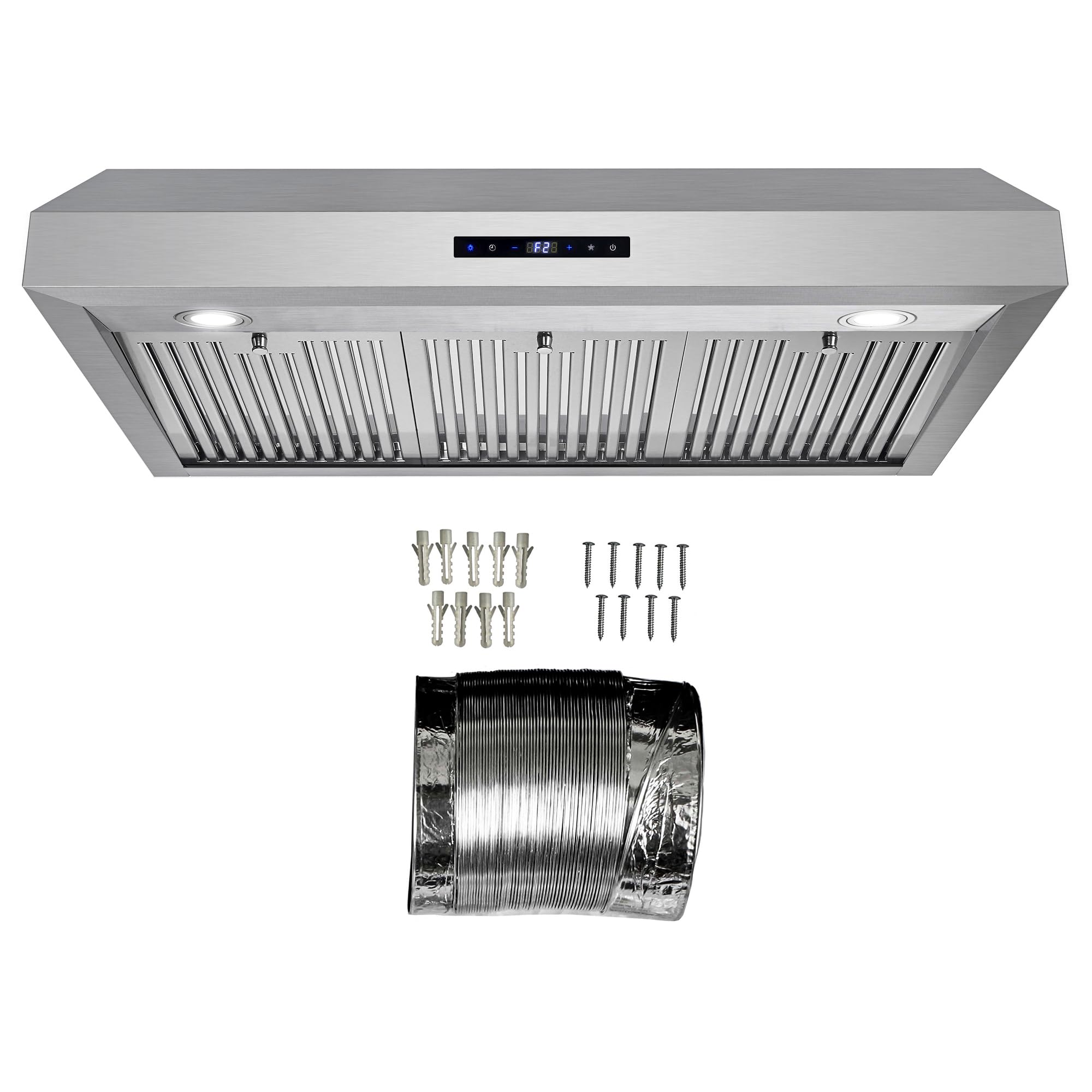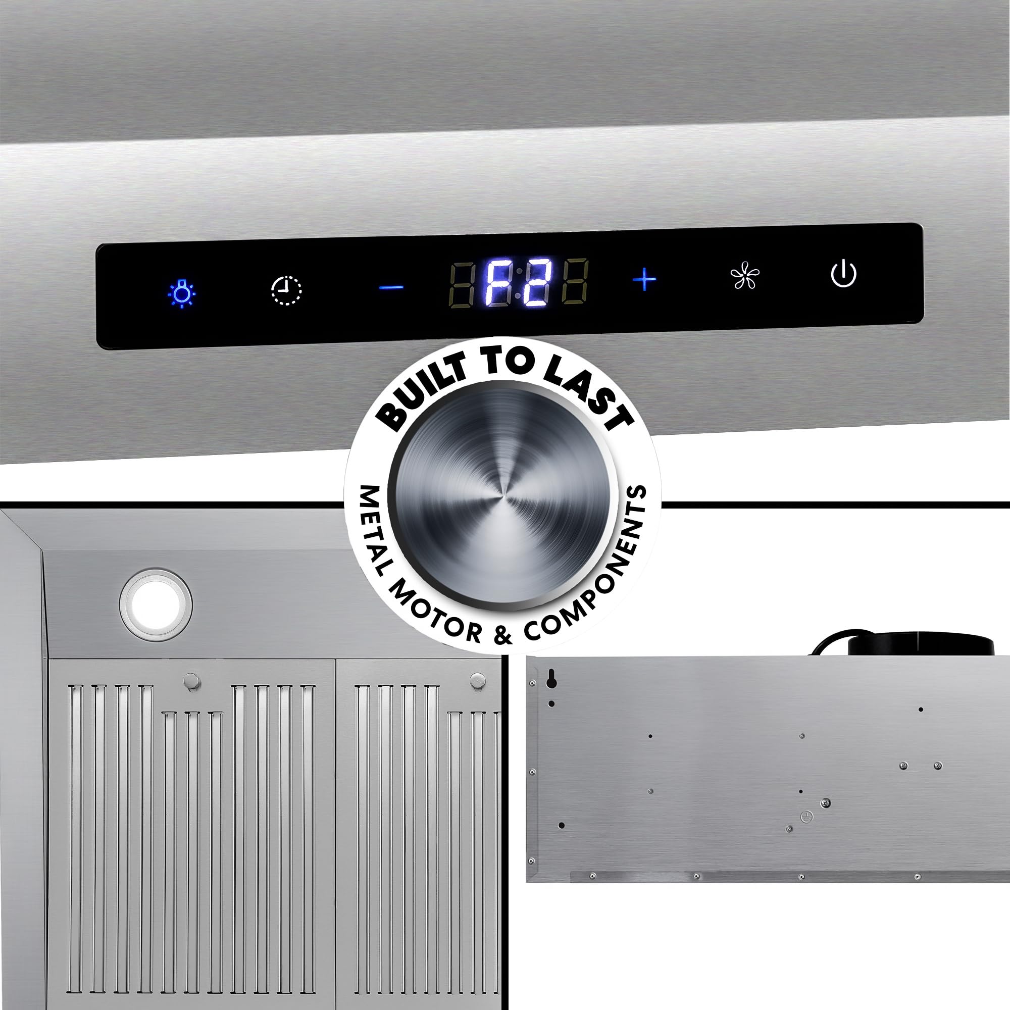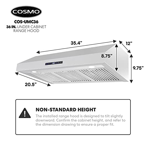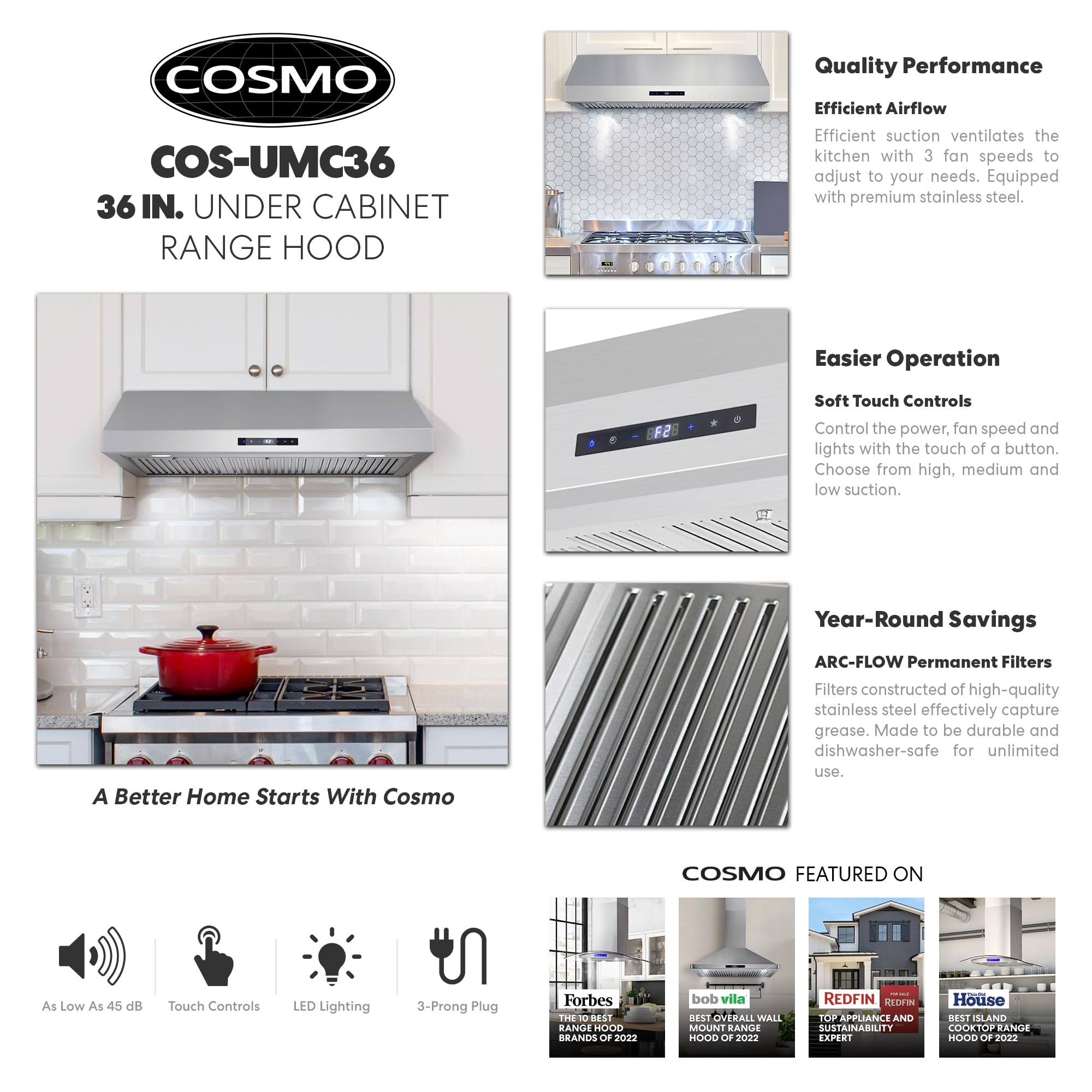 Go beyond basic air filtration with Cosmo’s UMC36 36 in. under cabinet range hood. This elegant unit has a sleek touchscreen with backlit display. 380 CFM is available at your fingertips for efficient kitchen ventilation. Enable the convenient timer function and energy-efficient LEDs with just a few taps. The integrated display makes information available with just a quick glance. Dishwasher-safe stainless steel baffle filters are removable for easy no-mess clean-up. Part of the Haven Collection bringing enhanced functionality and design, offering a well-rounded option for those looking for more convenience and style in an appliance.
