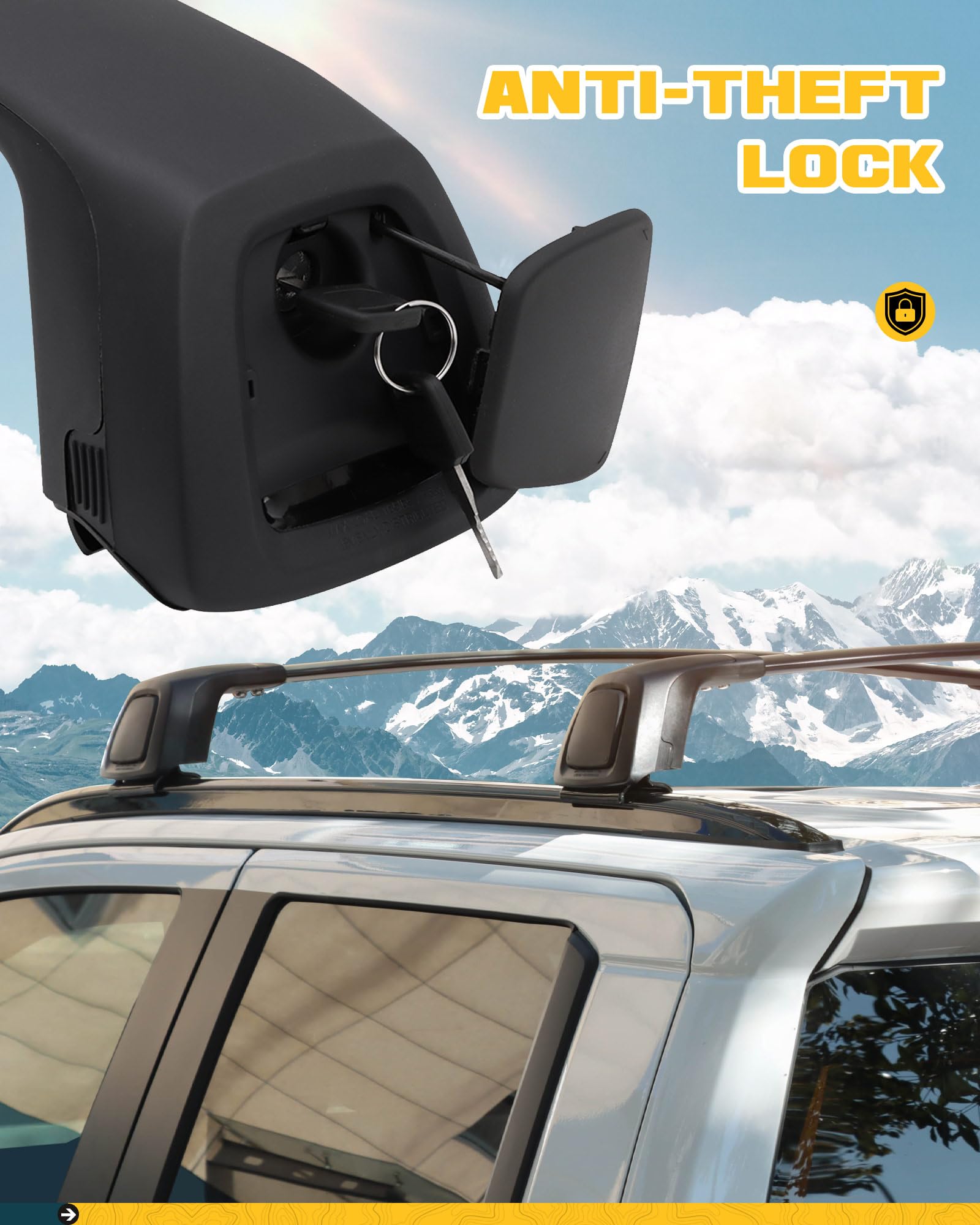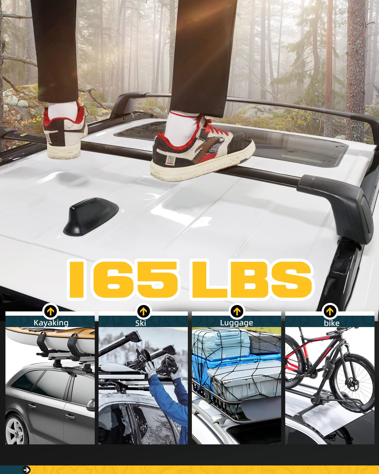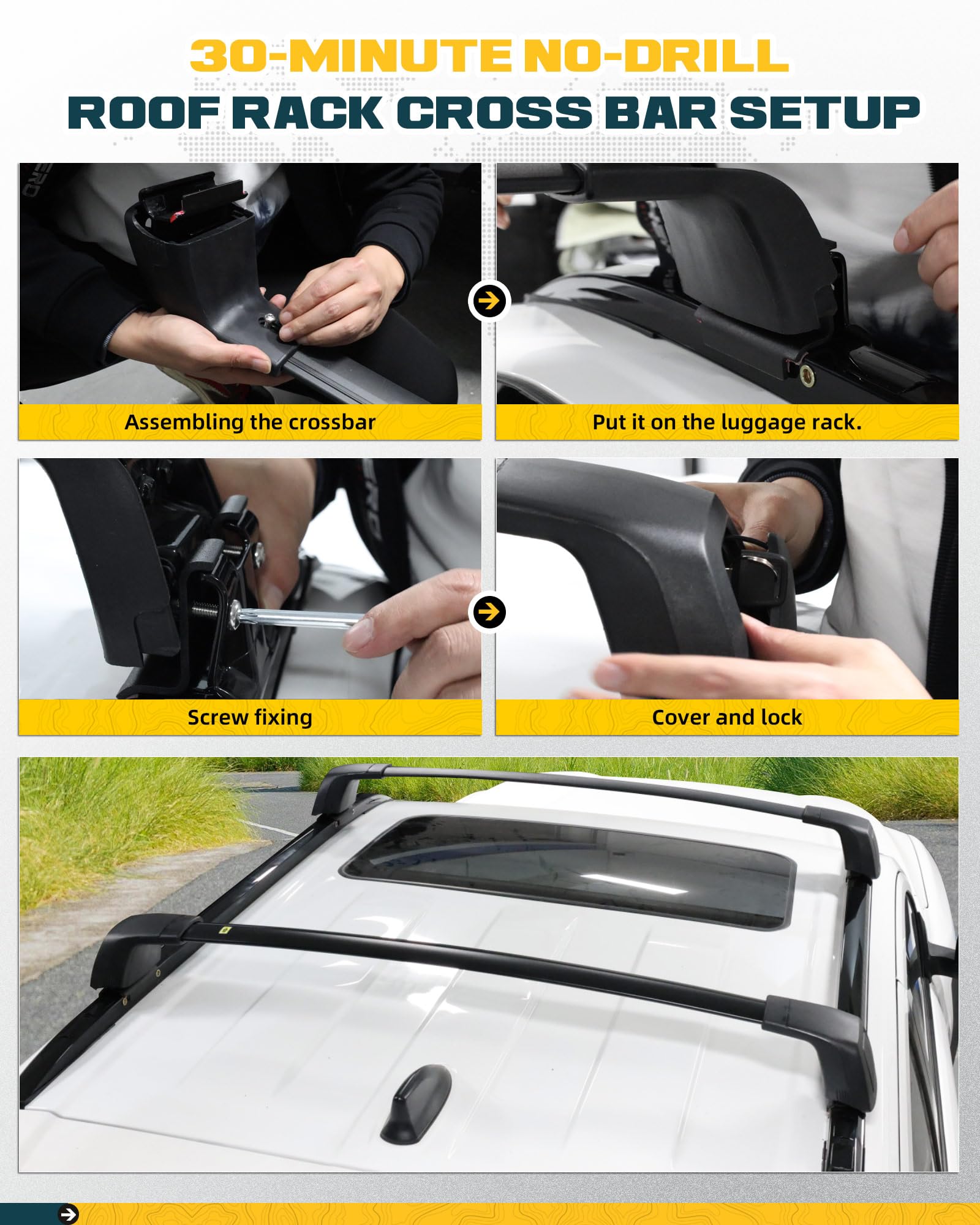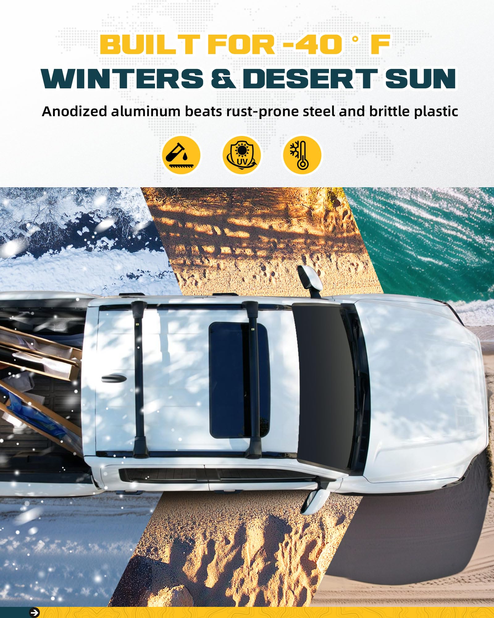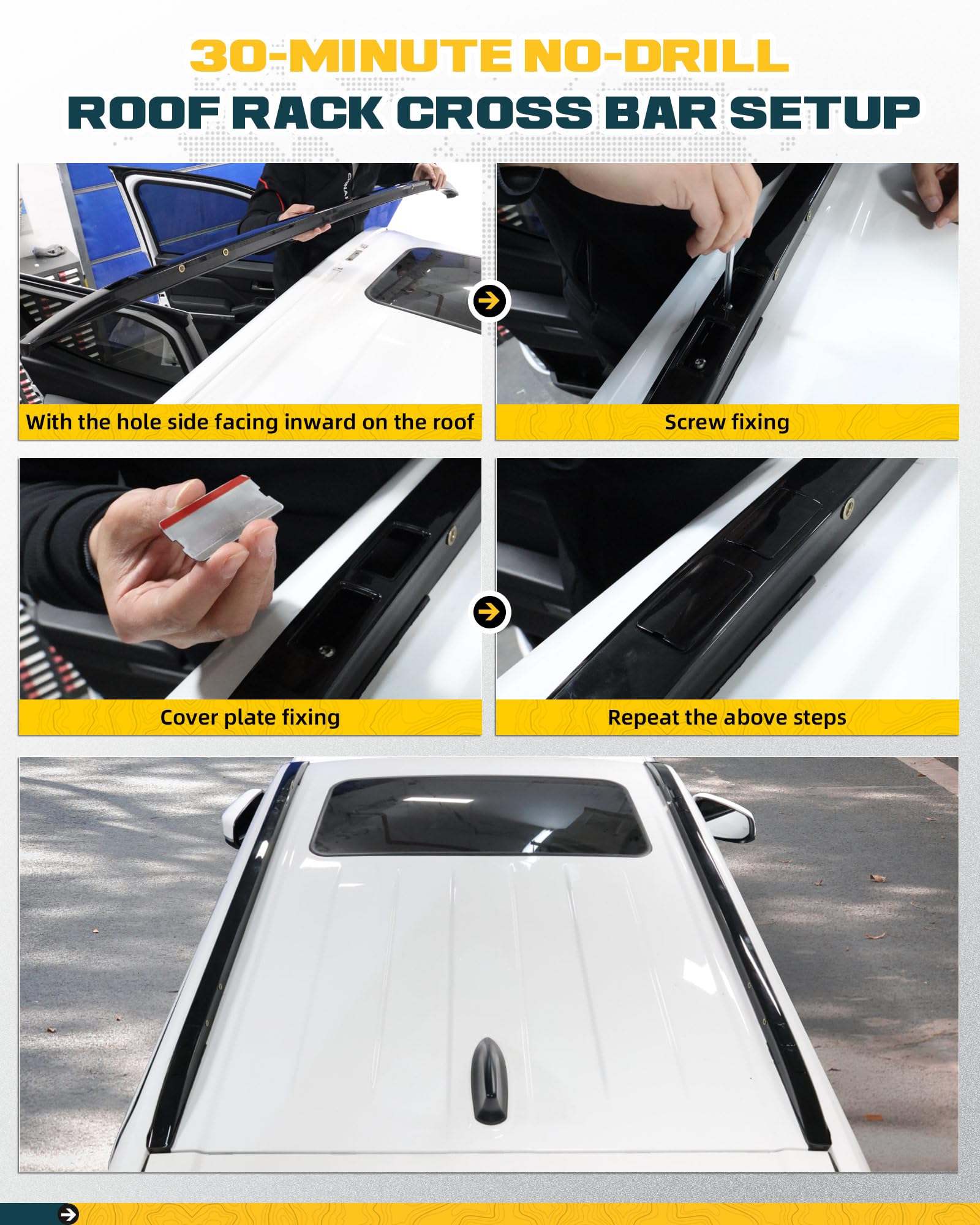 Premium Materials: The luggage rack cross bars are made of high-quality light weight durable aluminum. Black powder coating and high-quality hardware accessories provide effective anti-corrosion and anti-rust protection. Can cope with all kinds of bad and extreme weather