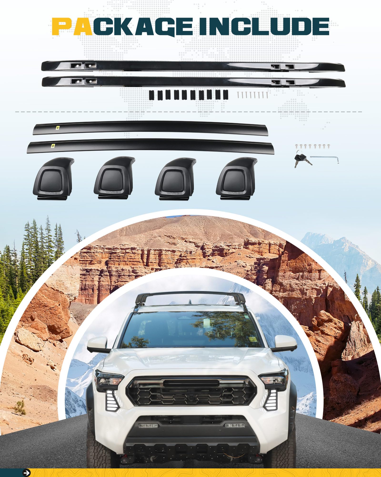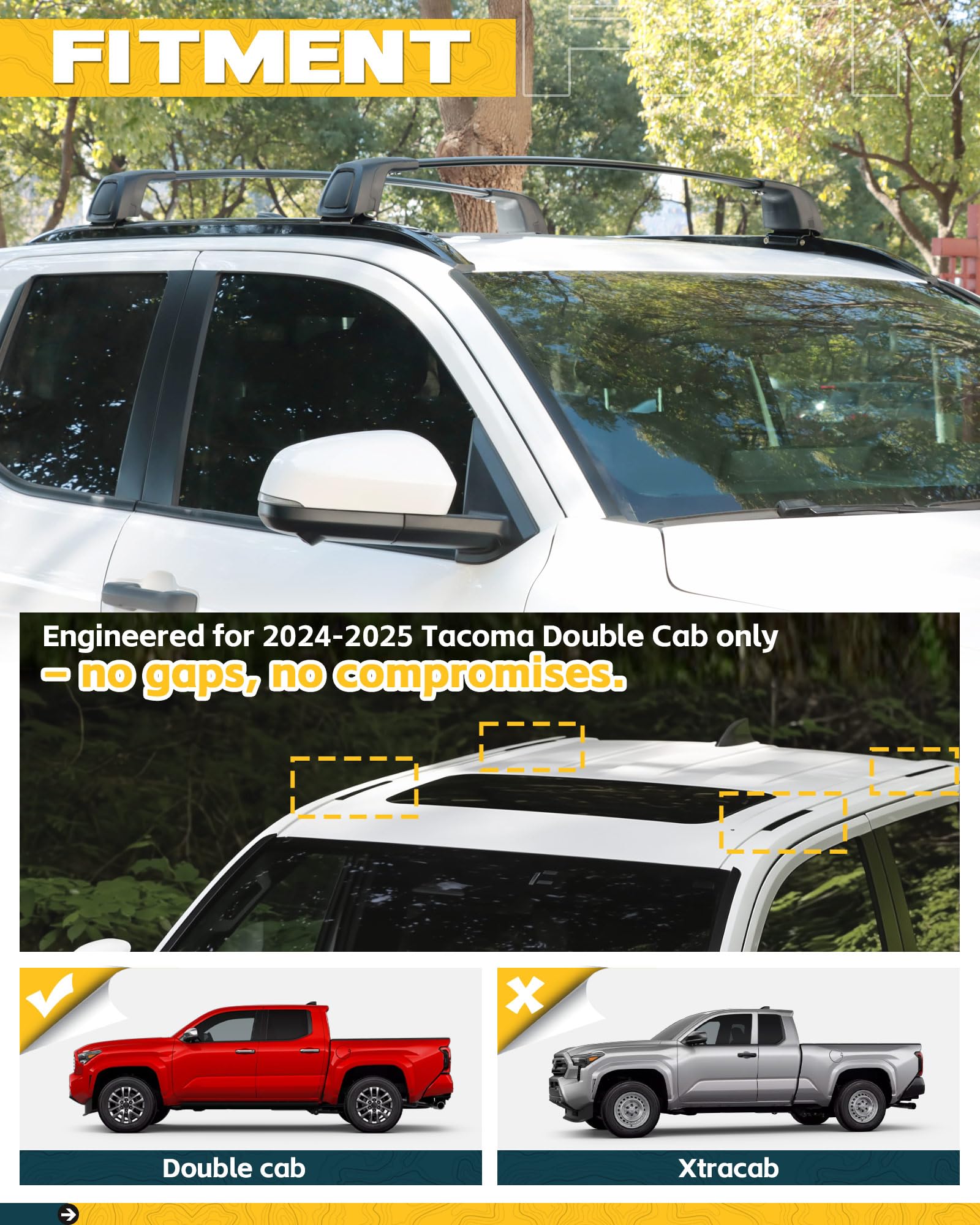 Perfect Fit: Trumgeta Roof Rack Cross Bars Specifically designed to fit for 2024 2025 2026+ 4th Gen Toyota Tacoma Double Cab.Includes SR/SR5/TRD Sport/TRD Off-Road/TRD Sport i-FORCE MAX/TRD Off-Road i-FORCE/Limited/Limited i-FORCE MAX/Trailhunter/TRD Pro. Not fit for SR Xtracab, SR5 Xtracab, TRD PreRunner