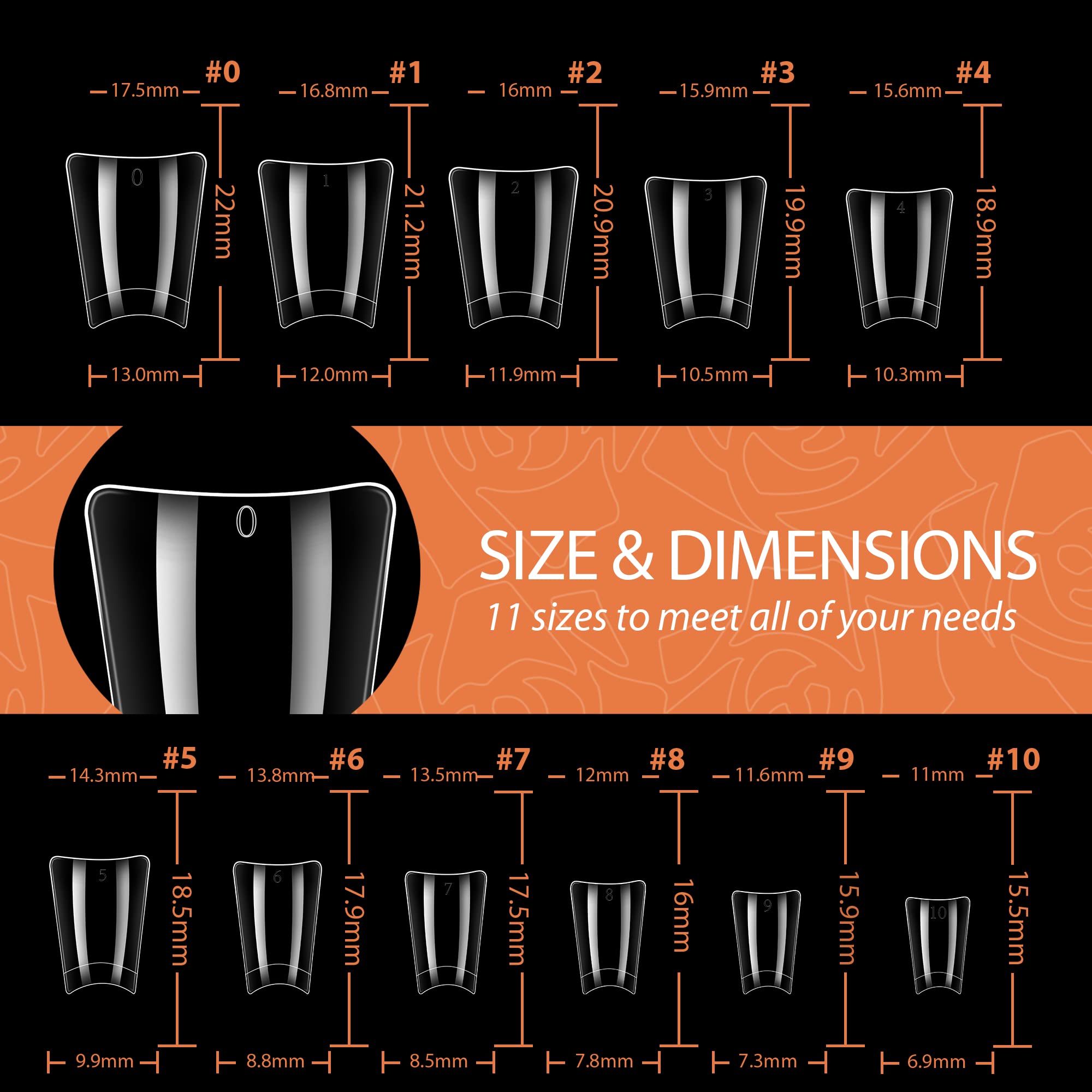 【Various Sizes Options】This false nail tips comes with 504 pieces,11 different sizes, each with pre-numbered tips for easy and quick identification during use. Additionally, it includes a sturdy and well-organized storage box to ensure that all tips are neatly stored and avoid any confusion. Whether you're a professional nail artist or a DIY enthusiast, these duck nails are an ideal choice for unleashing your imagination.