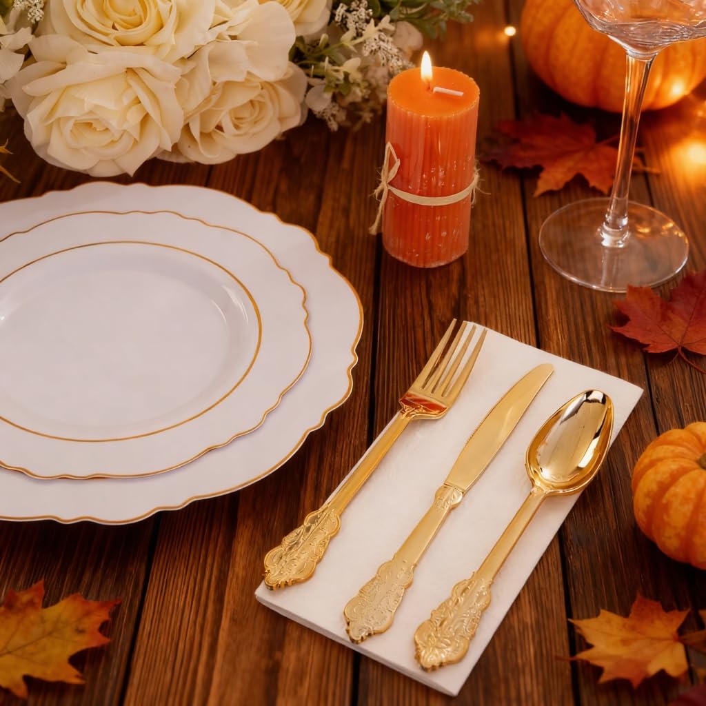 PREMIUM QUALITY: 100% food grade, non-toxic, BPA-free plastic! Those gold plastic silverware are safe you and your guests. Solid, durable, heavy duty cutlery ensure won't scratch or break easily.