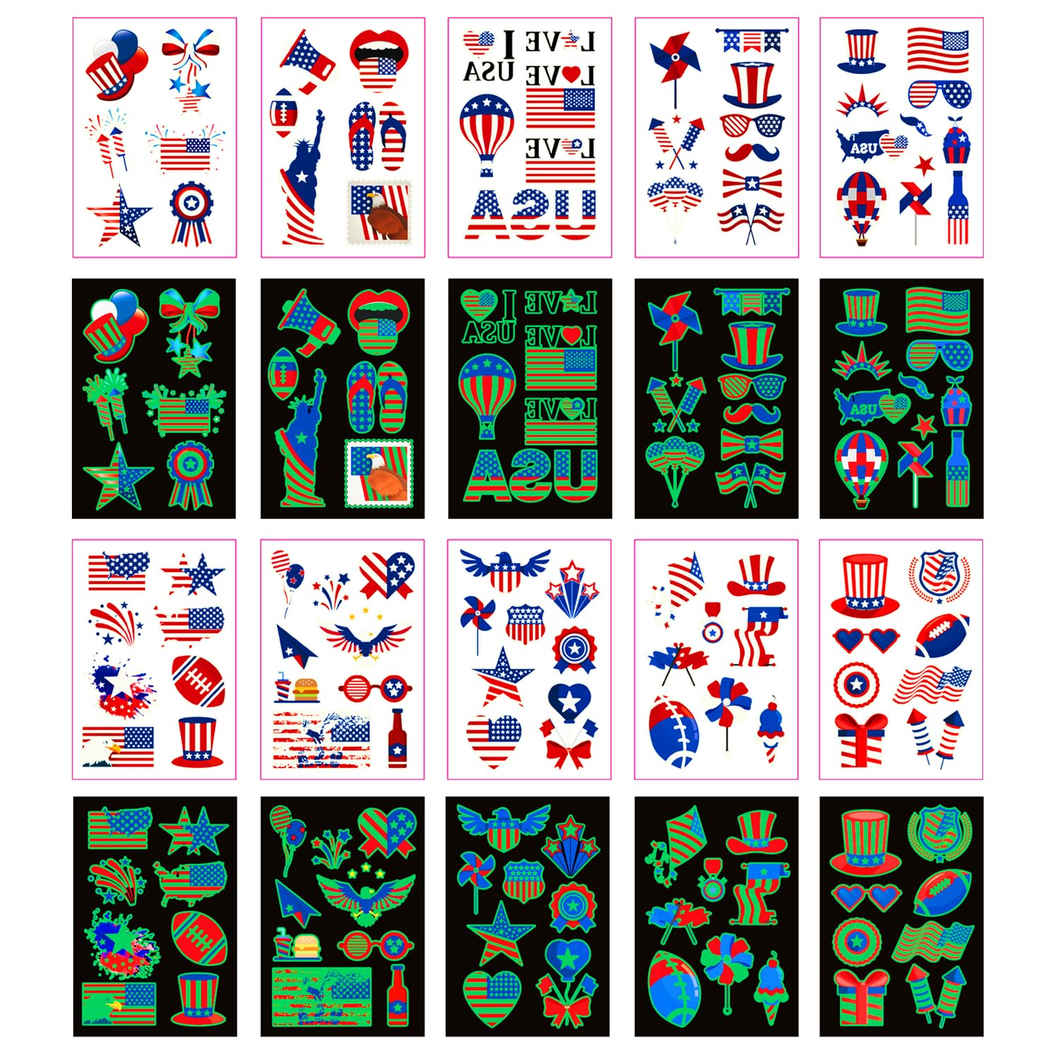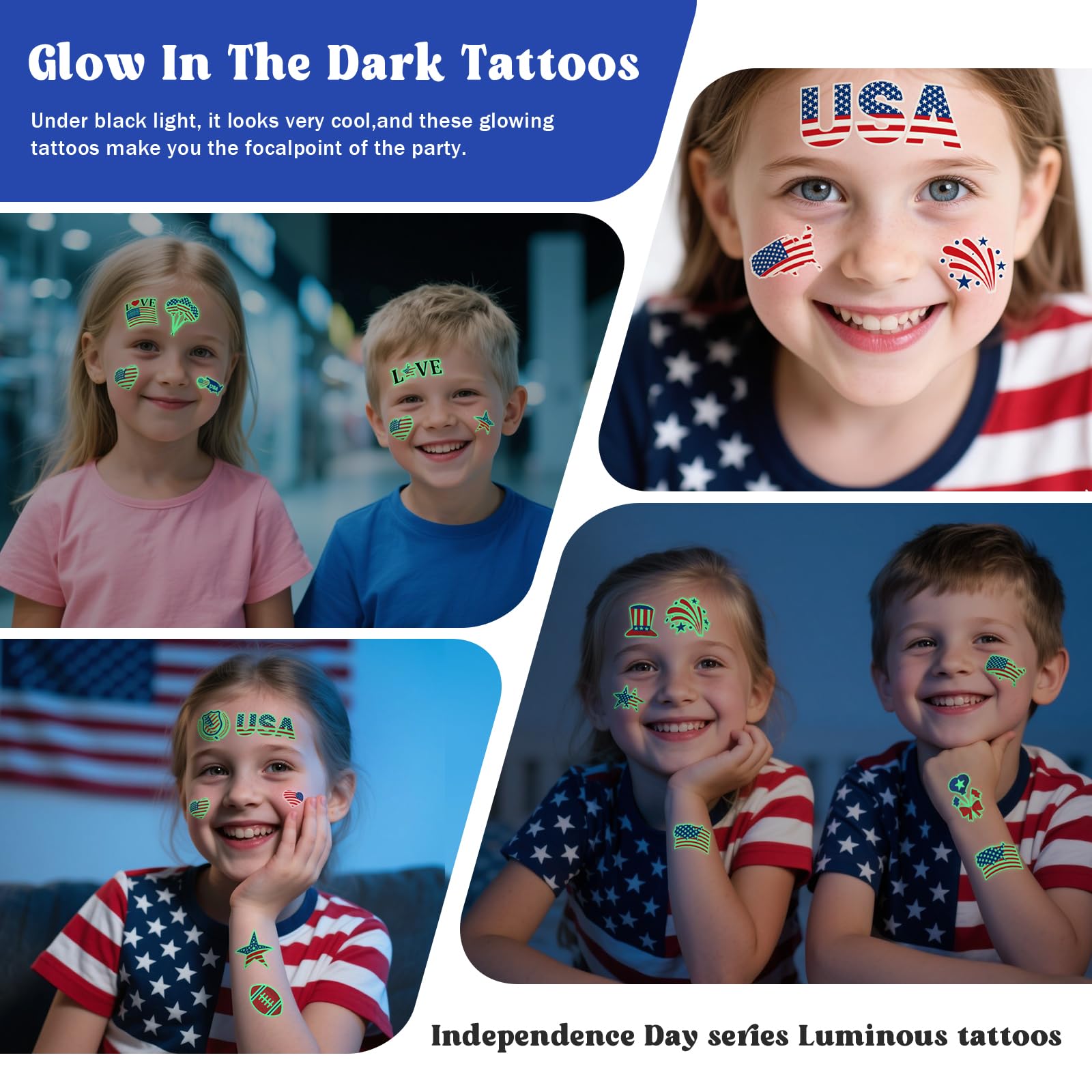 Glow 4th of July Tattoos for Party Decorations - 4.72*2.95 inches 10 pieces 80 PCS Luminous Fourth of July temporary Tattoos