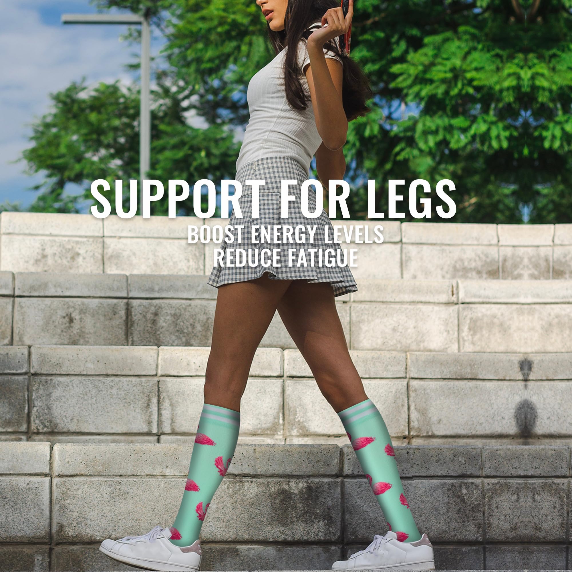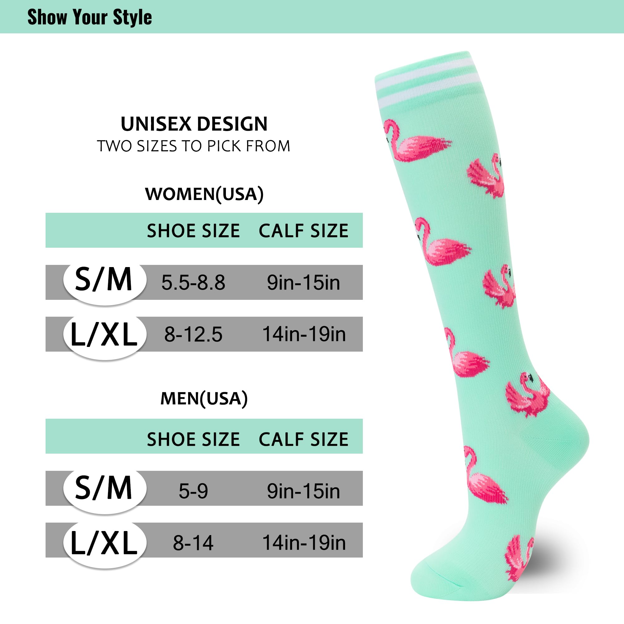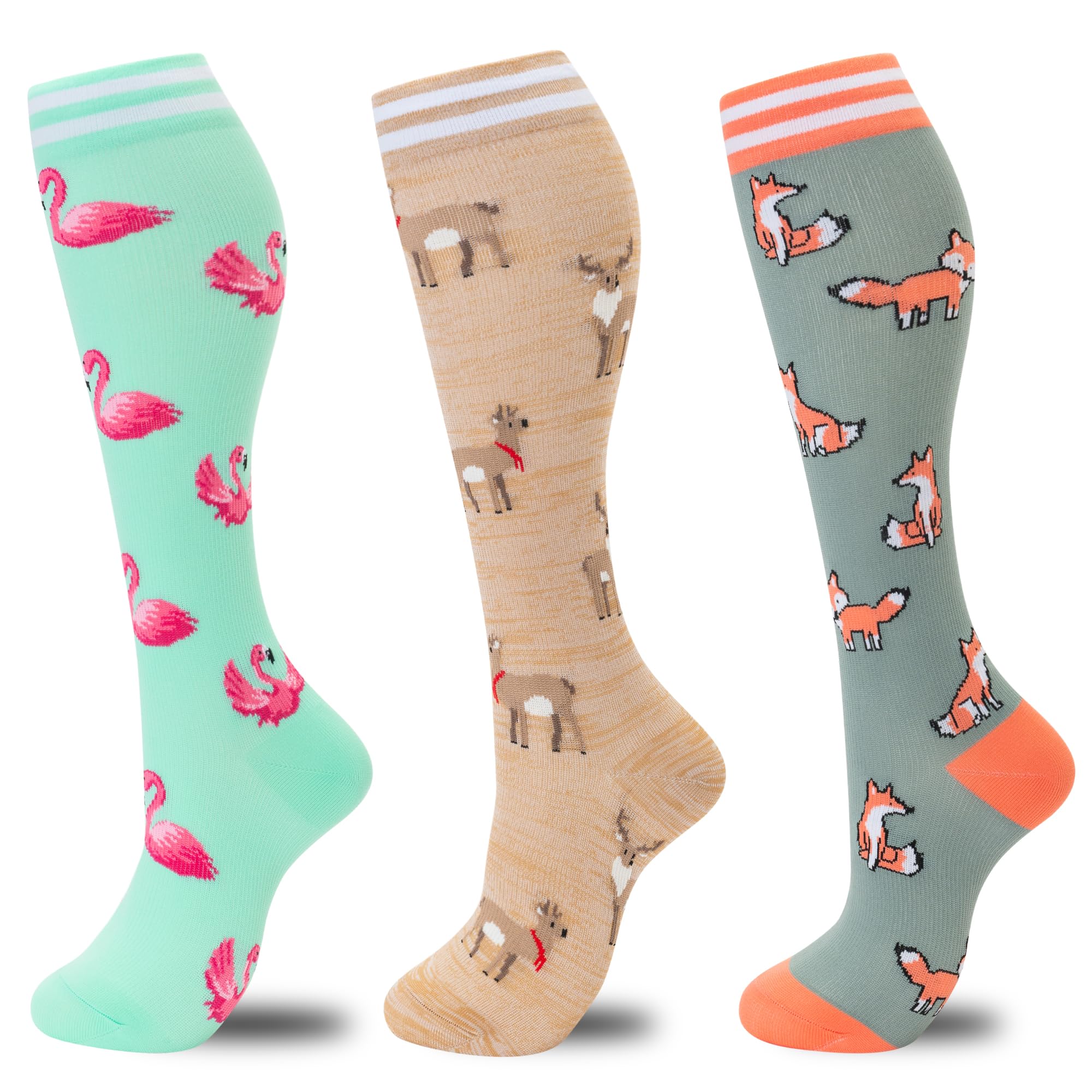 STYLISH COMFORT DESIGN We have prepared compression stockings for women with different cute animal prints for you. Brightly colored compression socks are with a unique pattern and reinforced toe and heel sections for added support and comfort. Just pick your favorite from these fun compression socks to show your personality and style