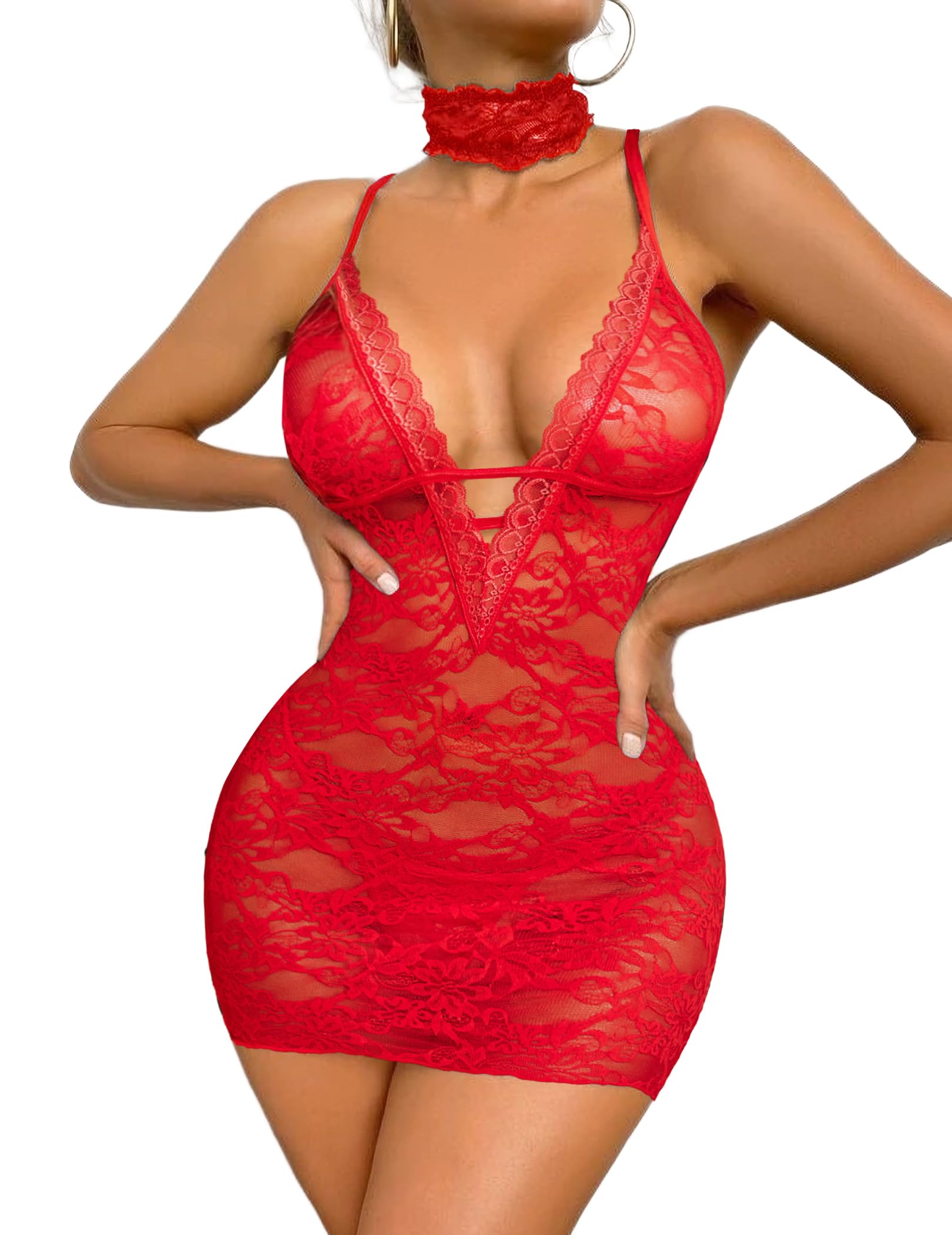 Women chemise lingerie dress with G-string and lace choker​ features halter deep v neck, front cut-out design, and floral lace patchwork with sheer mesh
