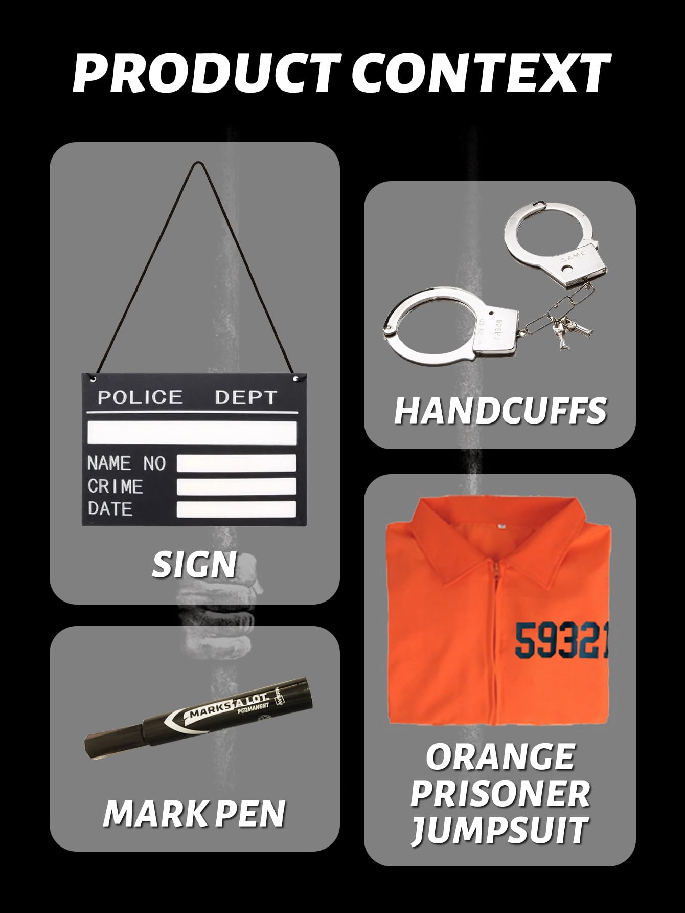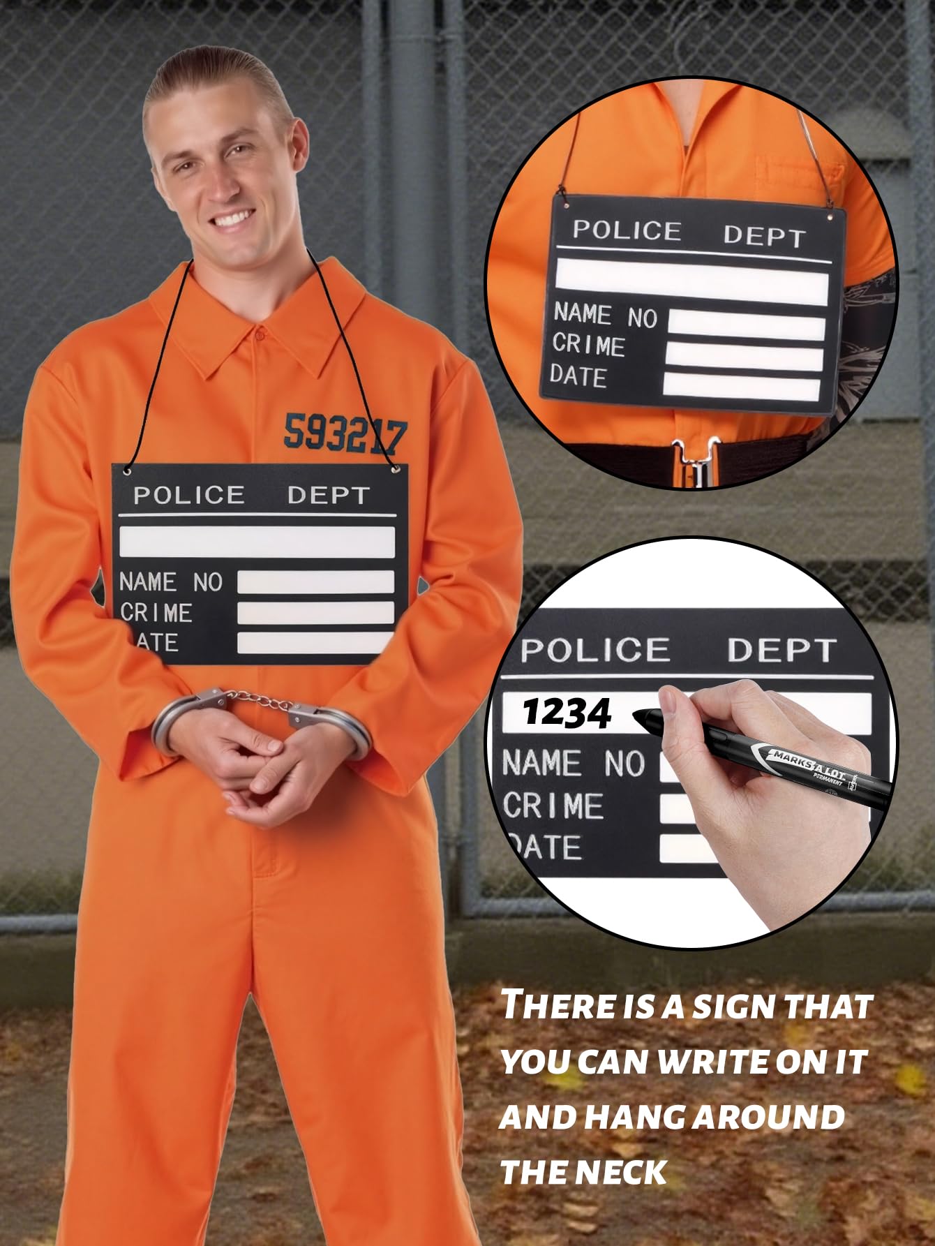 Complete Prisoner Costume Set: Includes 1 prisoner jumpsuit,1 pair of handcuffs, 1 pen ,1 nameplates. Numbered words printed on the front for a more complete and realistic depiction of prisoner role play