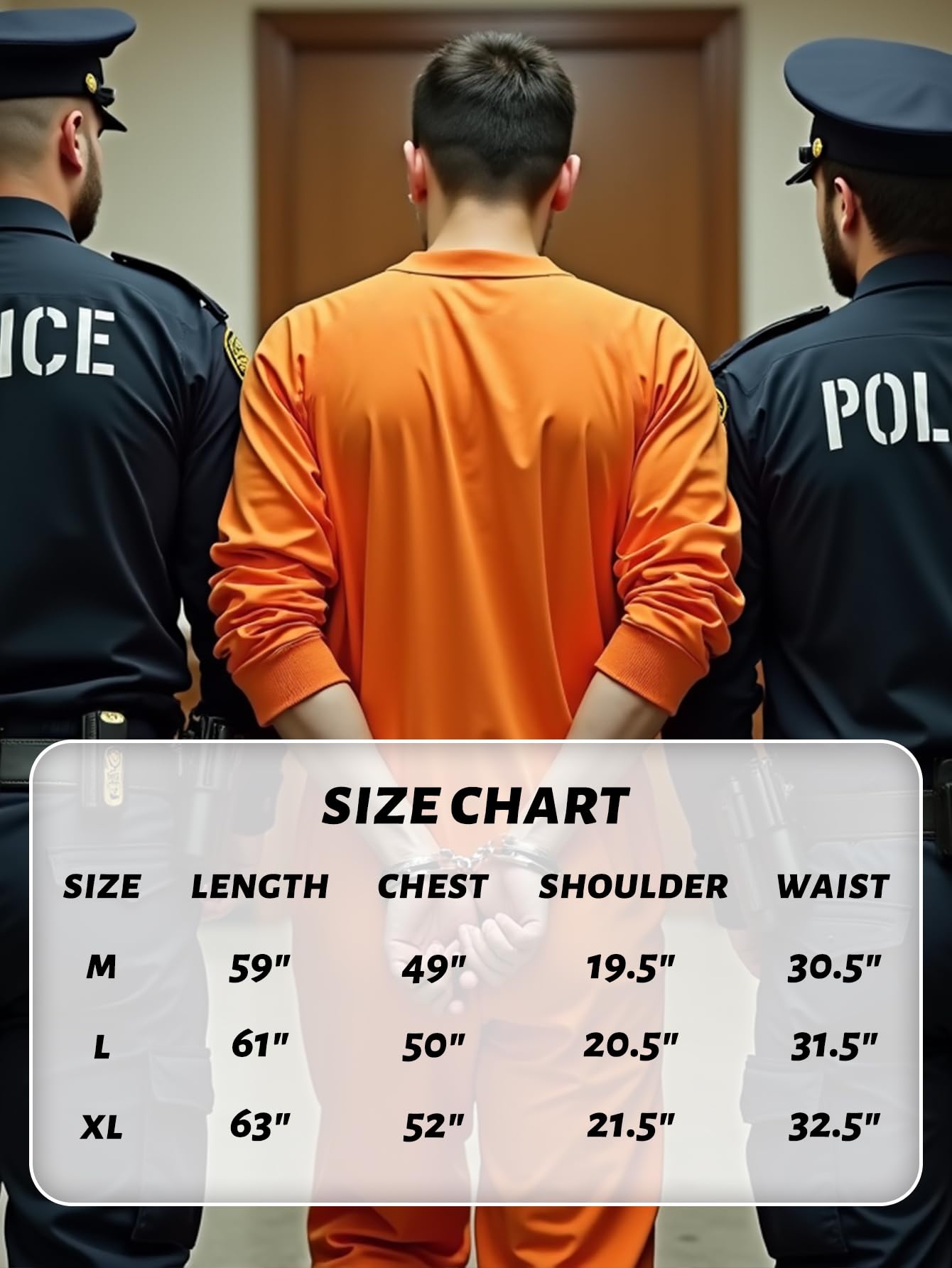 Size: Our prisoner costume comes in three sizes, from M to XL, suitable for most heights and body types. For more detailed size information, please refer to the size chart image.