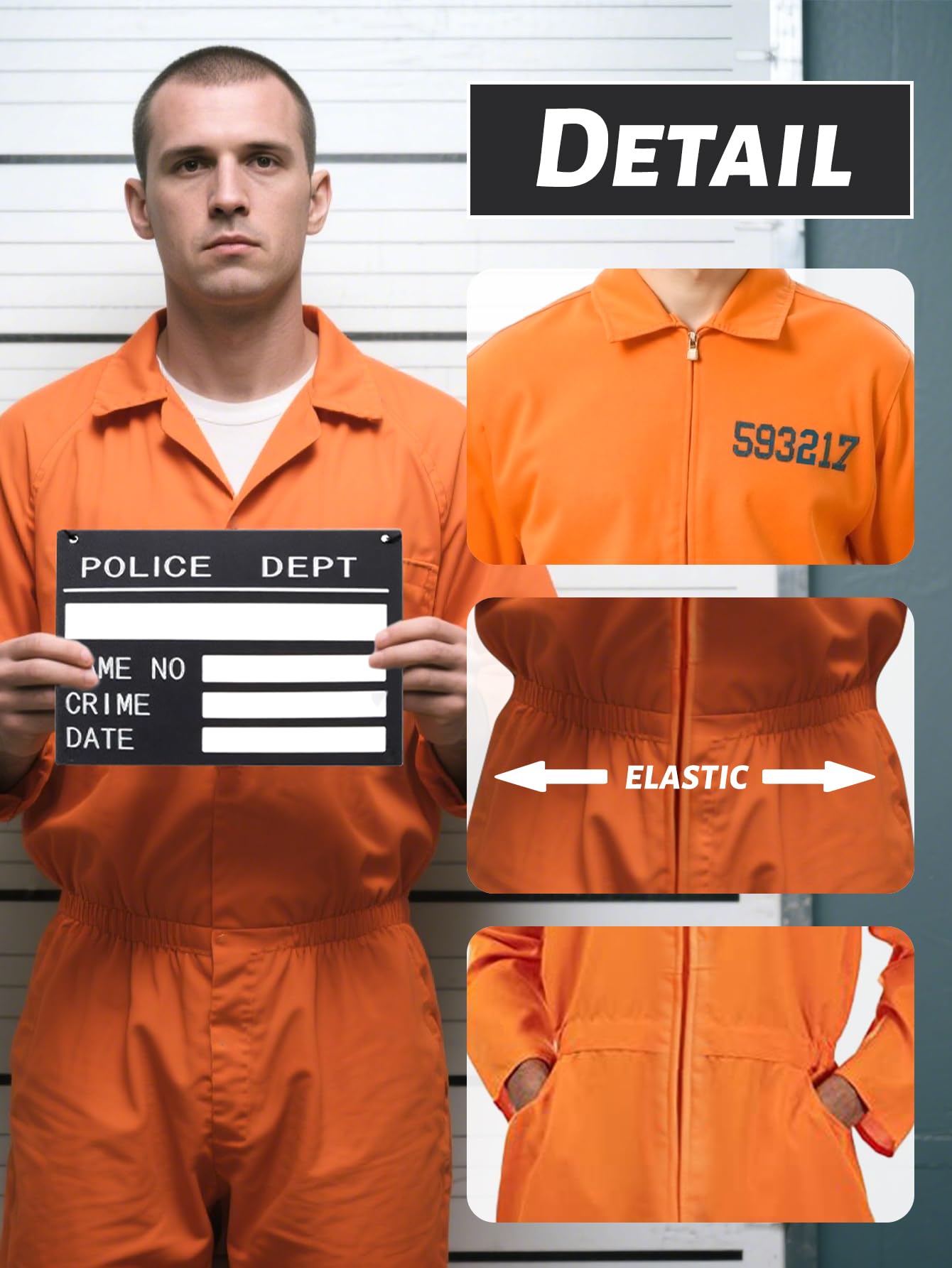 Classic Orange Prisoner Look: This orange jumpsuit features a realistic prisoner design with a printed inmate number on the chest, capturing every detail. The front zipper closure allows for easy on and off, while the elastic waistband ensures a comfortable and better-fitting wear.