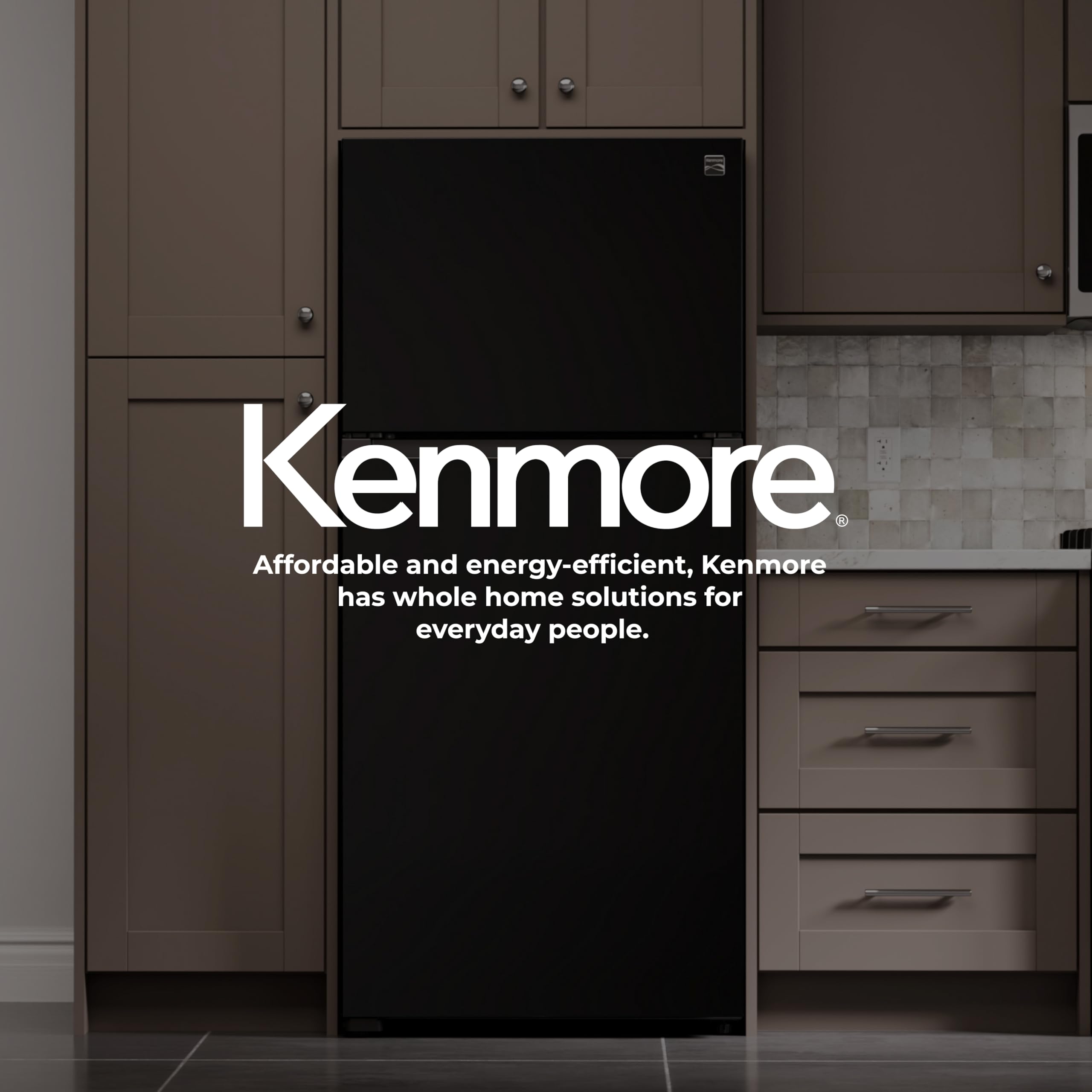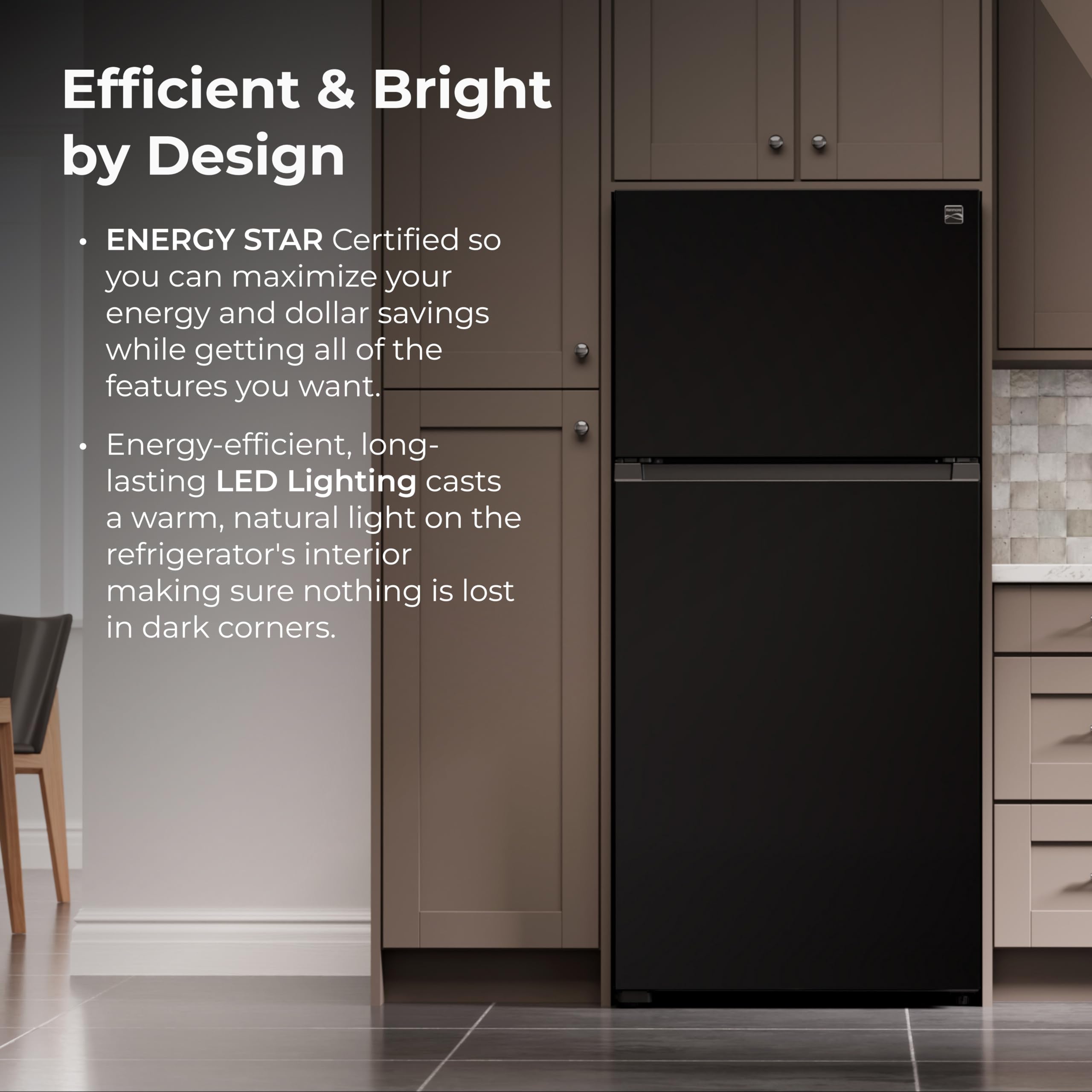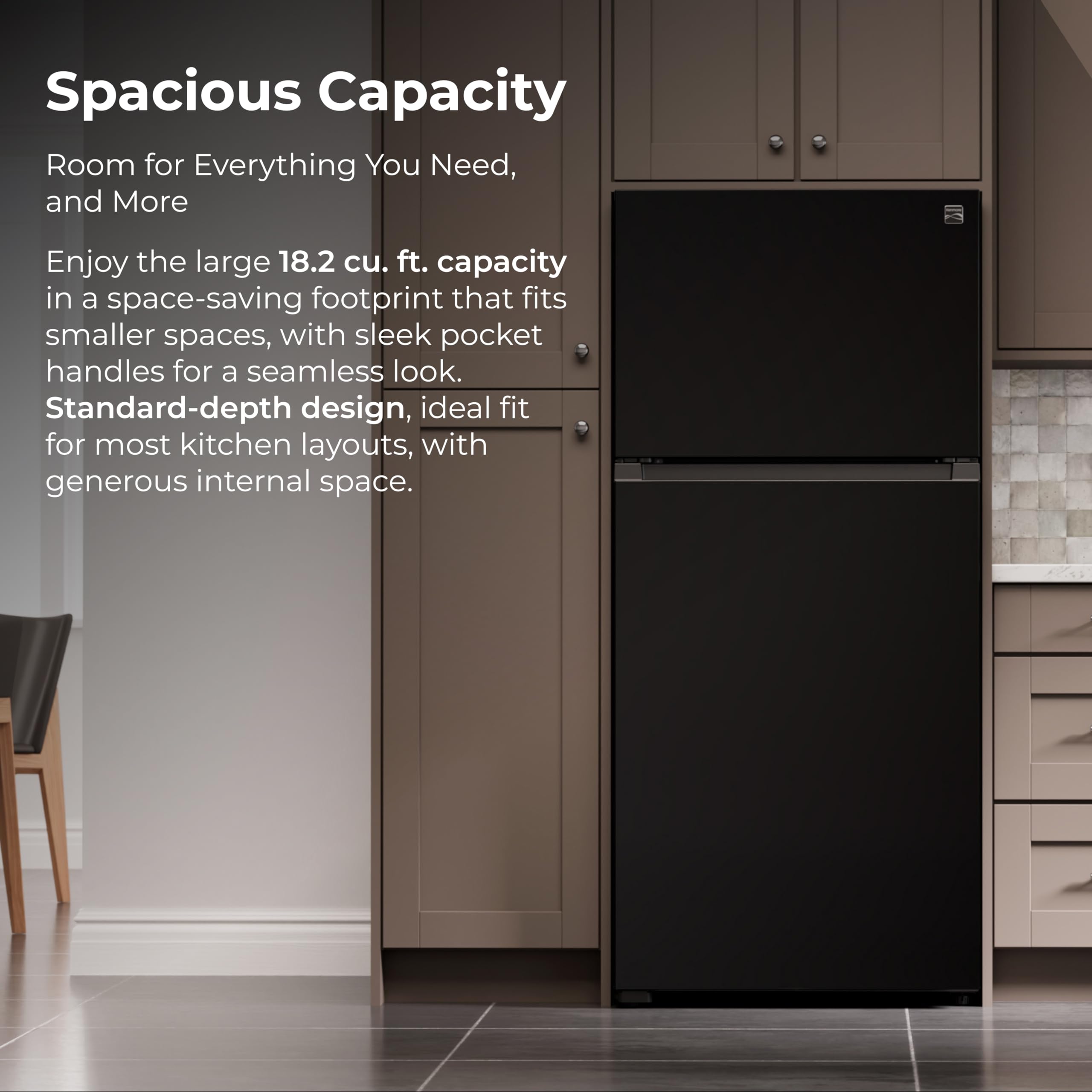 Make the most of your kitchen space with the Kenmore 30" Top-Freezer Refrigerator in Smooth Black. With 18.2 cu. ft. of capacity and a 30-inch-wide footprint, it fits smaller kitchens while still offering plenty of room for fresh and frozen essentials. The standard-depth design lets it stand proud while storing party trays, groceries, and everything in between. Full-width, adjustable glass shelves give you the flexibility to store wide or tall items with ease. Three clear door bins hold gallon jugs, condiments, and dressings, while two clear freezer door bins help keep smaller items organized. Humidity-controlled crispers keep produce fresher, longer, and the dedicated dairy compartment stores butter and spreads at just the right temperature. Long-lasting LED lighting casts natural light throughout the fridge so nothing gets lost in the back. The recessed pocket handle and flush-front design add a modern, easy-to-clean look that complements any kitchen style. ENERGY STAR certified for efficiency, and compatible with an optional icemaker that produces up to 3 pounds of crescent-shaped ice per day, this refrigerator is a smart, stylish solution for any home.