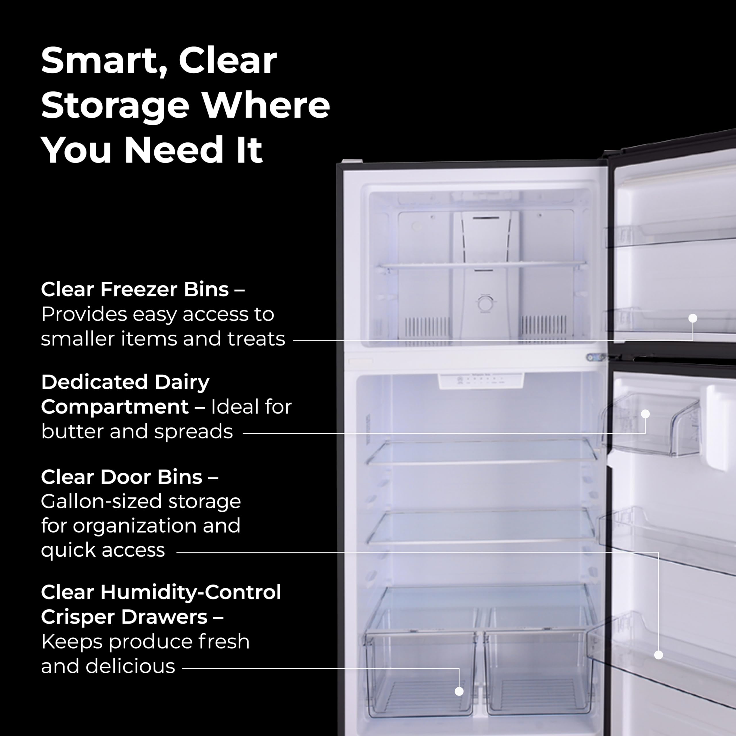 Humidity-Controlled Crispers and Dairy Drawer: Store produce in 2 clear humidity-controlled crispers to help it stay fresher longer. A covered dairy compartment keeps butter and spreads at the perfect temp