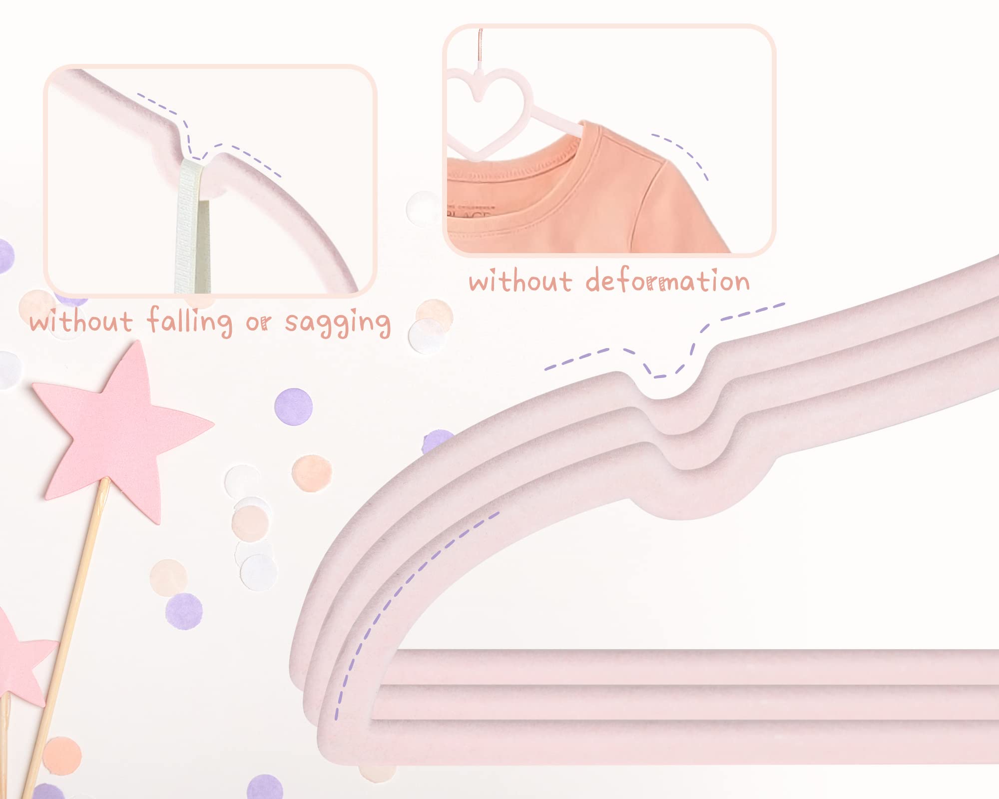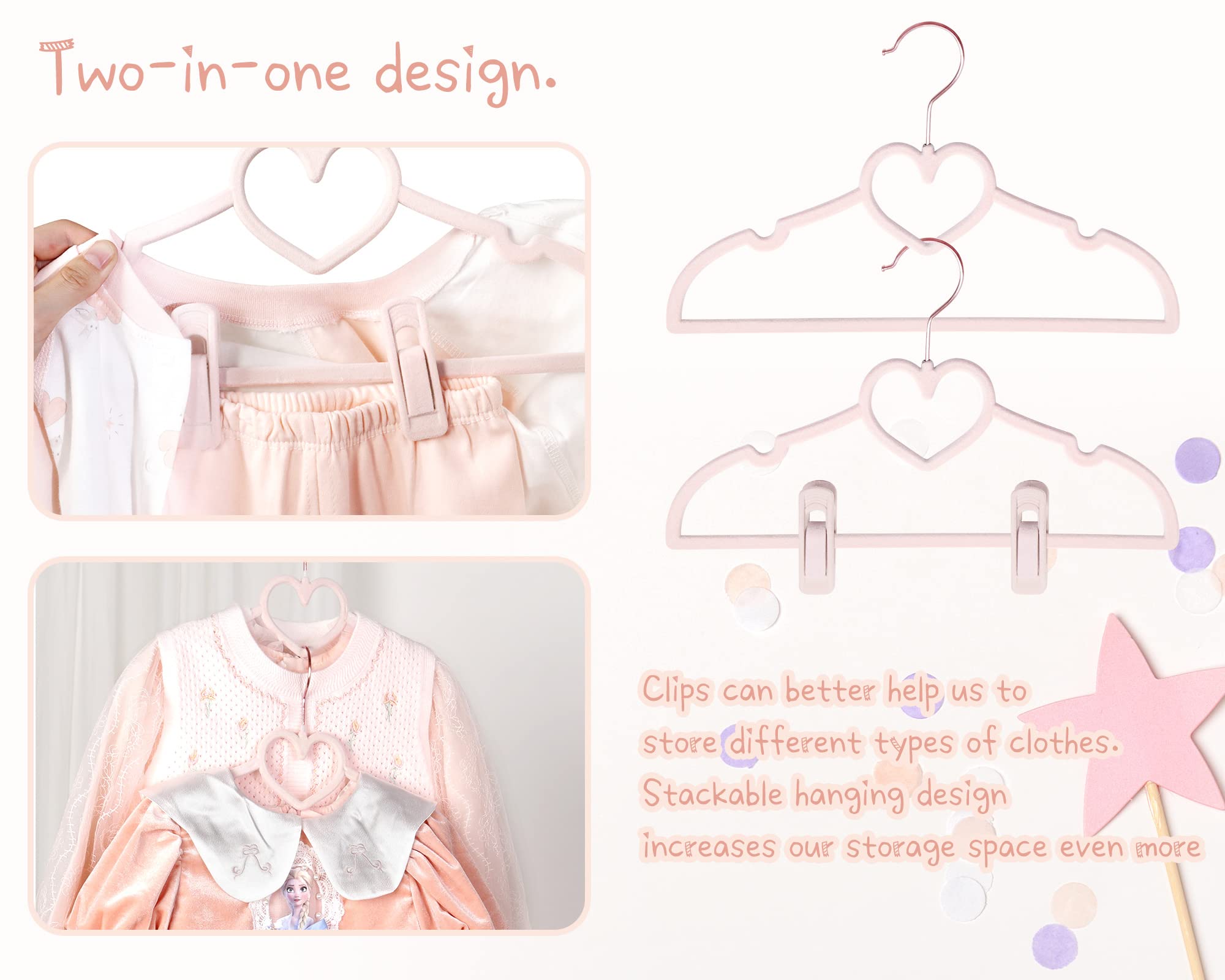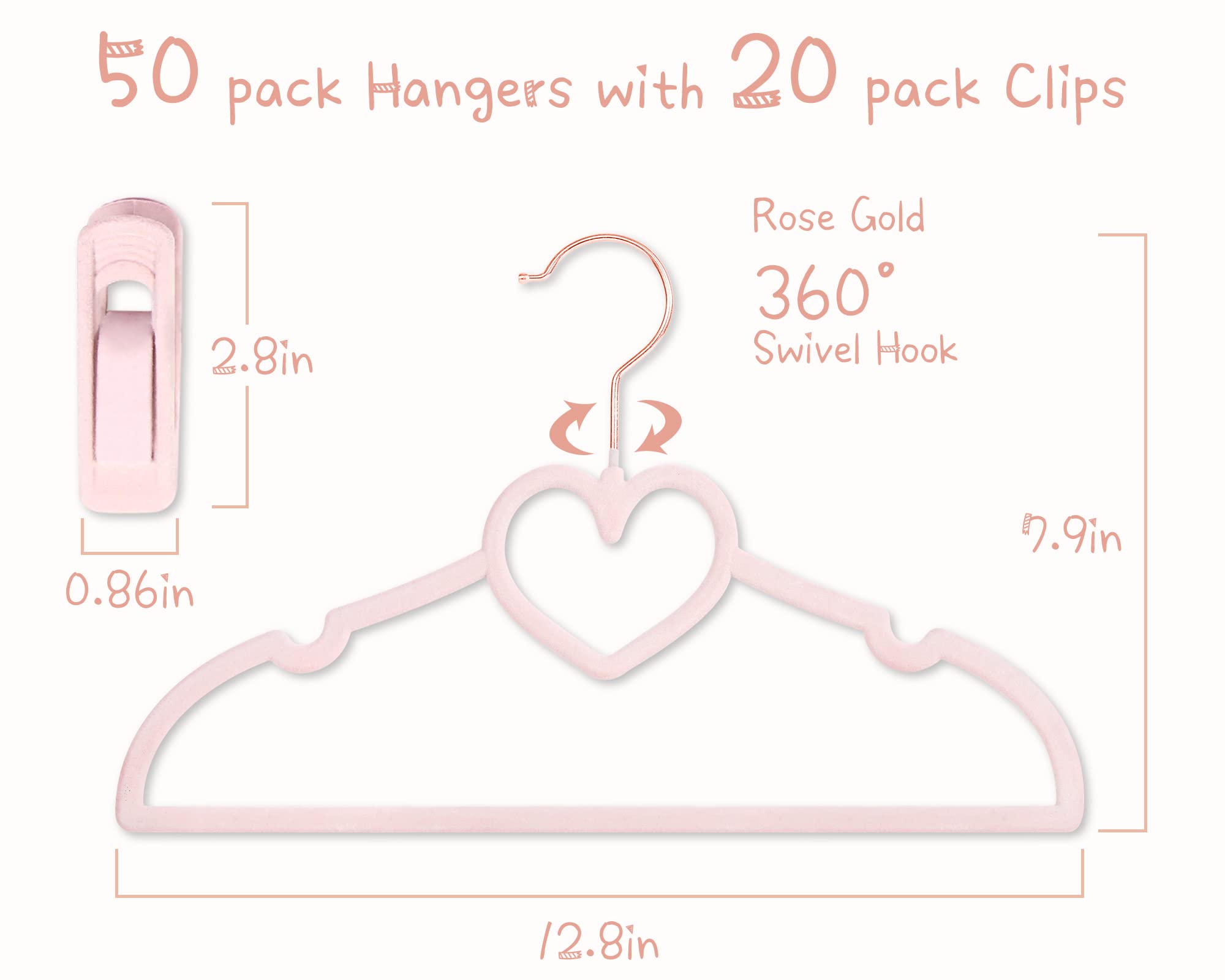 Size of Heart Baby Hanger: 13 inch * 7.5 inch * 0.18 inch 50 pack pink velvet hangers and 20pcs velvet clips. Hangers with clips use high quality ABS and Felt, make toddlers hanger strong and durable