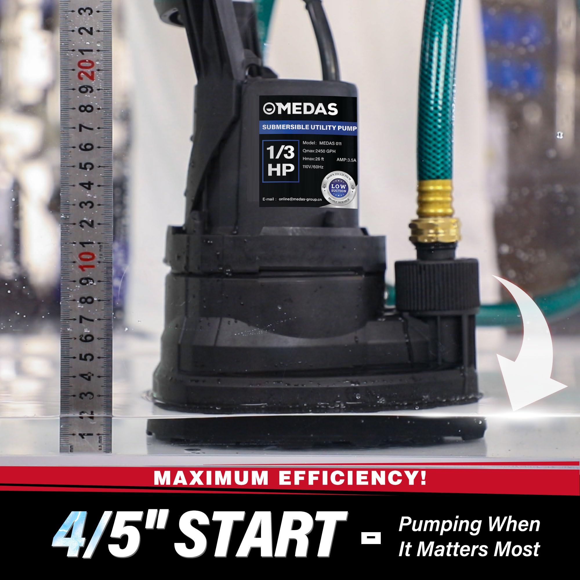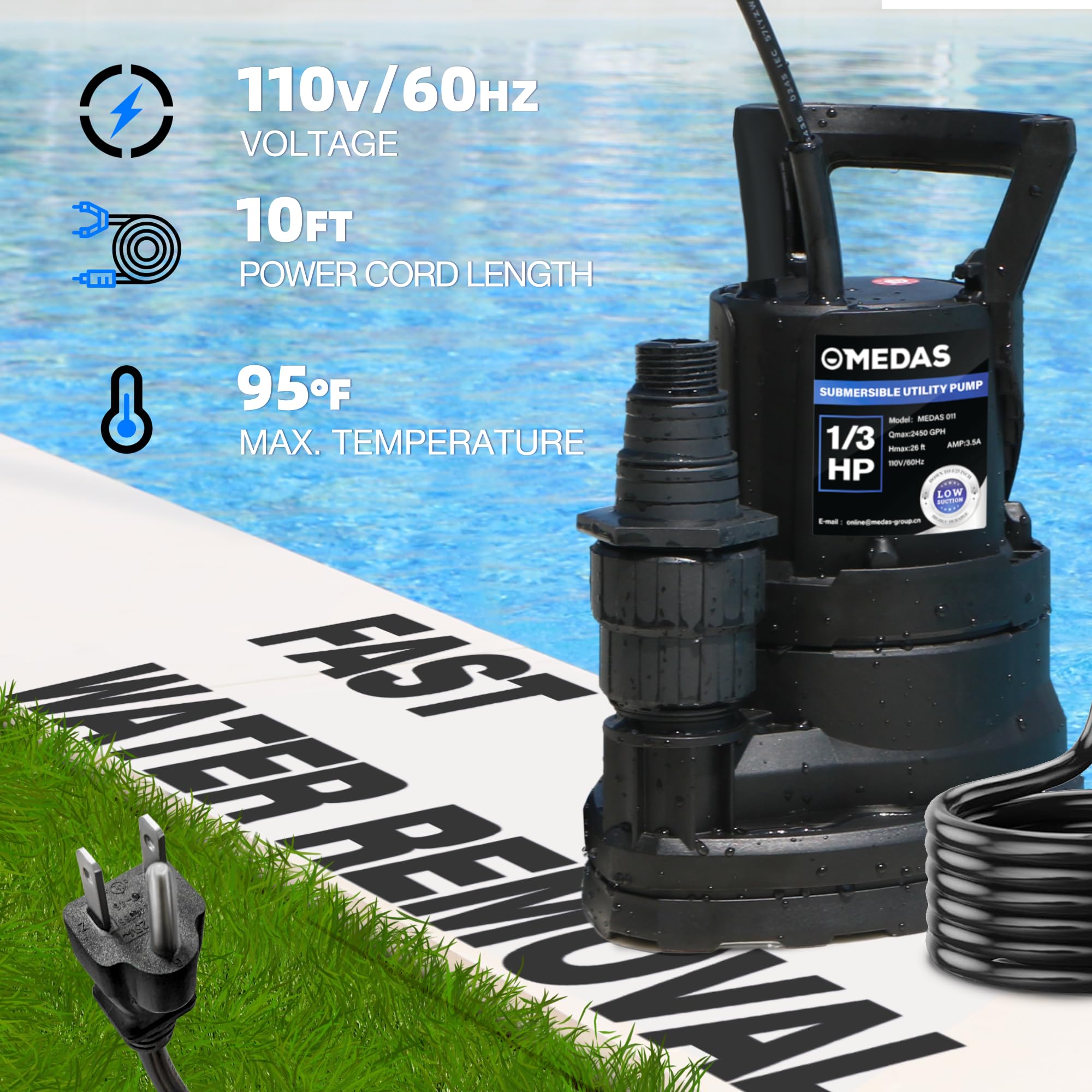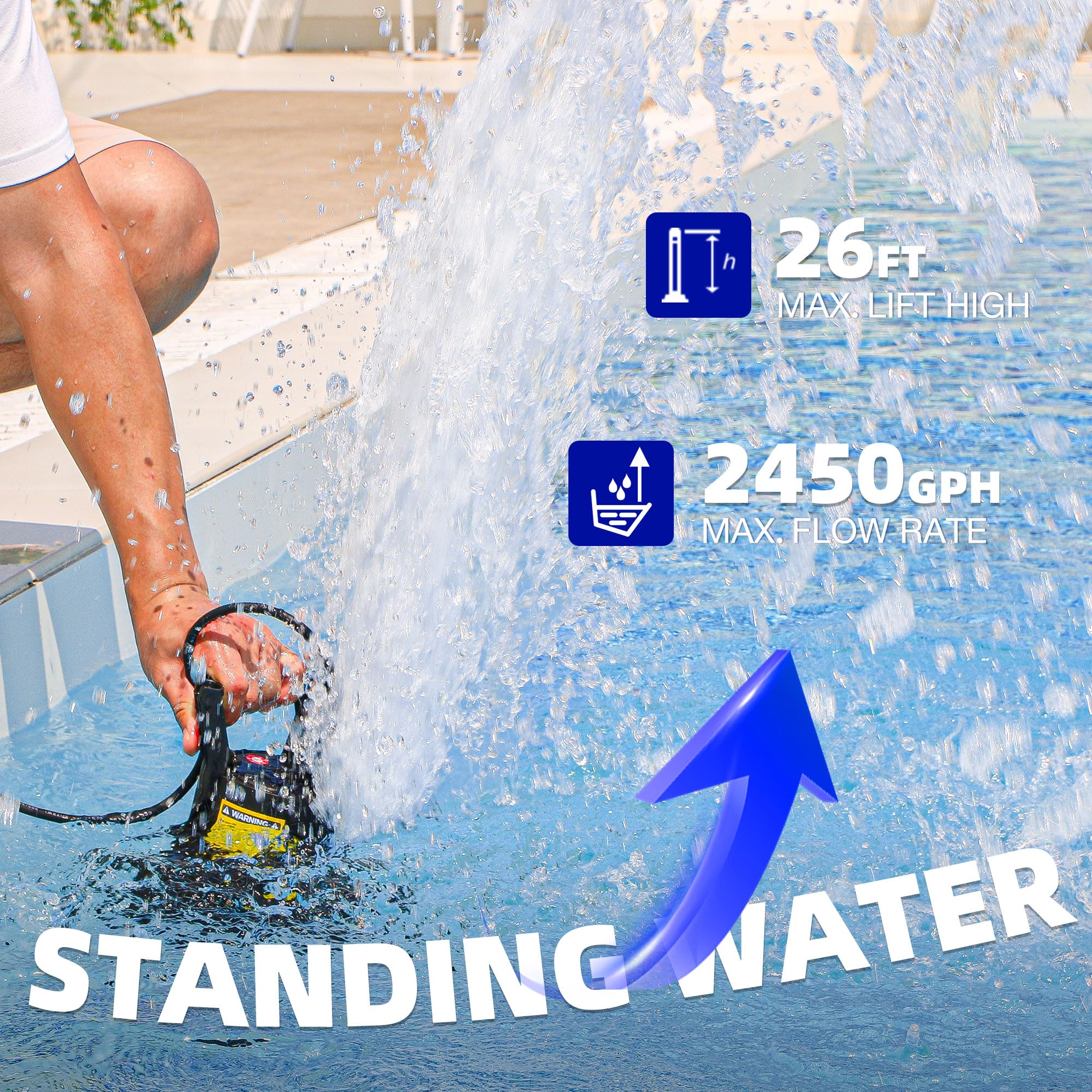 Powerful Water Flow:This 1/3HP high-flow utility pump moves up to 2450 gallons of water per hour, making it perfect for handling large volumes of water. Whether it's draining a pool, basement flooding, or other significant water sources, it quickly and efficiently removes water to prevent further damage.