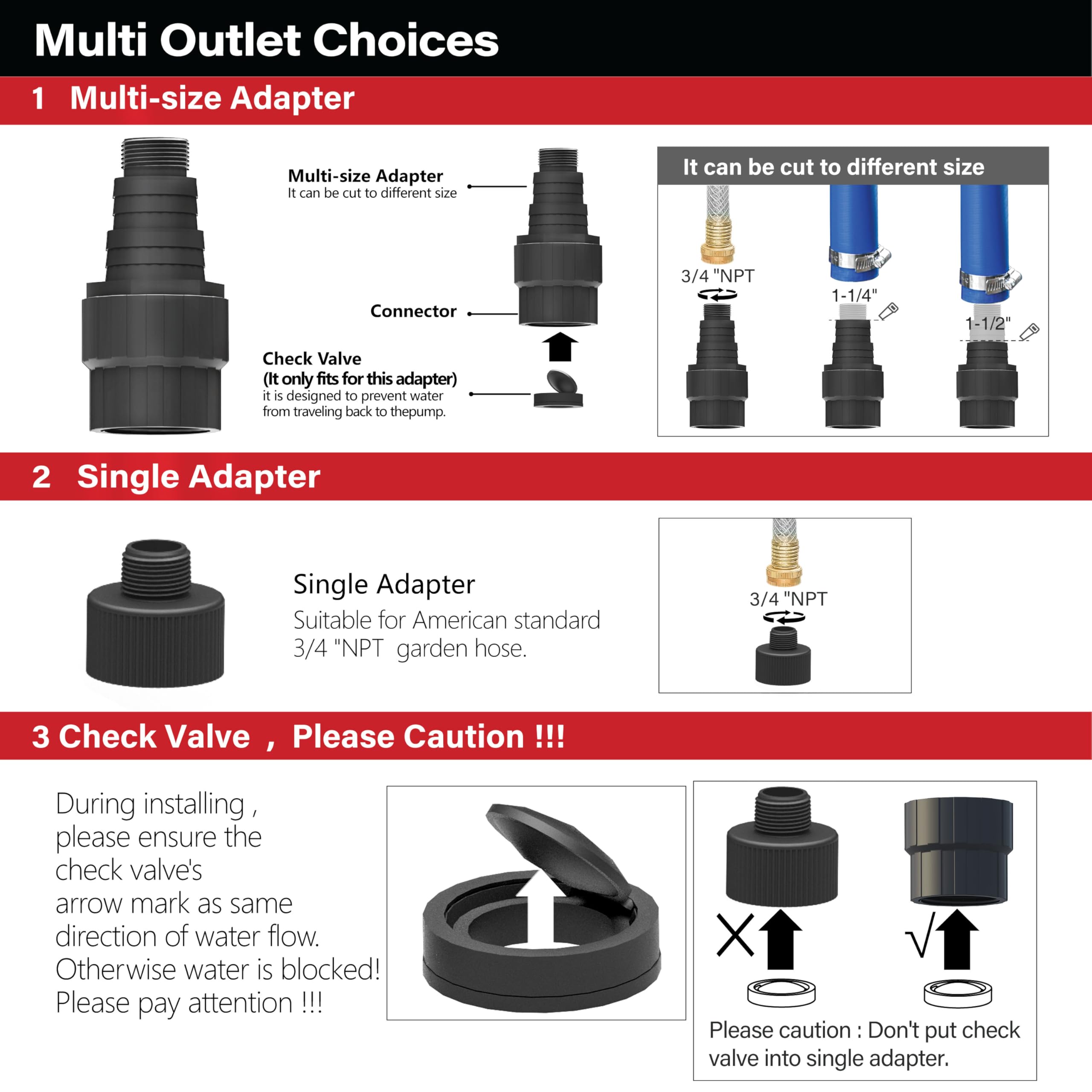 Complete Package Contents: This pump comes with everything you need for immediate use, including: the utility pump, a 3/4-inch NPT threaded adapter, a nylon mesh filter bag, a check valve to prevent backflow, and a multi-hose adapter compatible with 1-1/2-inch, 1-inch NPT, and 1-inch hoses. These accessories ensure quick setup and adaptability for diverse water removal tasks.