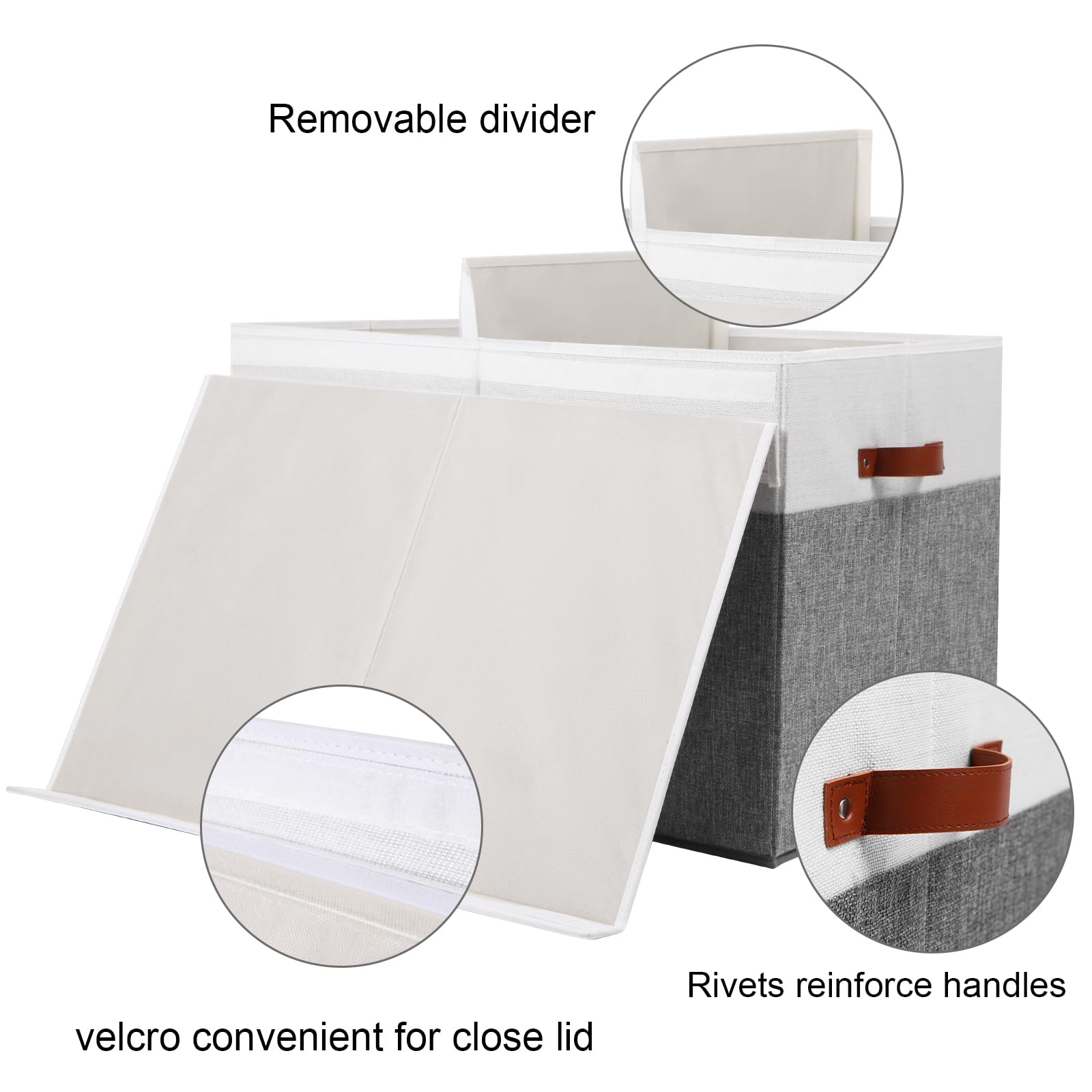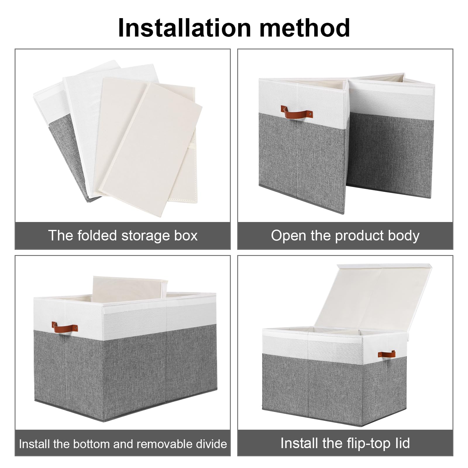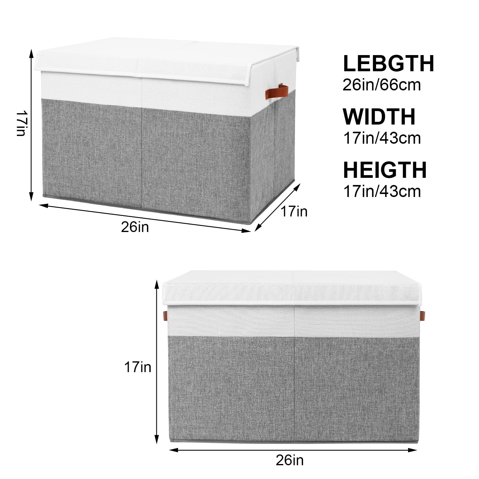 ADVANTAGES: Removable divider board : Great for organizing different items, you can detach the divider for store bigger things Flip-top lid : Keep your items away from dust, open the lid can also be used as an open box Rivets Reinforcement Handles : you can easily carry the large storage basket around your home Collapsible : When not in use, allowing you fold it flat, easy store or carrying Stackable : The toy boxes has a sturdy top, bottom and side, you can stack them SPECIFICATIONS: Color: Grey&white External material: Polyester linen Upholstery Material: Non-woven fabric Construction Material: Environmentally cardboard Product Size: 26"x17" x17" MULTI-PURPOSES: Closet clothes storage Bathroom sundry storage Shelf organizers Car / vehicle grocery containers Nursery toy storage Bedroom comforters, blankets storage Kitchen & pantry snacks and dry foods storage Office document storage Laundry room cleaning supplies storage ABOUT OUR SERVICES If for any reason you're not completely happy with your purchase, please reach out and we will resolve issues and ensure your contentment.
