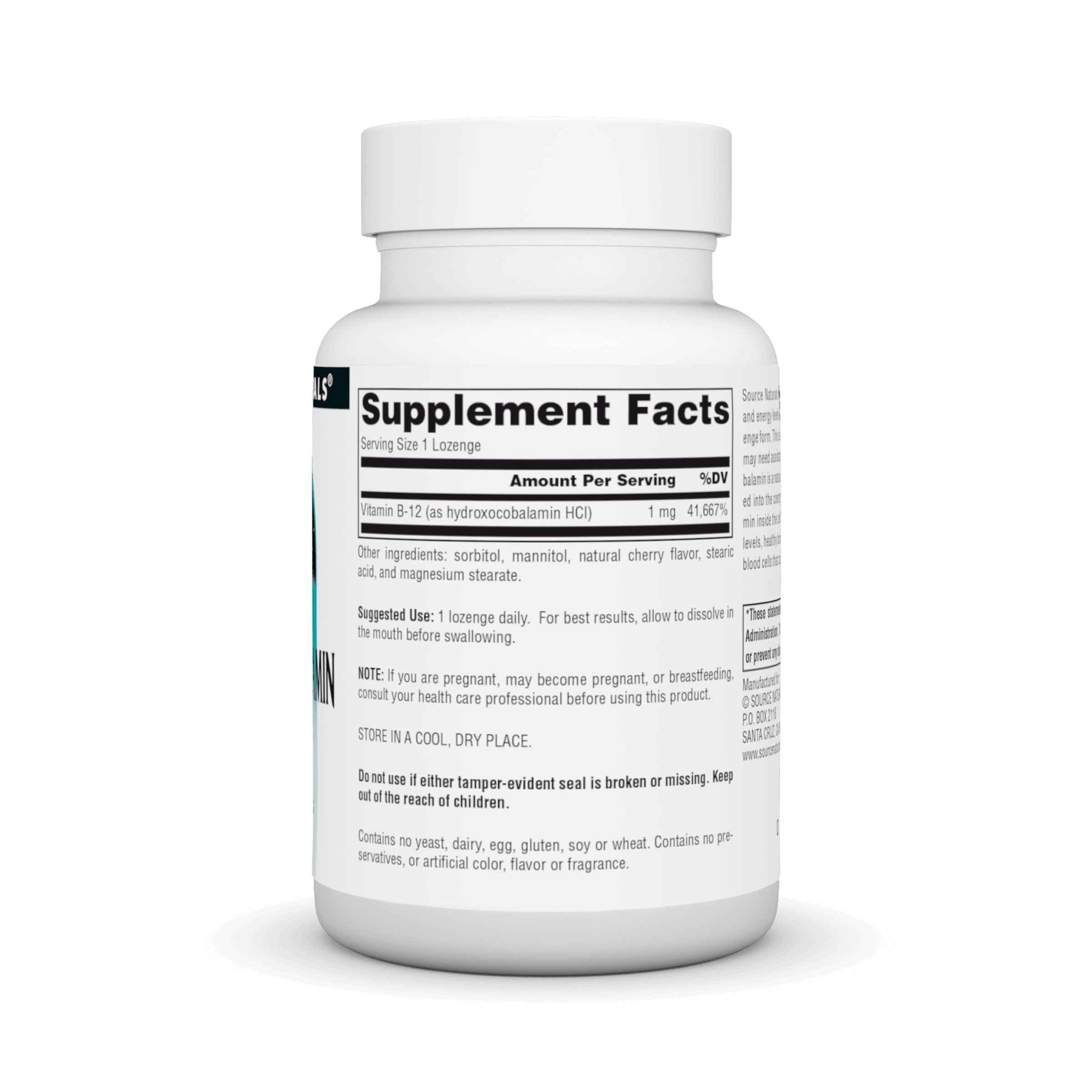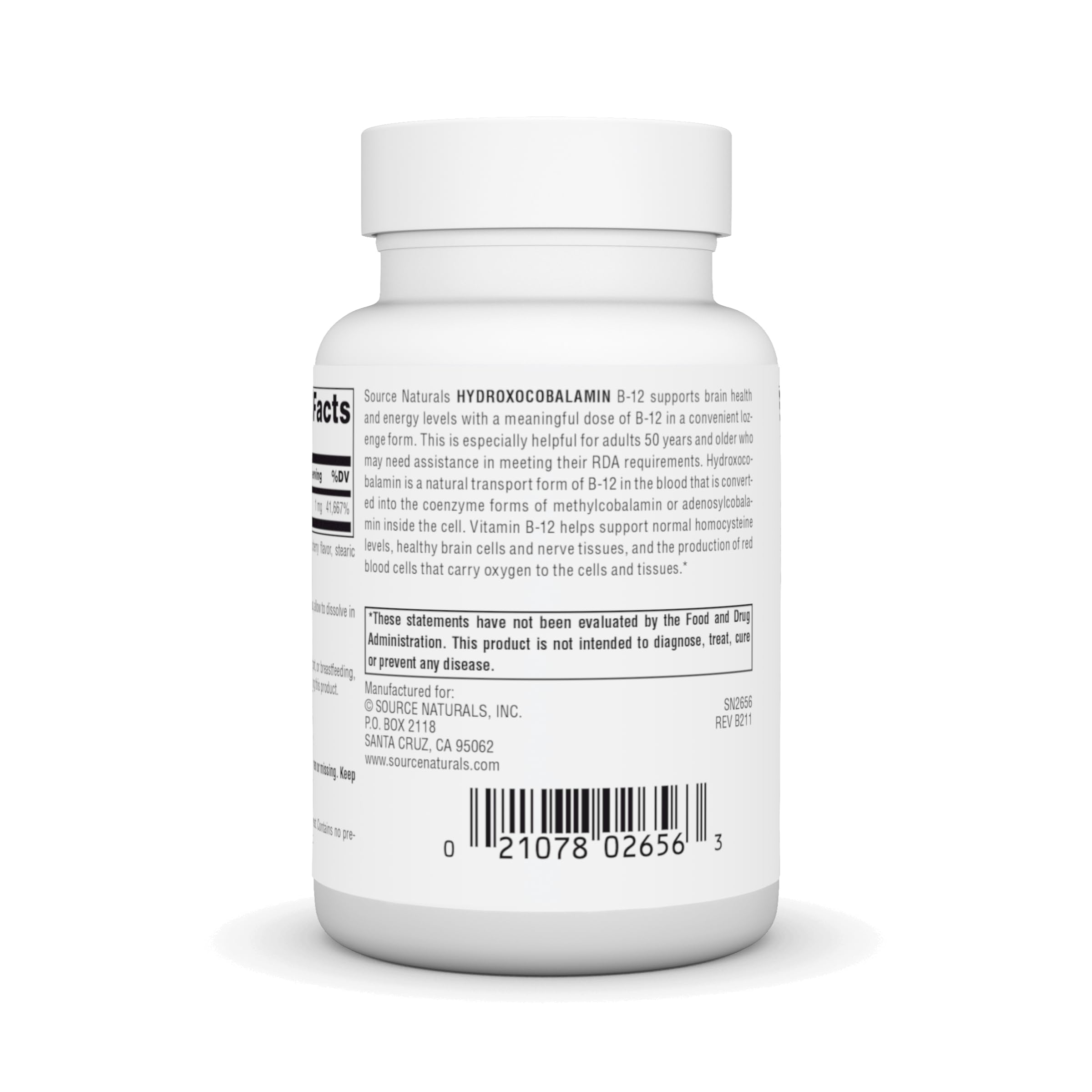 Source Naturals Hydroxocabalamin B-12 supports brain health and energy levels with a meaningful dose of B-12 in a convenient lozenge form. Hydroxocobalamin is the form of B-12 that is transported in the blood, before it is converted into the coenzyme forms of methylcobalamin or adenosylcobalamin inside the cell. Vitamin B-12 helps support normal homocysteine levels, healthy brain cells and nerve tissues, and the production of red blood cells that carry oxygen to the cells and tissues.