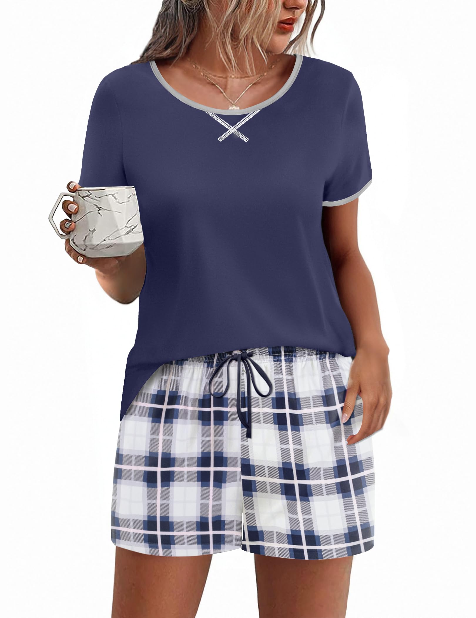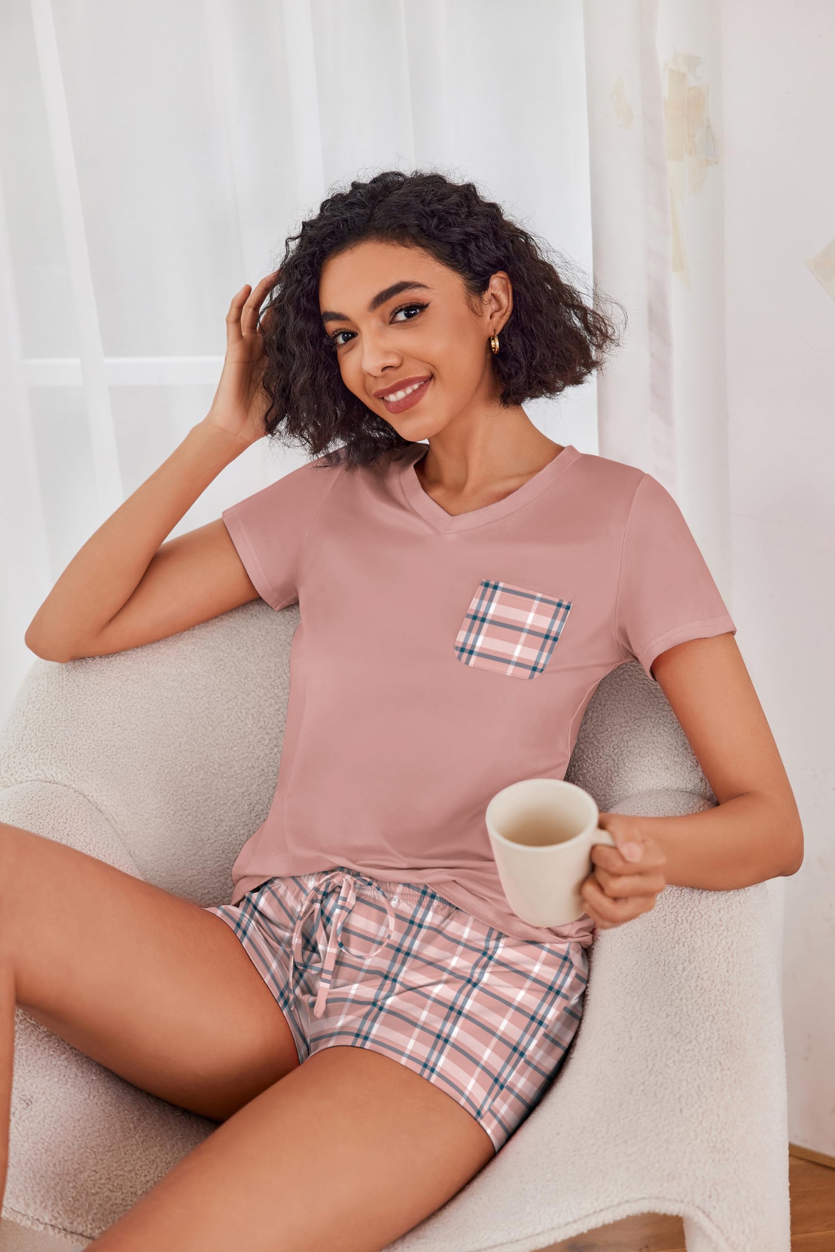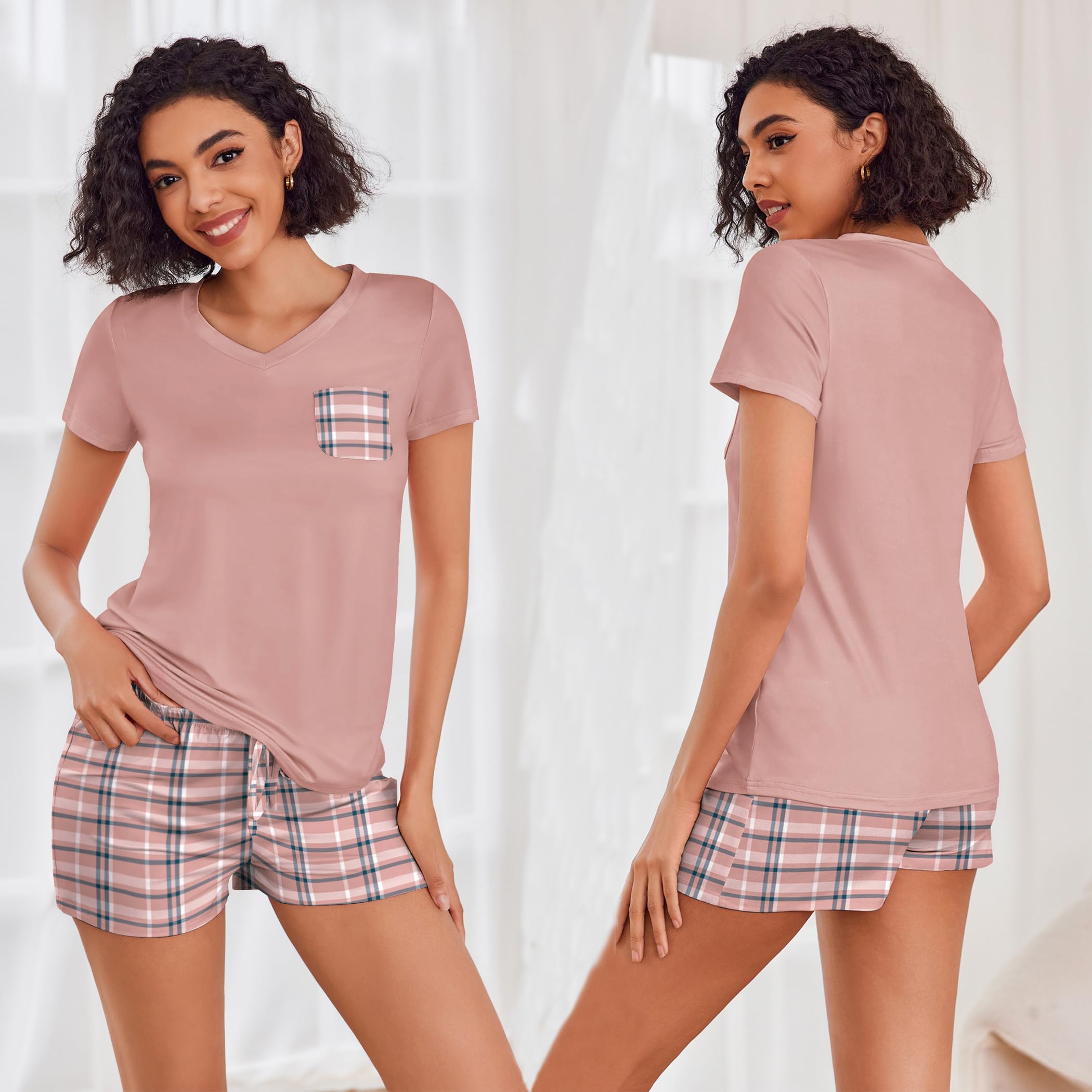 FEATURES: pajama sets for women 2 piece, pj sets for woman, V neck women's pajama sets, short sleeve T-shirt, drawstring elastic waist shorts.