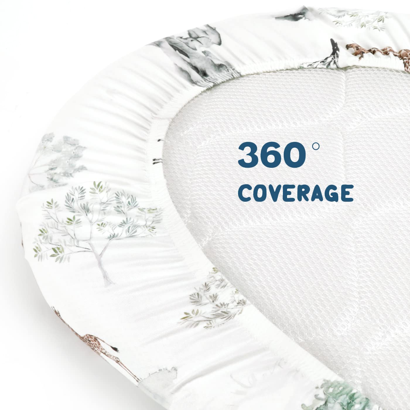 Universal Fit – Measuring 32" x 16" x 5". Our bassinet sheets fit almost all standard oval, round, rectangle, hourglass shaped bassinet mattress. Each bassinet mattress pad cover comes with an elastic band encased at the bottom for safety.