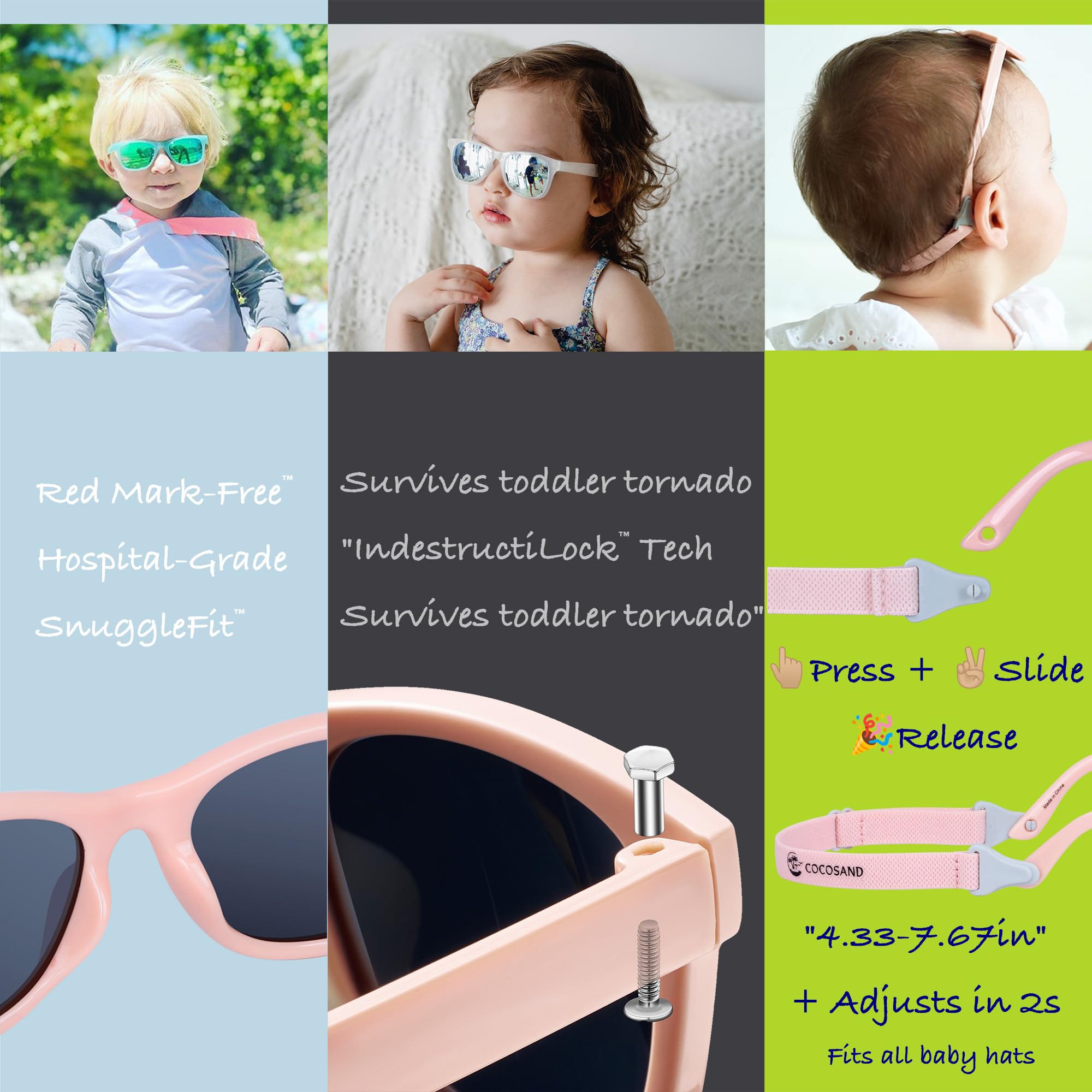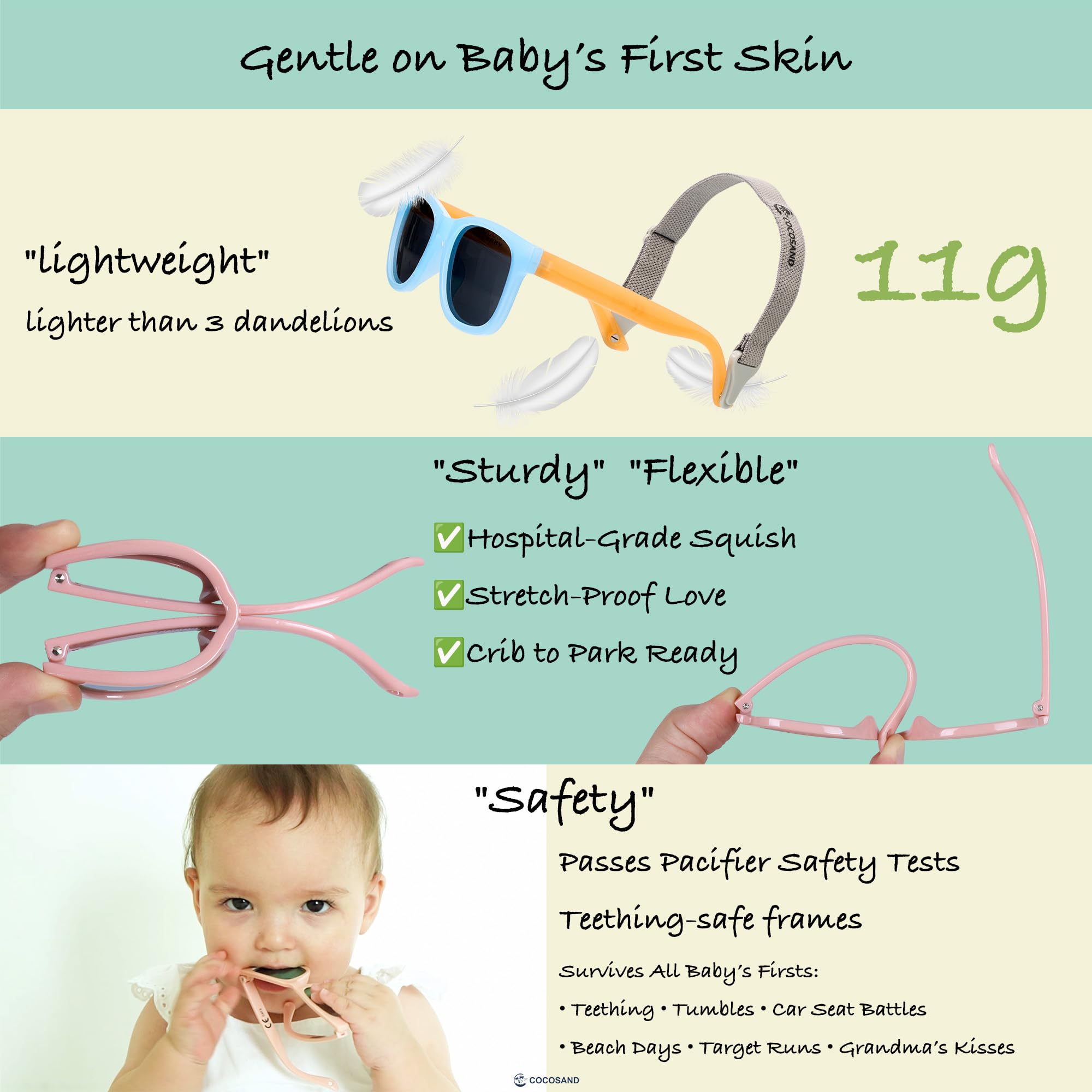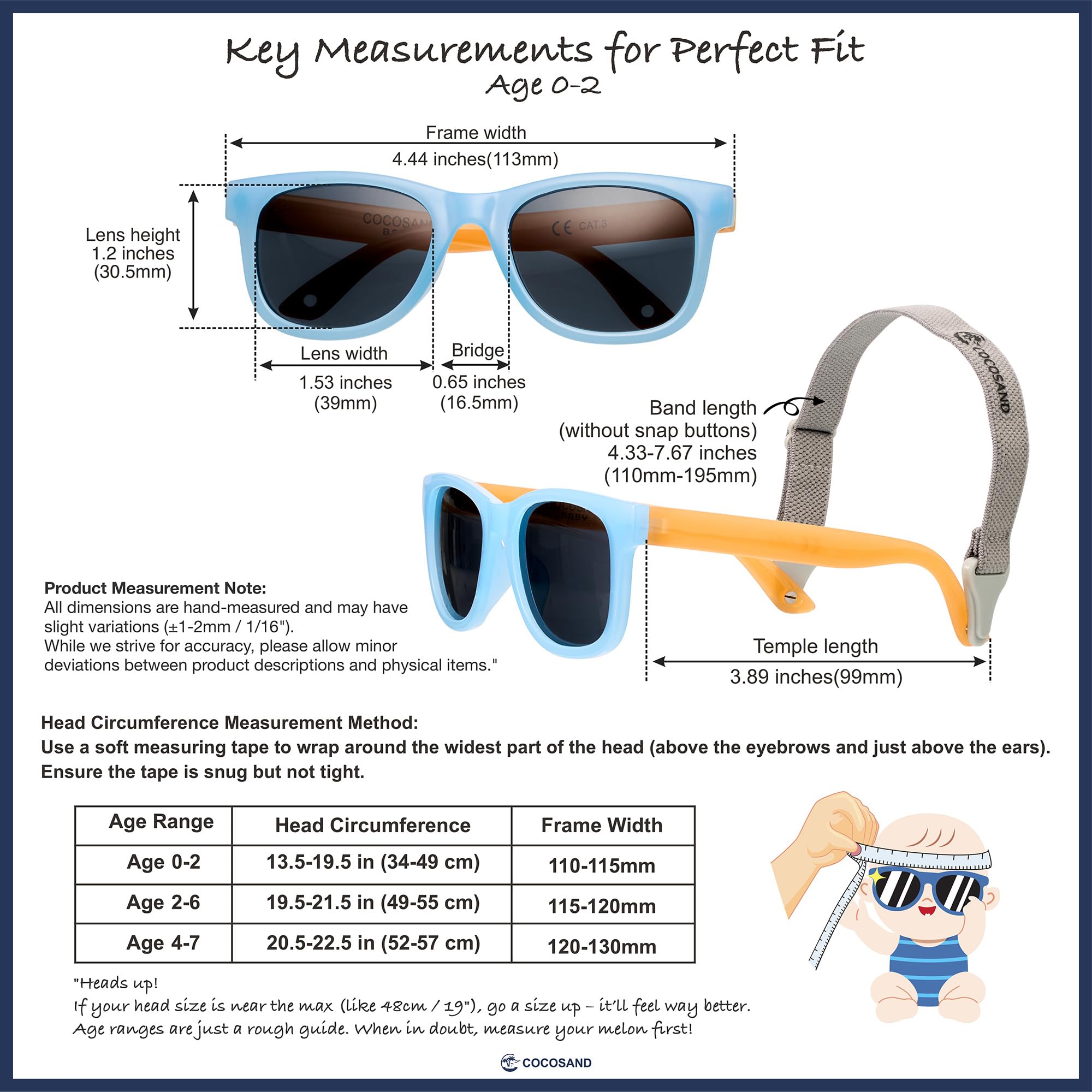 【Perfect Fit for Growing Babies】:Our infant sunglasses fit babies with head circumferences up to 48cm. The adjustable temple and 110 - 195mm strap mean a custom fit for every stage. Whether your baby boy or baby girl is growing fast, these sunglasses grow with them