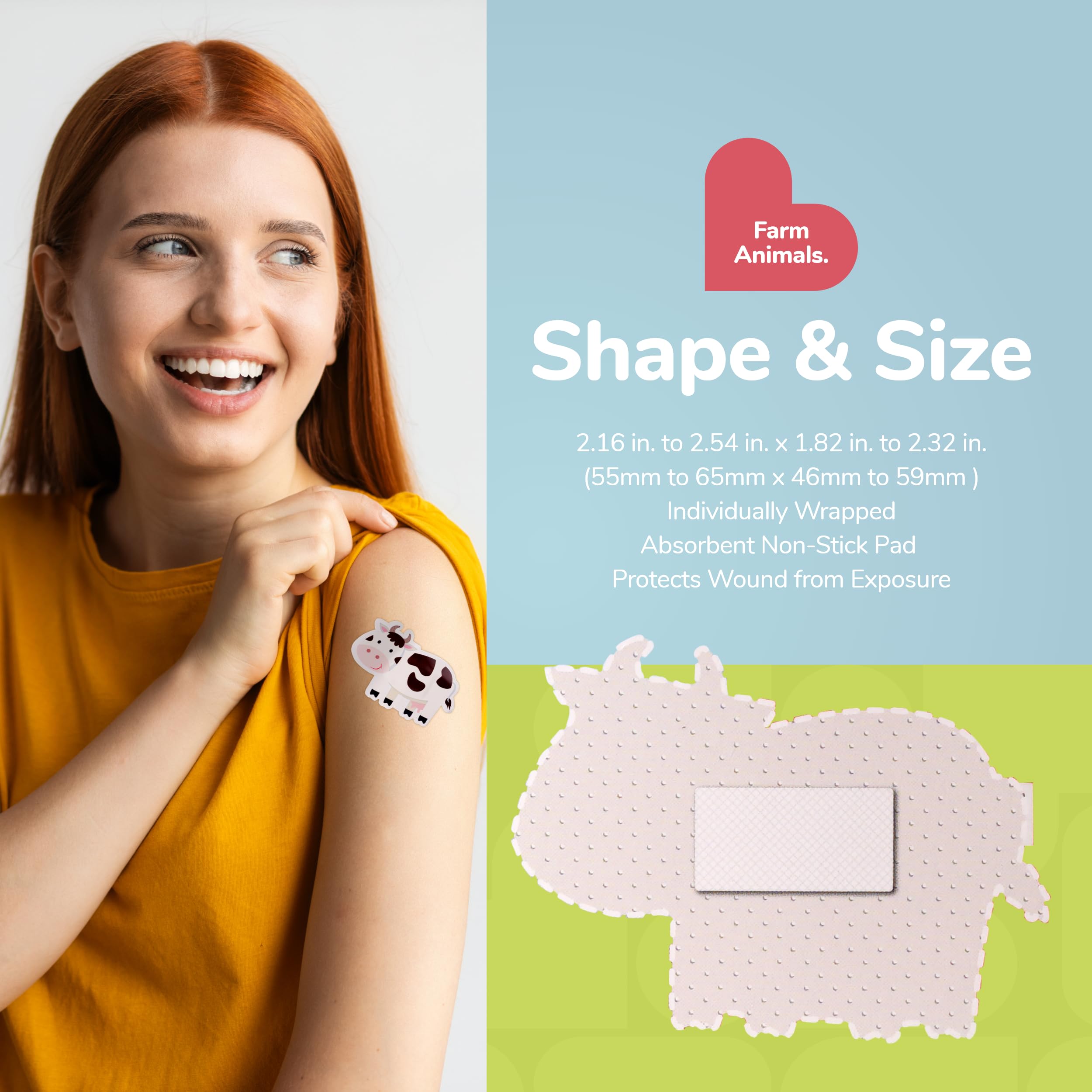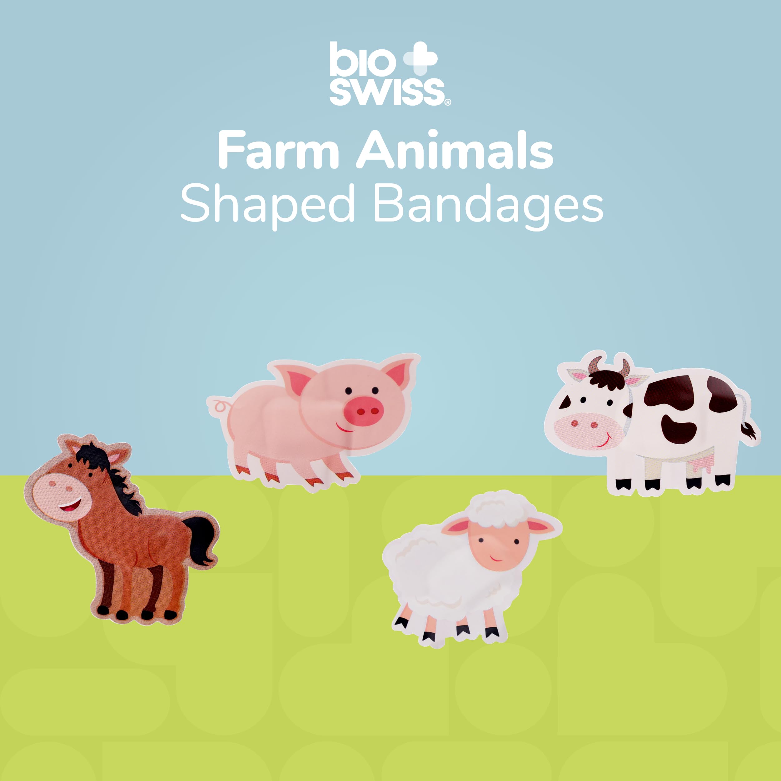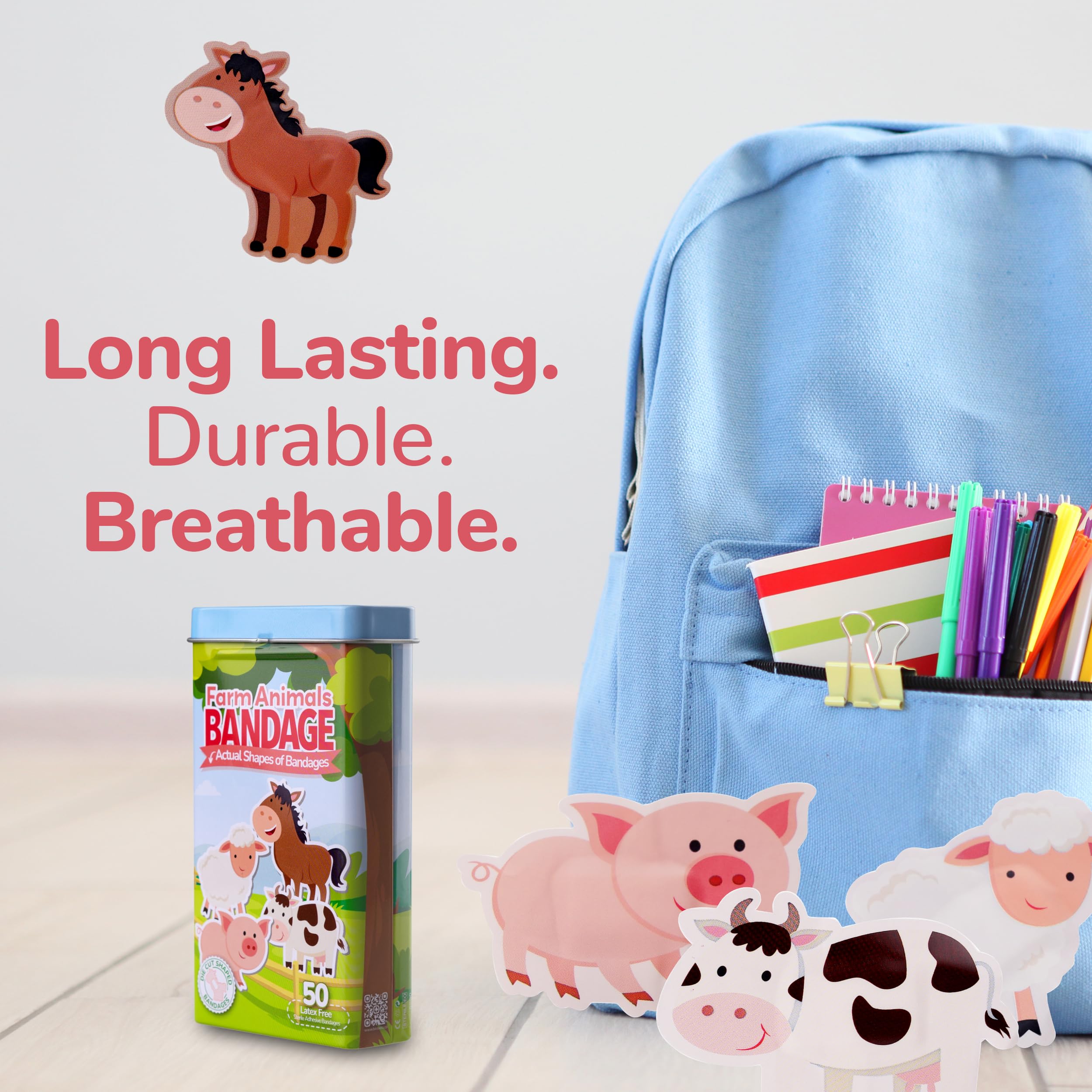 50 FARM ANIMAL KIDS BANDAGES: Fun farm animal-shaped adhesive bandages tin helps protect cuts, scrapes, and minor wounds while making healing less stressful for children; bandages come in 4 assorted styles