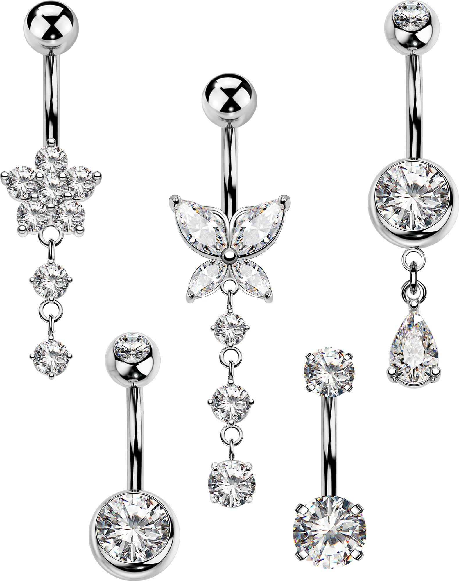 Belly Button Ring Set: 1 belly button ring pack includes 5 pieces silver pink belly button rings, 1 piece internally threaded double heart pink cubic zirconia belly ring, 1 piece pink cz flower belly button ring dangle, 1 piece pink cz paved heart dangle belly button ring, 1 piece pink cz bow belly button ring and 1 piece pink cz butterfly belly button ring, so many cute belly button rings for women to choose from and match for your outfit