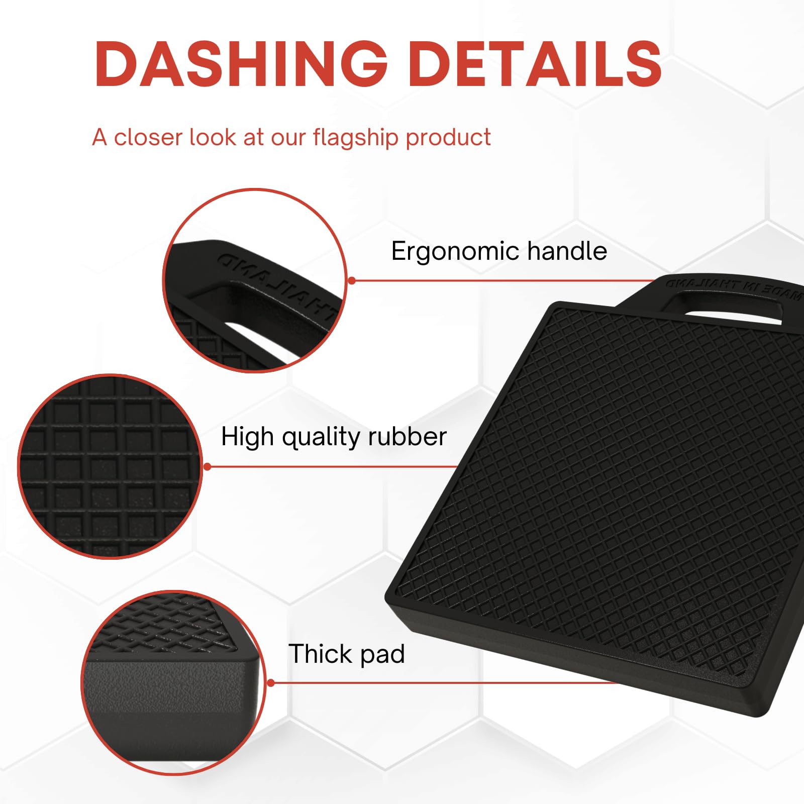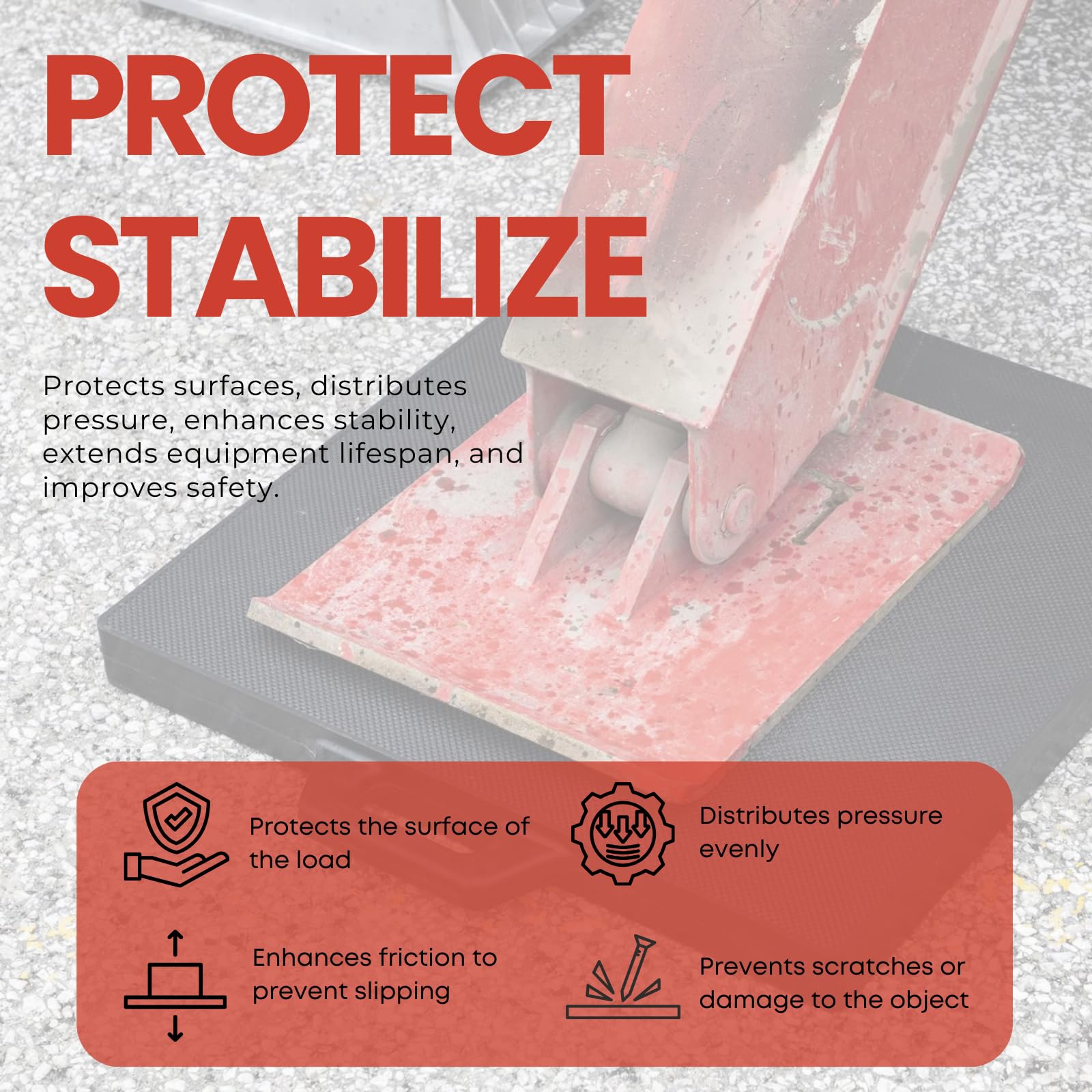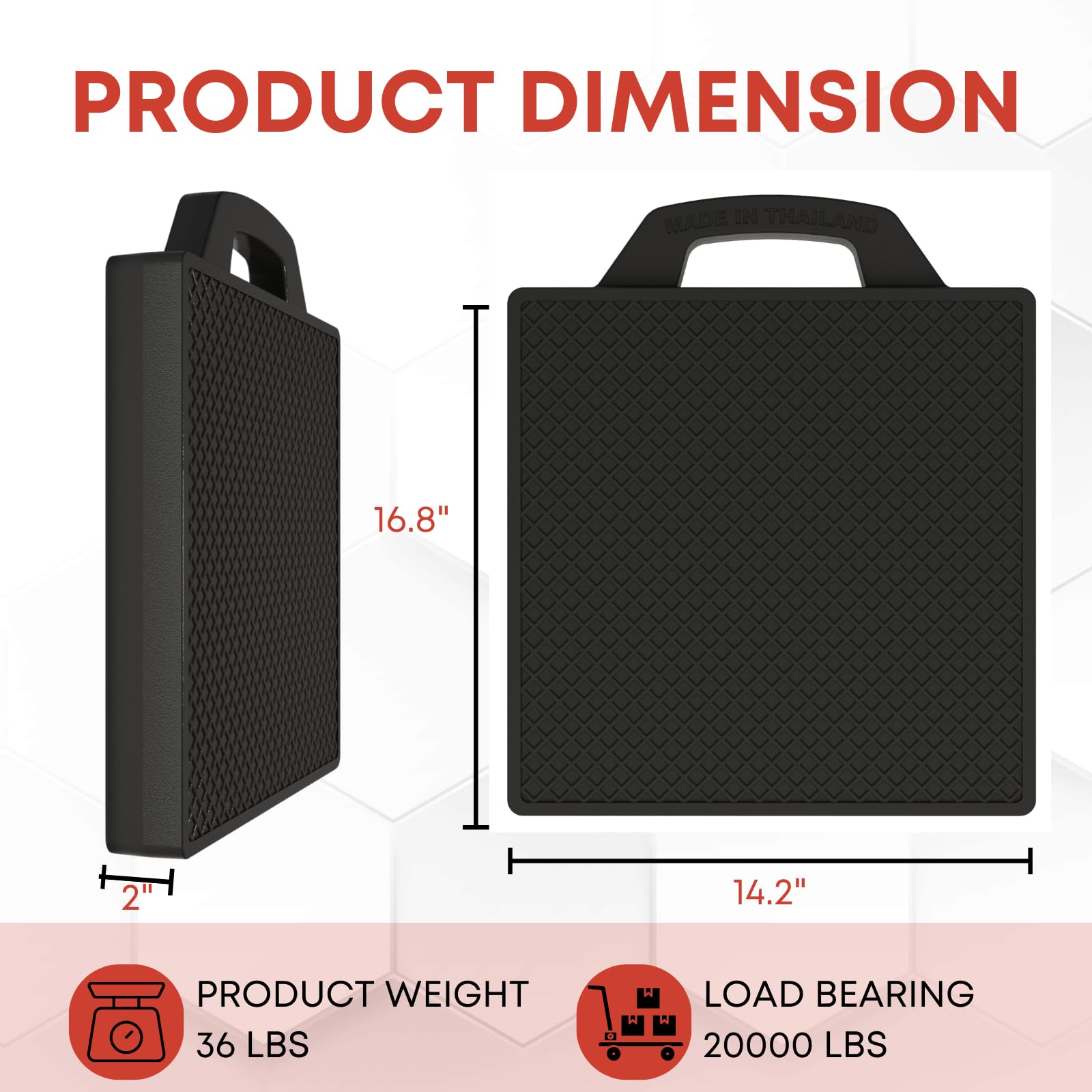 Heavy-Duty Rubber Construction: Made of durable rubber, these jack pads resist UV, heat, water, and oil, providing long-lasting performance. With dimensions of 14.2"x16.8"x2" and weighing 36 lbs, they are ideal for stabilizing jacks, leveling blocks, and outriggers in any terrain