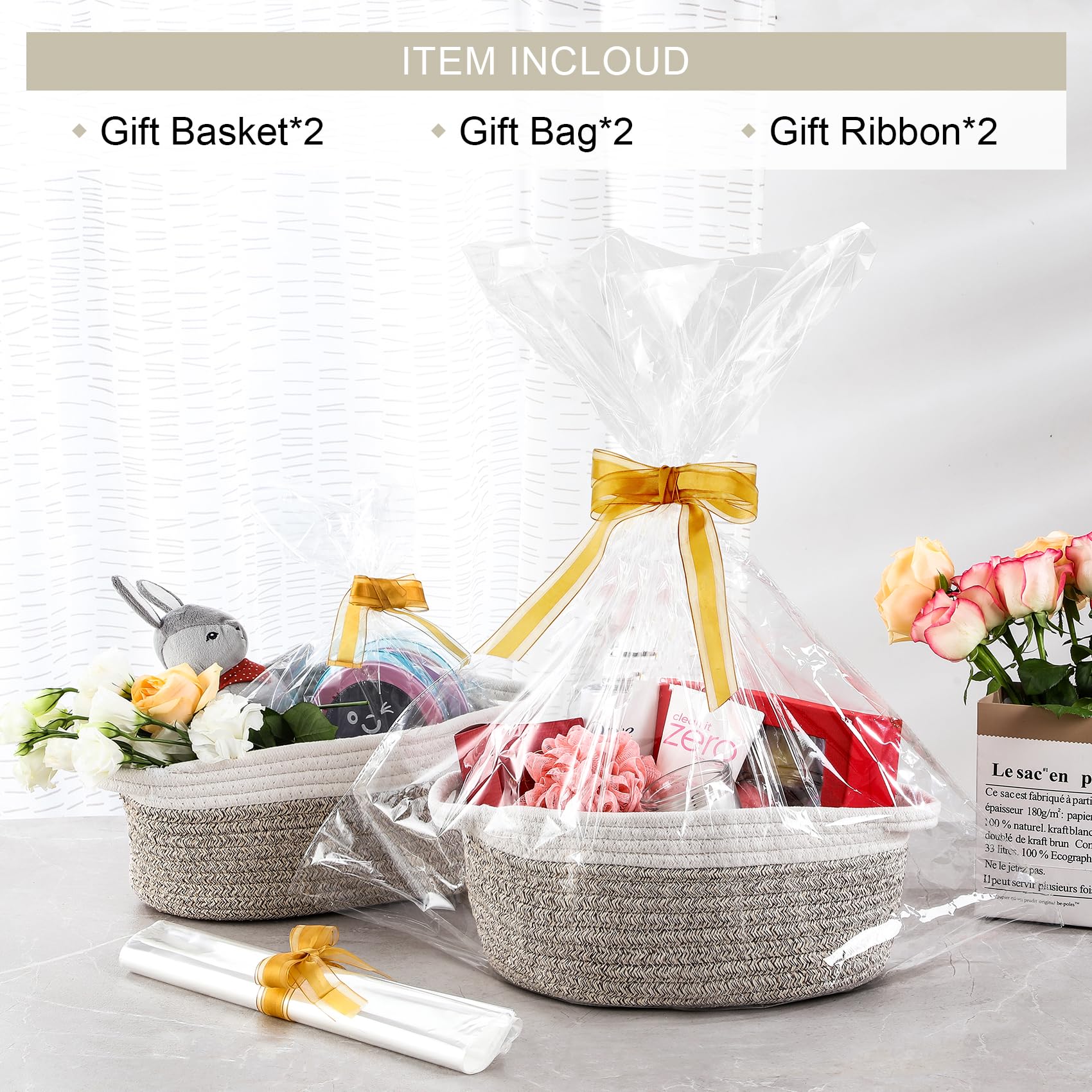 2 Pack Small Woven Basket with Gift Bags and Ribbons, Empty Decorative Gift Chest Box, Cute Baby Gift Basket for Nursery, Cotton Rope Room Shelf Storage Basket with Handles, All 12"x 8"x 5",Brown