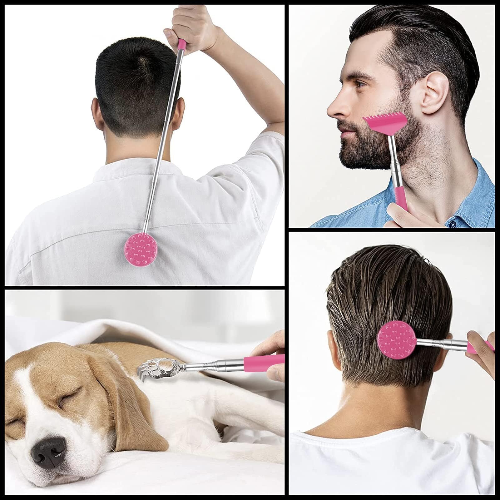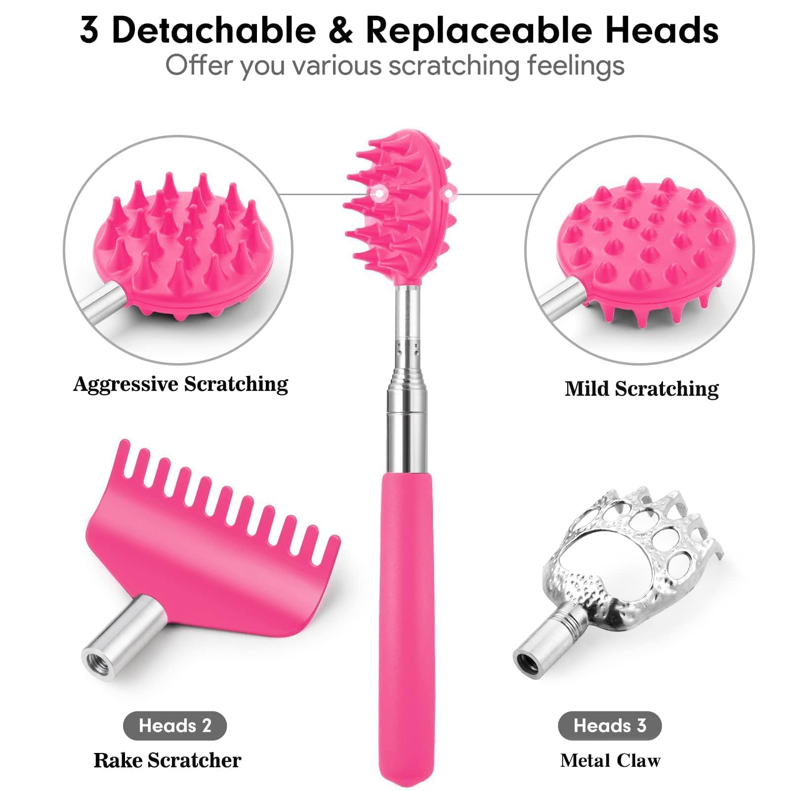 4-IN-1 Design: 4 LARGE detachable back scratcher heads (Unique-designed dual-side scratching spike, claw, rake) allows you to replace at your wish or use with your families for variuos scratching experience on Back, Neck, Head, Beard, and Body. Perfect as christmas xmas gifts stocking stuffers. 8 to 32 Inches enable your beloved men women get all of the hard-to-reach spots