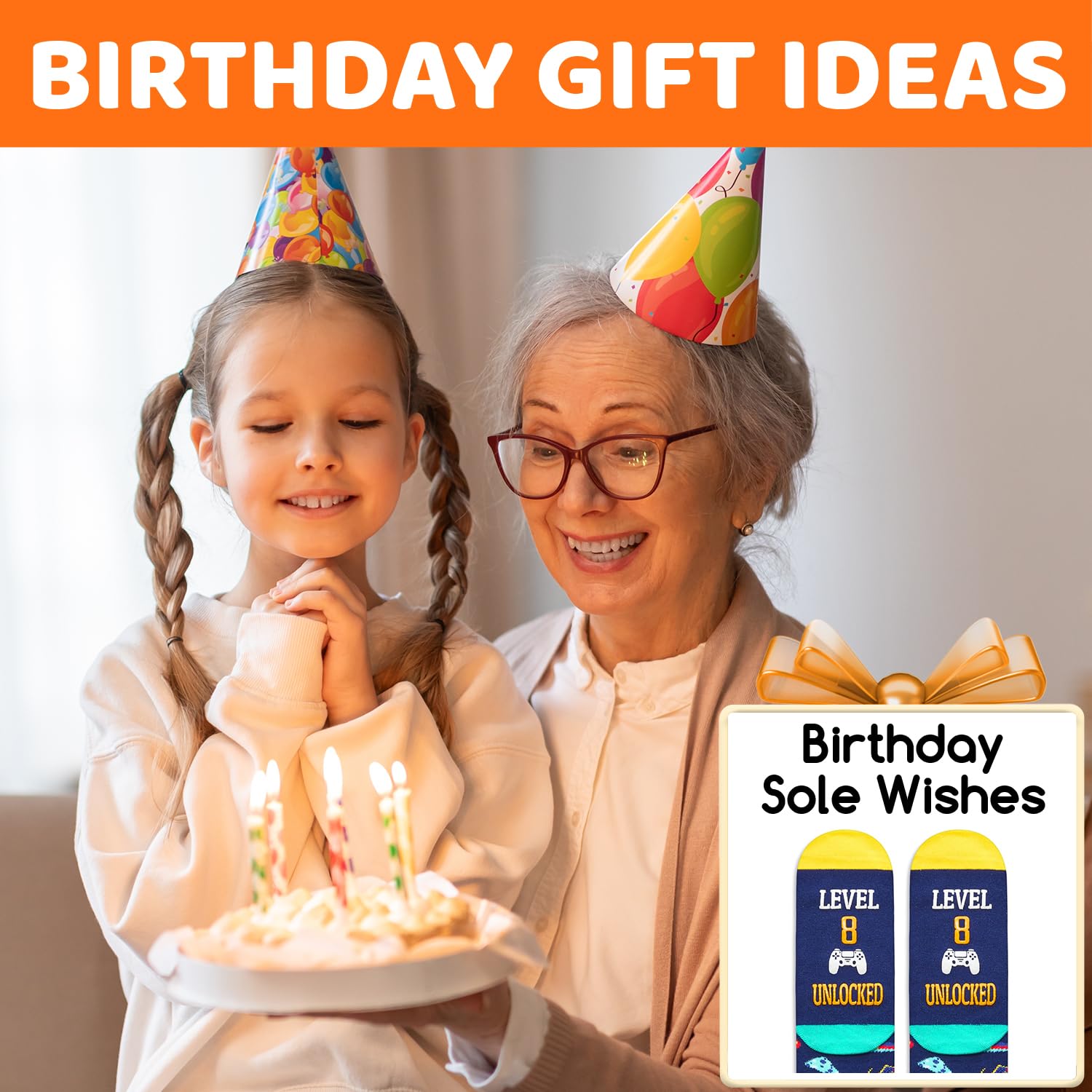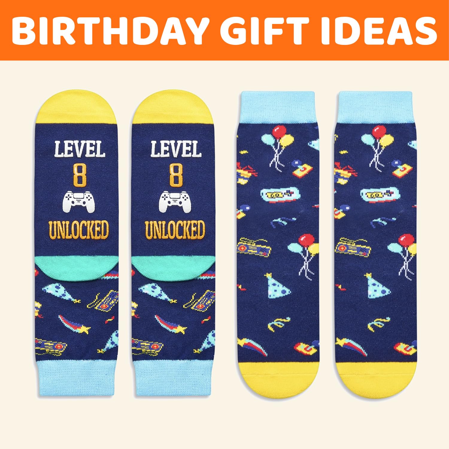 GAMER BIRTHDAY GIFT: Socks with “Level 8 Unlocked”designs make a playful gift for 8 year old boys.