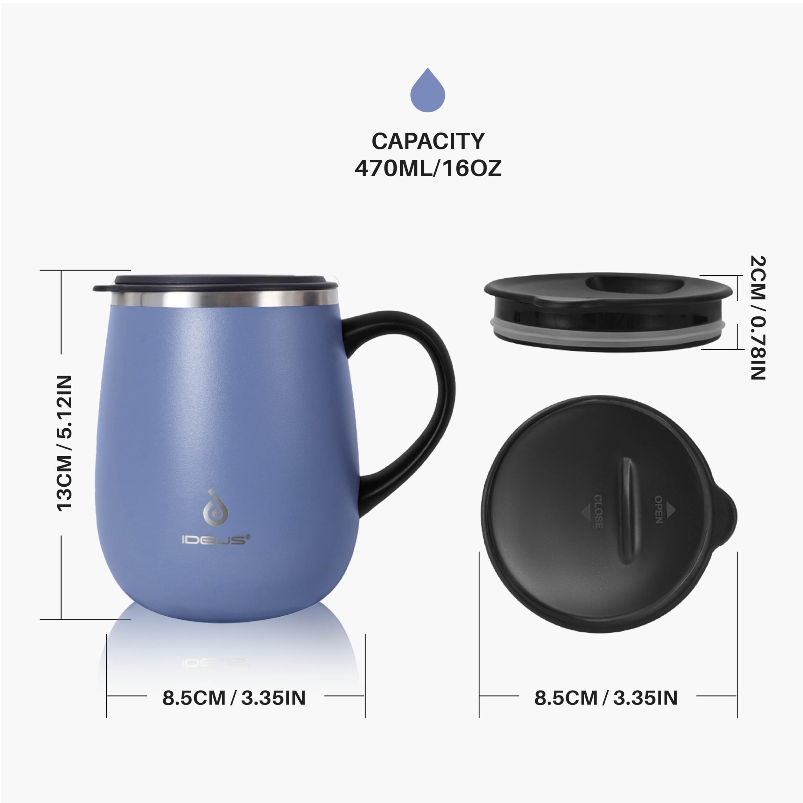 【VACUUM INSULATION】- IDEUS 16 oz coffee tumbler is made from 18/8 stainless steel. Advanced double-wall vacuum insulation technology can keep the temperature of beverages for up to 6 hours (hot) & 12 hours (cold).