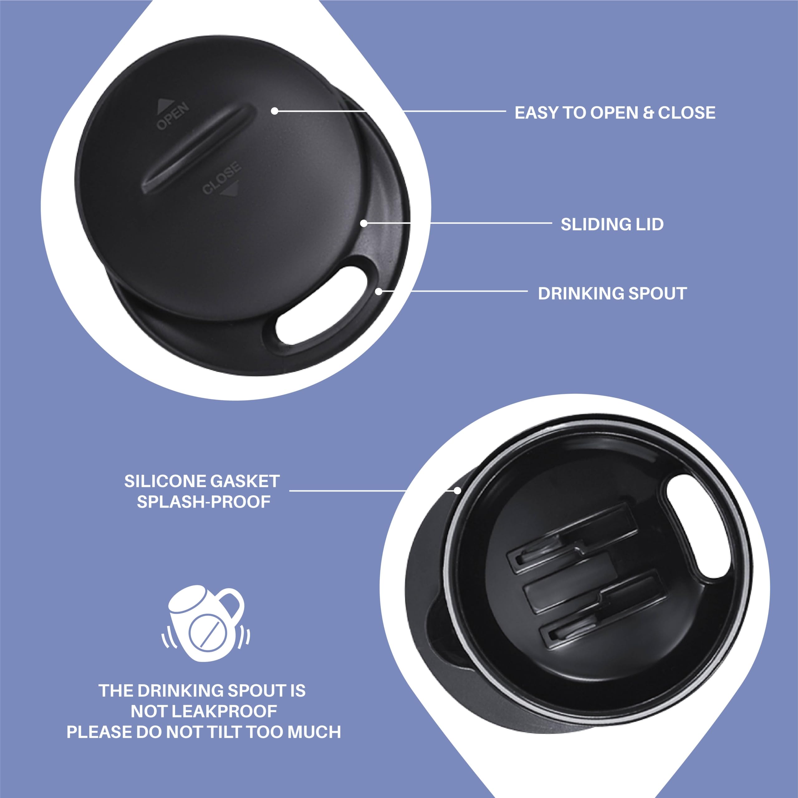 【PRESS-IN LID】- Silica gasket seals to achieve maximum spillproof capability. Drinking hole on the top, with a splash-proof sliding cover. Please note it is to keep drinks contained and prevent heat/cold from escaping. It is not leakproof.