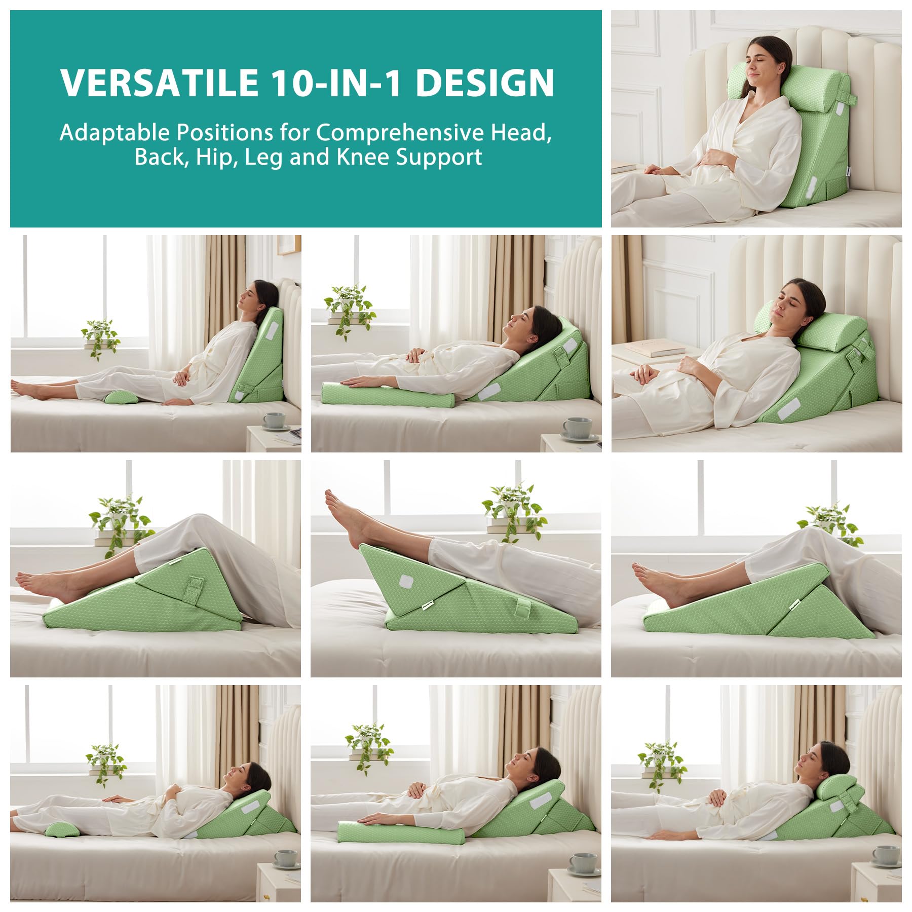 Adjustable 10-in-1 Design: Bedluxe's bed wedge pillow set offers a dynamic 10-in-1 adjustable design. Its ergonomic design supports various uses β from elevated back support for sleeping, reading or working, to a gentle slope for sleep, easing snoring, post-surgery discomfort, acid reflux, and improving blood circulation as a leg elevation pillow.