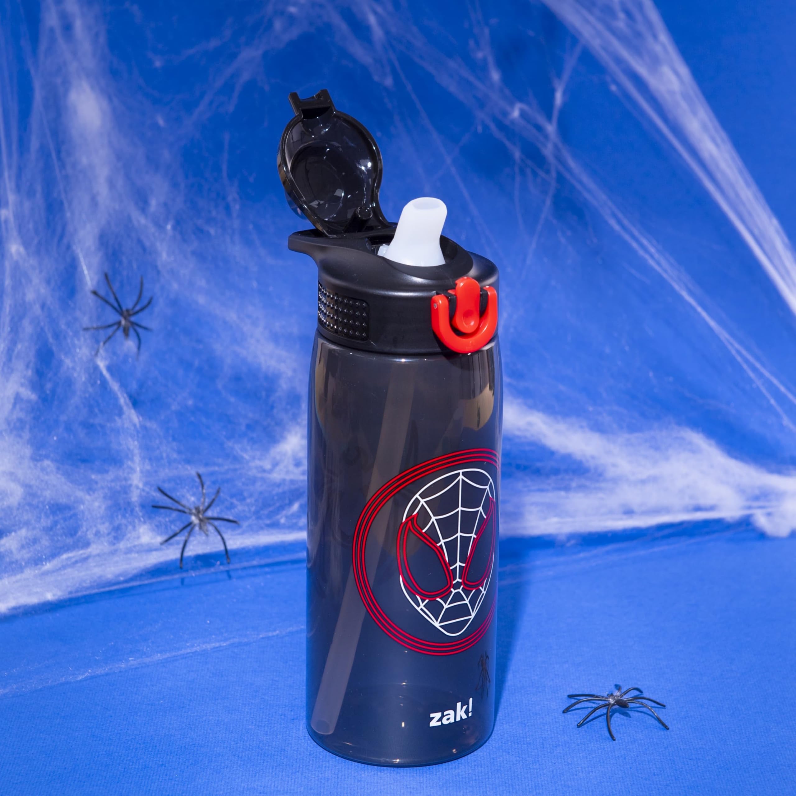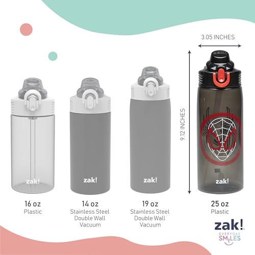 "Everyday hydration is simple and fun with this Spider-Man water bottle from Zak Designs! Easy to Clean: The silicone spout and straw can be removed from the lid, and the pieces are dishwasher safe for simple cleanup at the end of the day. Reusable and Durable Material: Reusable water bottles will last wash after wash—good news for you and the environment! The 25 oz water bottle is made of PP plastic, durable enough to use every day and bring on any adventure. Leak-Proof Lid: The lid screws on securely and won't leak when the spout is closed, though water flows for easy drinking when the spout is open. The easy-open button has a flip-up lock to keep it from activating accidentally. On the Go: The water bottle has a built-in carrying loop on the lid for easy transportation, and with the spout cover to keep the spout clean and closed, it can be tossed into a bag for worry-free travel. Specifications: 25 oz capacity. Made of durable plastic. Dishwasher safe, do not microwave. Length: 4.23-inch, Width: 3.05-inch, Height: 9.12-inch. Character: Miles Morales (Marvel's Spider-Man)."