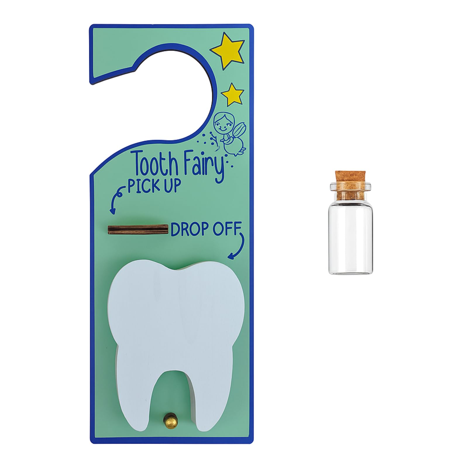 Durable Material Construction: this tooth fairy door hanger is made from wood material, offering durability and strength; Offering an exquisite feel while ensuring the safe storage of your child's precious teeth; The bottle is made from glass and features a wooden cork, contributing to the set's overall classic design