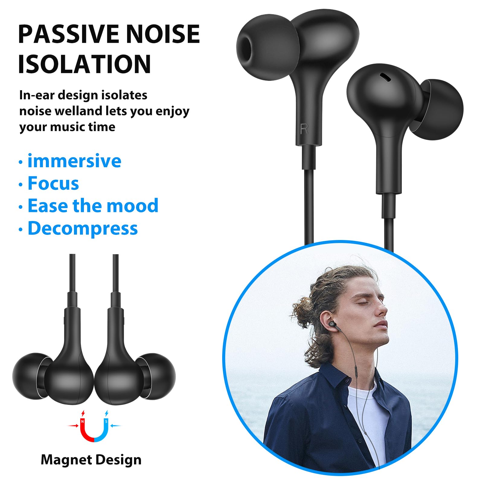 Wired Earbuds Noise Cancelling 3.5mm Headphones for PC School Computer, Ear Buds Wired with Mic Magnetic Plug in Earphones Corded for Samsung A25 A15 A12 A03s S10 A71 Moto Switch MP3 Laptop, Black