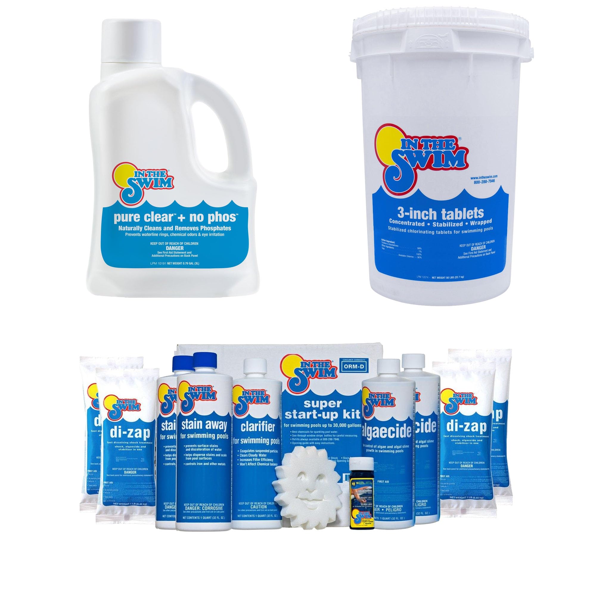 What’s Inside: (2) 1 qt. Stain Away, 1 qt. Clarifier, (4) 1 lb. Di-Zap Multi-Shock, (2) 1 qt. Algaecide, 1 Sun Sorb oil absorber, 10-count 4-Way Test Strips, 3L Pure Clear + No Phos, and 50lb bucket of 3-Inch Chlorine Tablets.