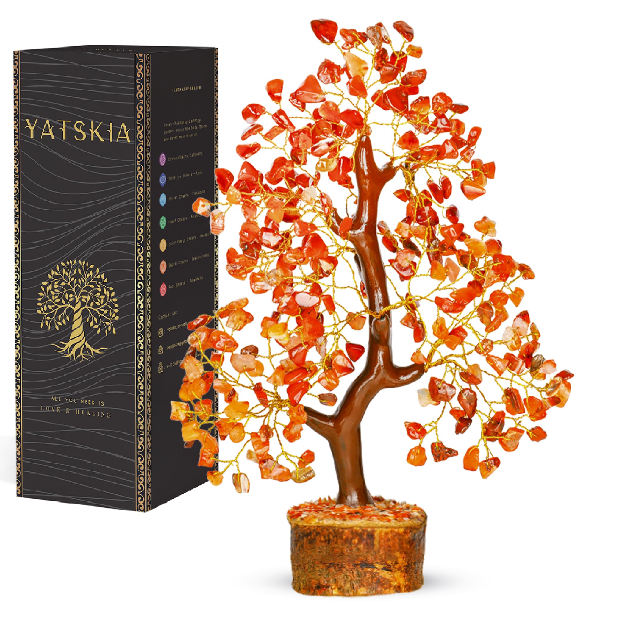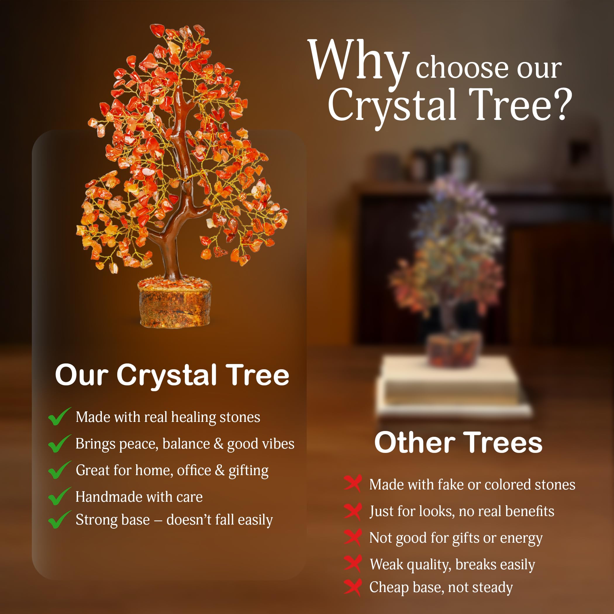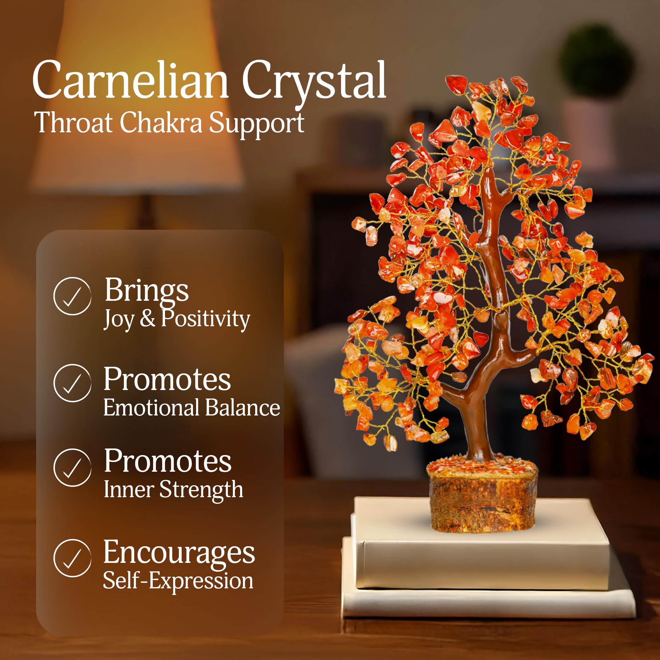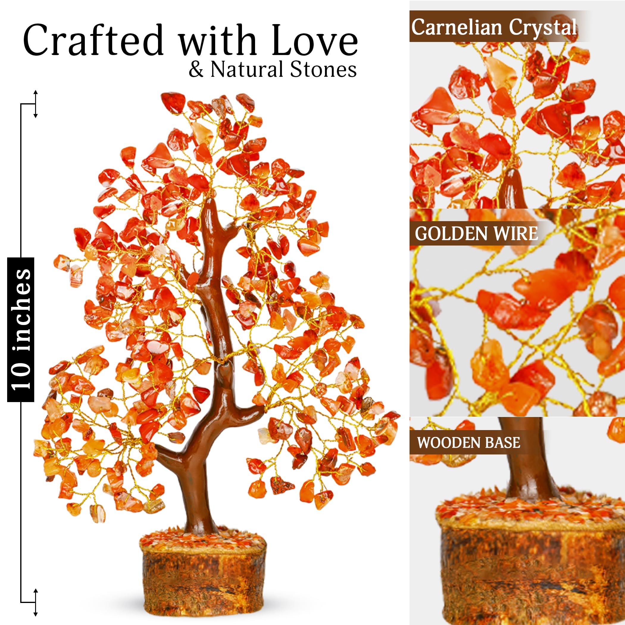 Carnelian Gemstone Tree Specs - A wonderful chakra healing masterpiece from the coasts of India. From a crystal gemstone to the final product, with pure craftsmanship, this reiki crystal tree is filled with healing energy. Symbolizing like a blooming tree, this feng shui bonsai figurine's branches are beaded amidst natural carnelian crystals. The base of this home decorative item is made from wood. The branches are built from golden wires & trunk is made of Mseal, making it approx 10-12 inch.