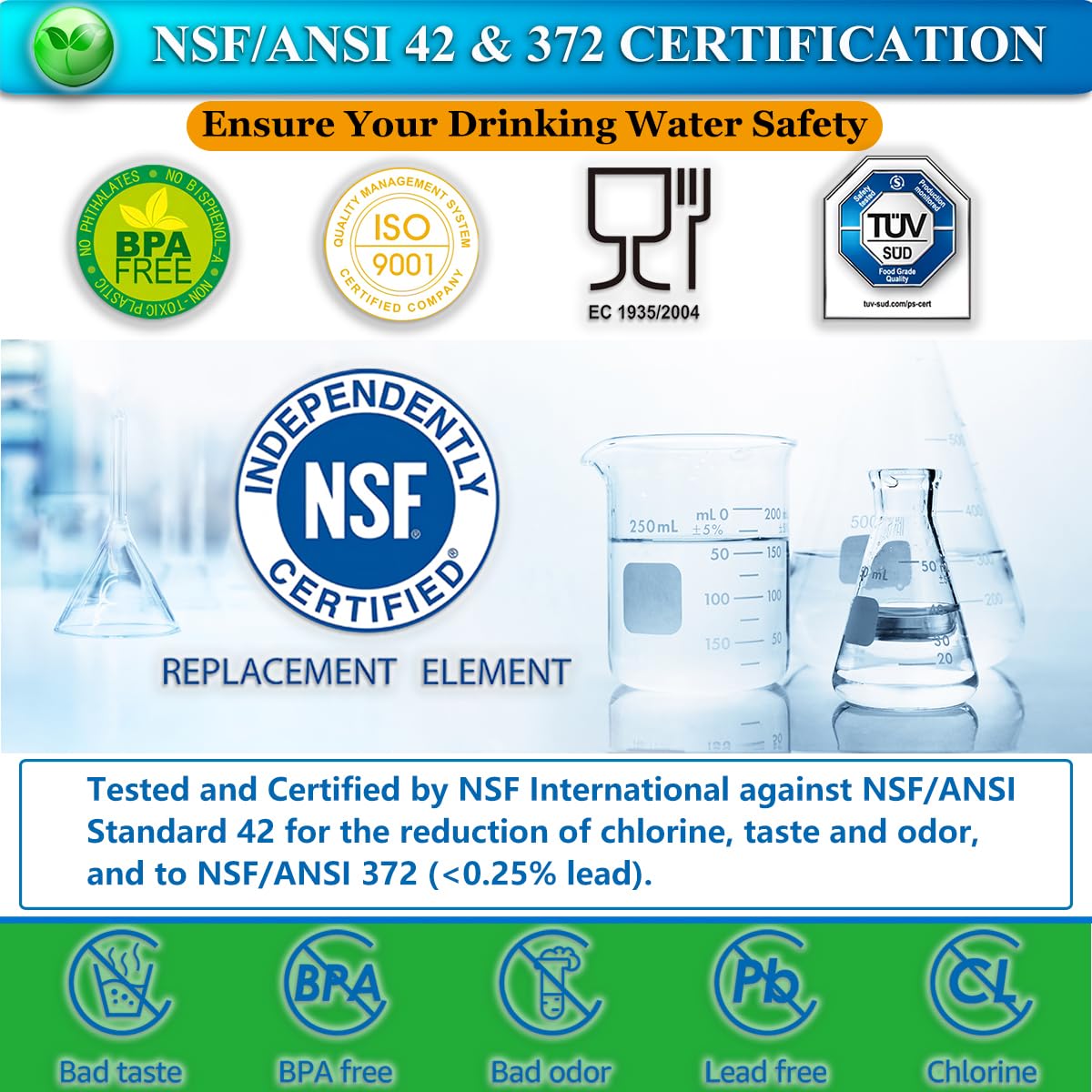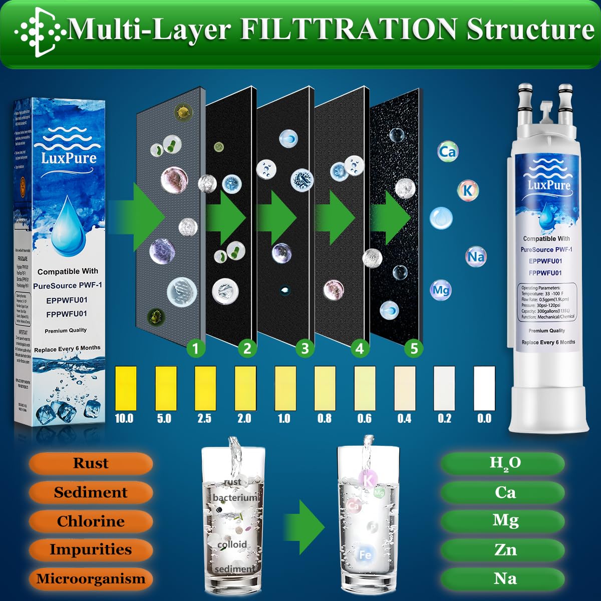 NSF/ANSI 42&372 CERTIFICATION: BPA-free and Food-grade Materials are selected for LuxPure FPPWFU01 PurePour PWF-1 Refrigerator Water Filter,The Filter Housing has Passed NSF 372 Lead-Free Certification for lead-free Materials. Eco-Friendly Coconut Carbon Block has a Wider Surface Area and More Micropores that Providing You with High-Quality, Pure and Healthy Drinking Water