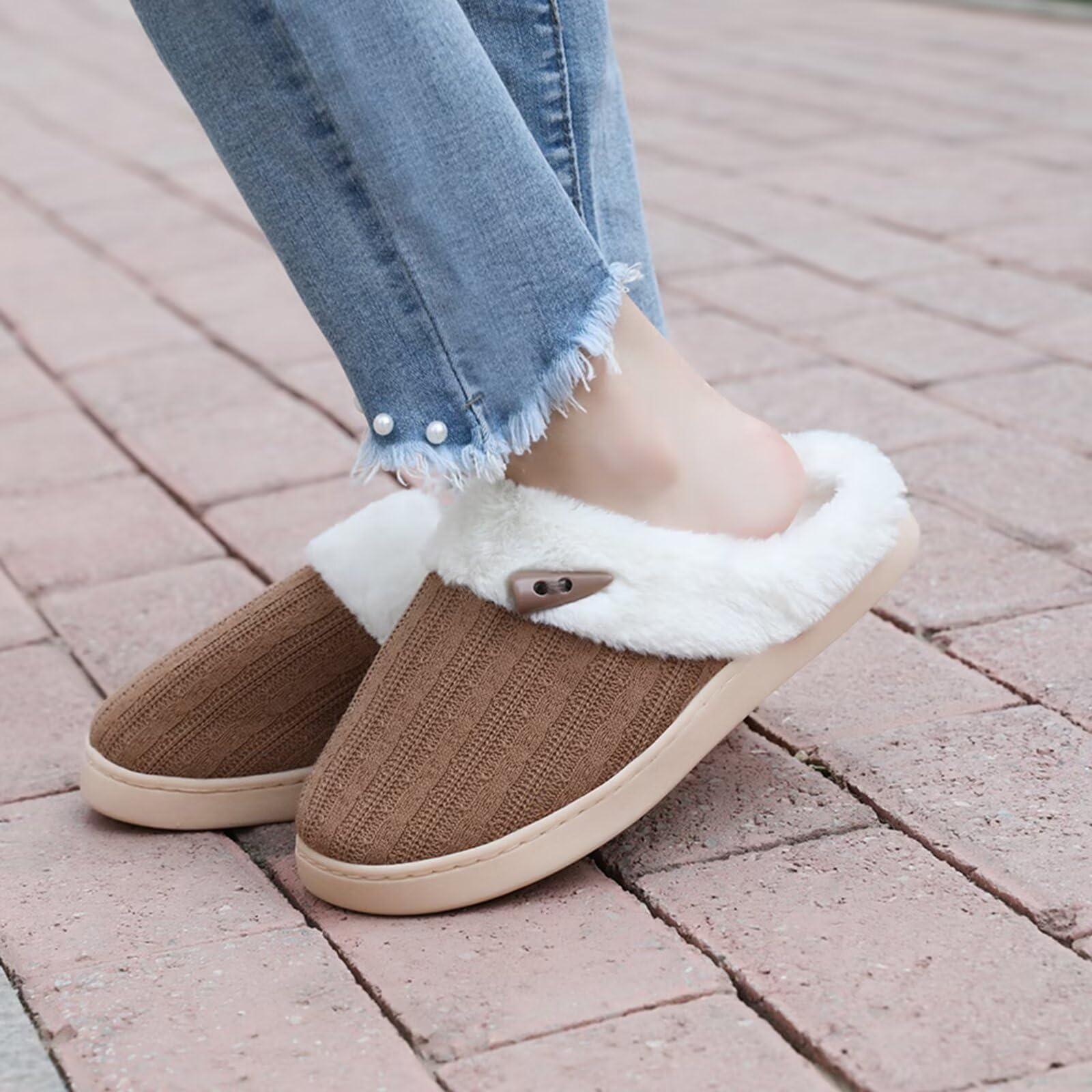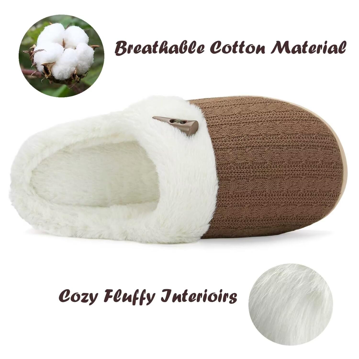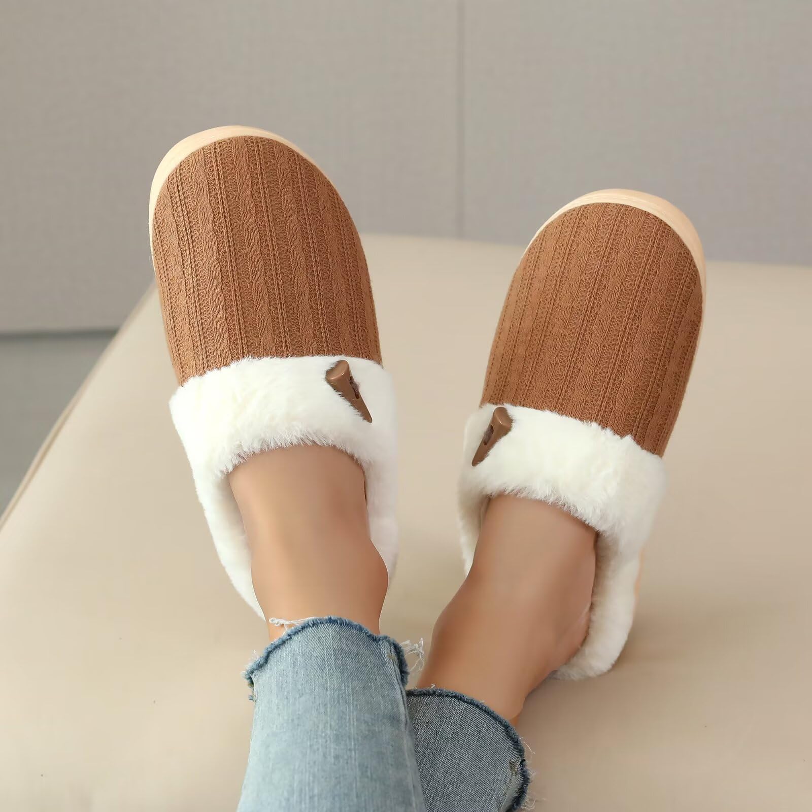 EASY SLIP ON STYLE:Step into comfort easily with these open back fuzzy bedroom slippers that are made with fluffy plush.Soft plush faux fur lining offers superior comfortability from the clouds.Also these comfy house shoes are so chic with knitting upper and horn button design.They're the perfect house slippers for women and girls.