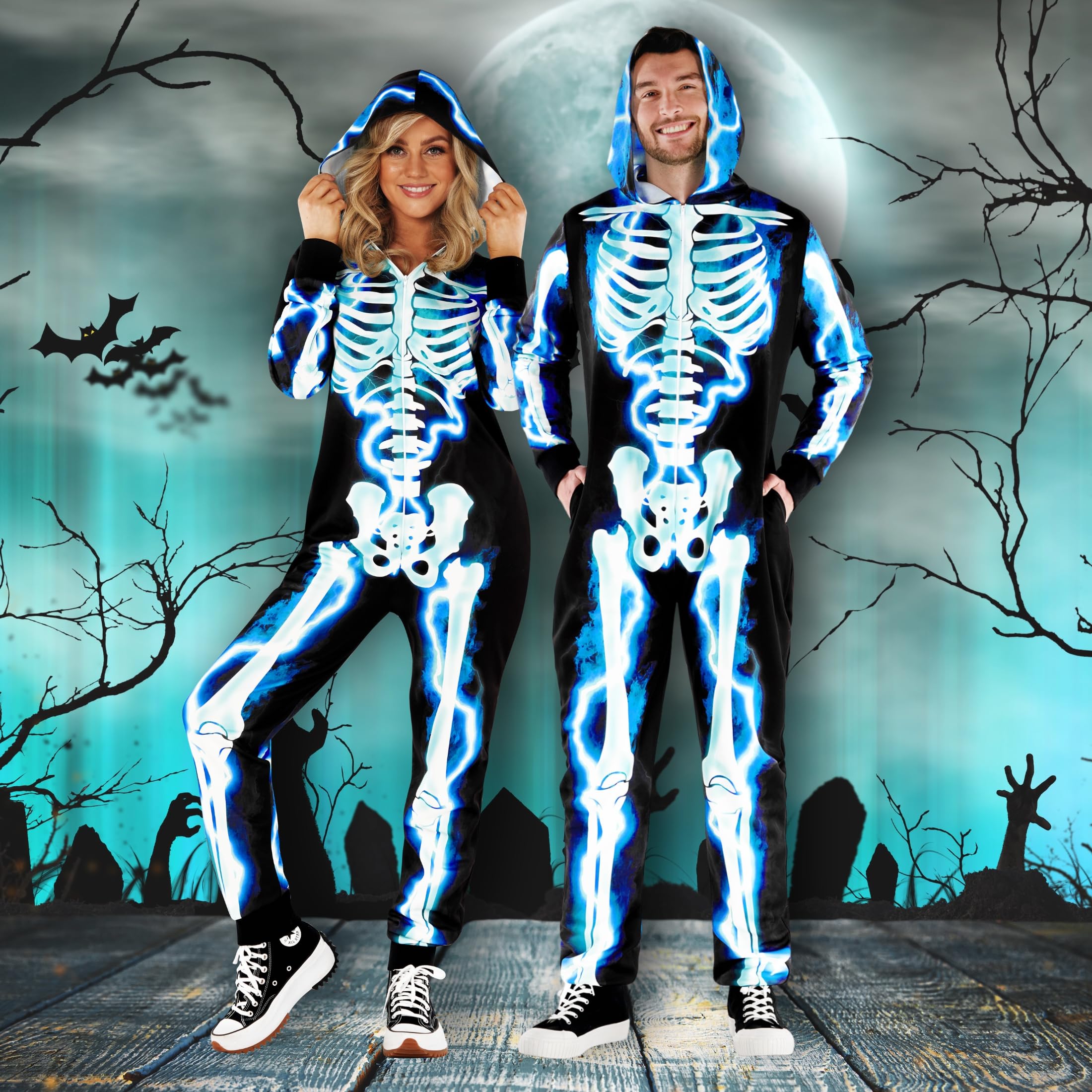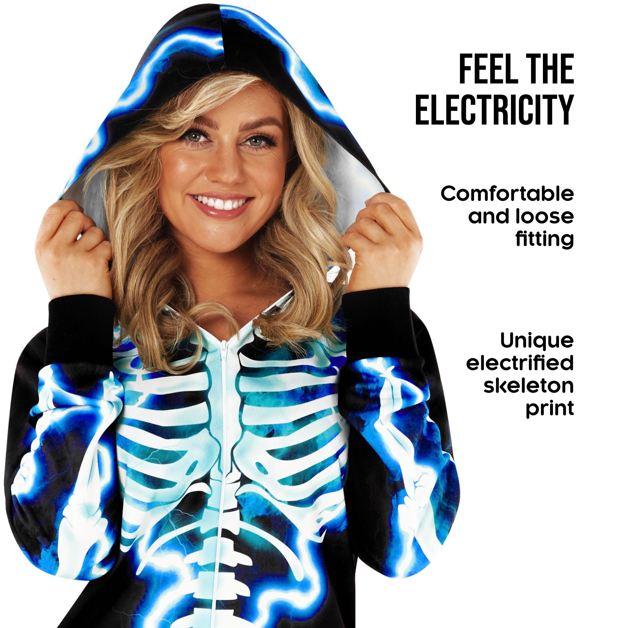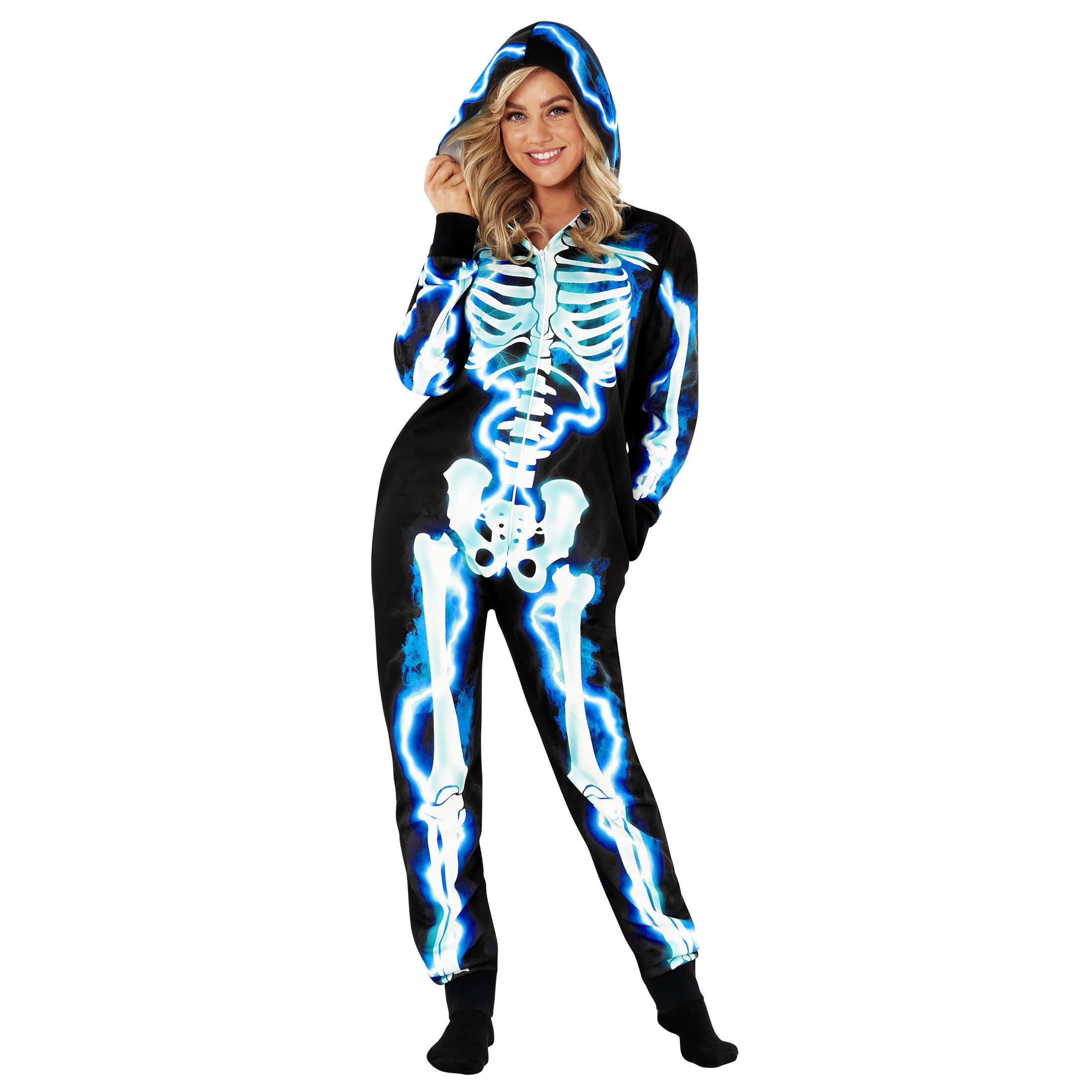 Striking Electric Blue Skeleton Design β Includes one sleek skeleton jumpsuit featuring an eye-catching electric blue print. Designed with comfort in mind, this jumpsuit is perfect for all-night wear and even includes convenient pockets for your essentials.