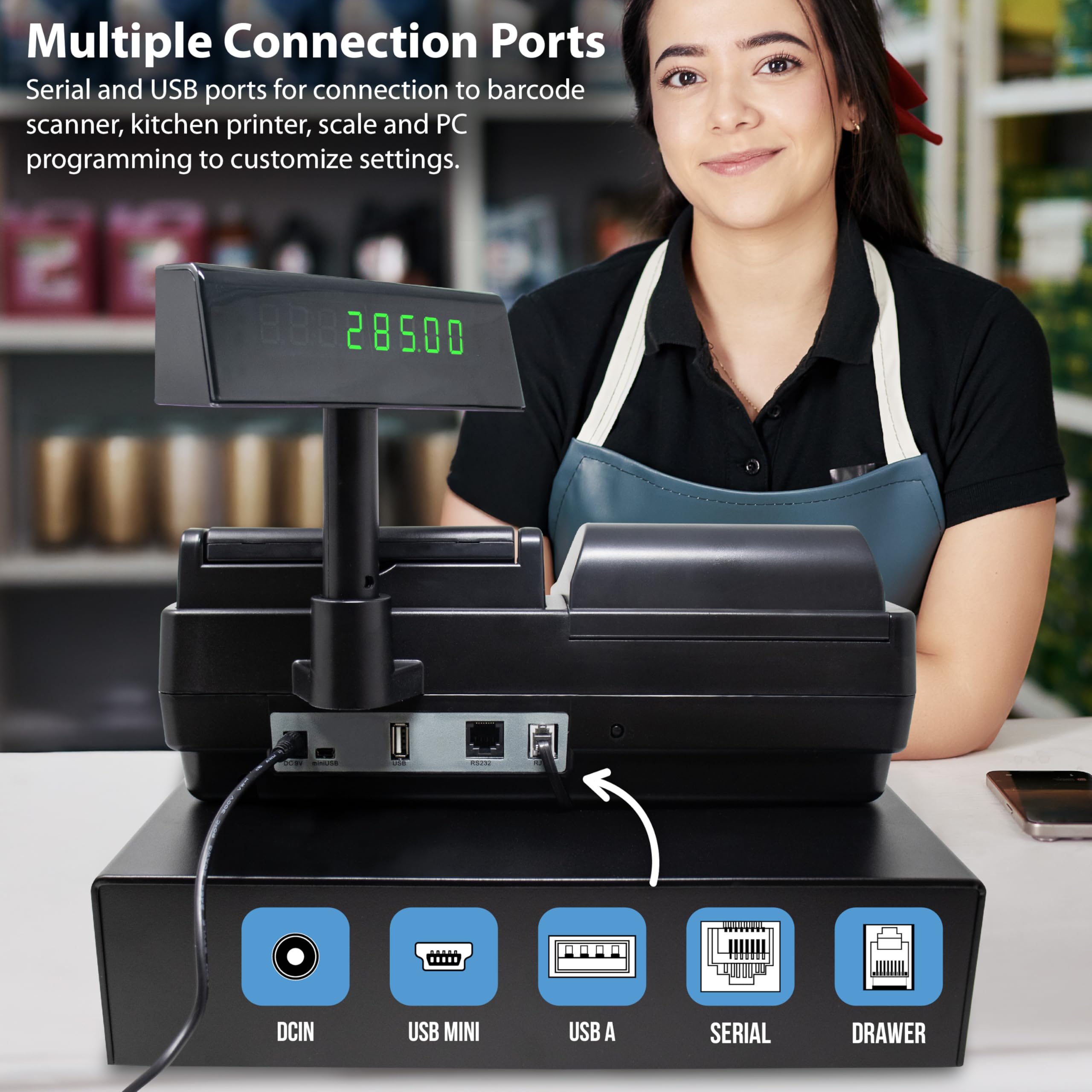 Serial and USB ports for barcode scanner, kitchen printer, scale, and PC connection