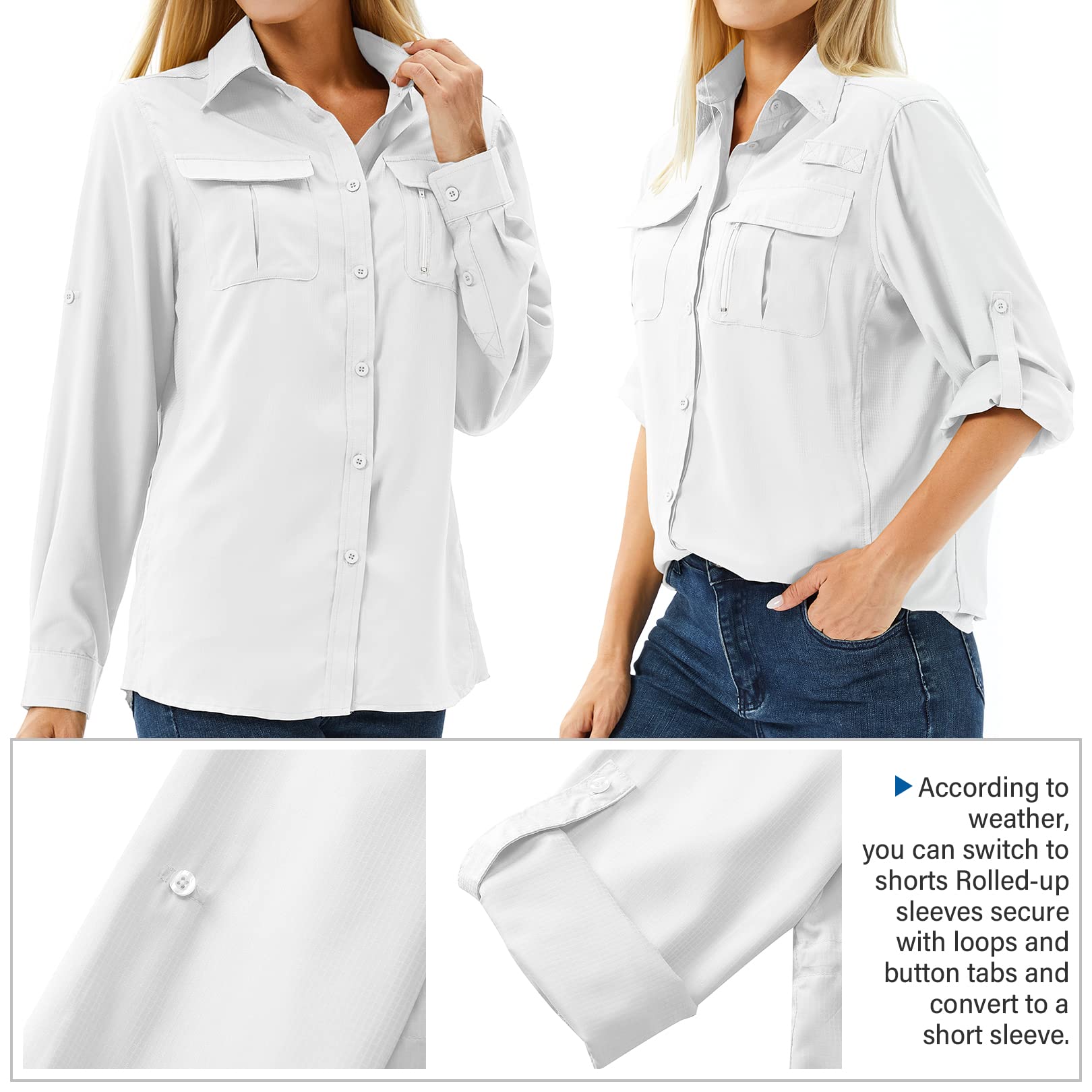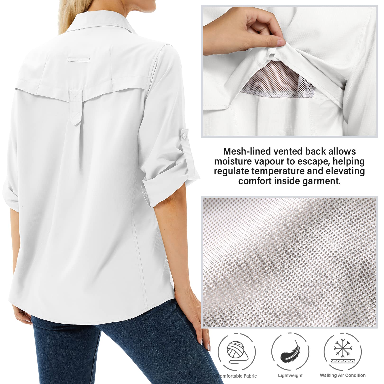 Hiking shirts Women:Womenβs lightweight safari shirts features a mesh-lined vented back for breathability and comfort.Roll-up sleeves to convert long sleeves to short sleeves for hot days.