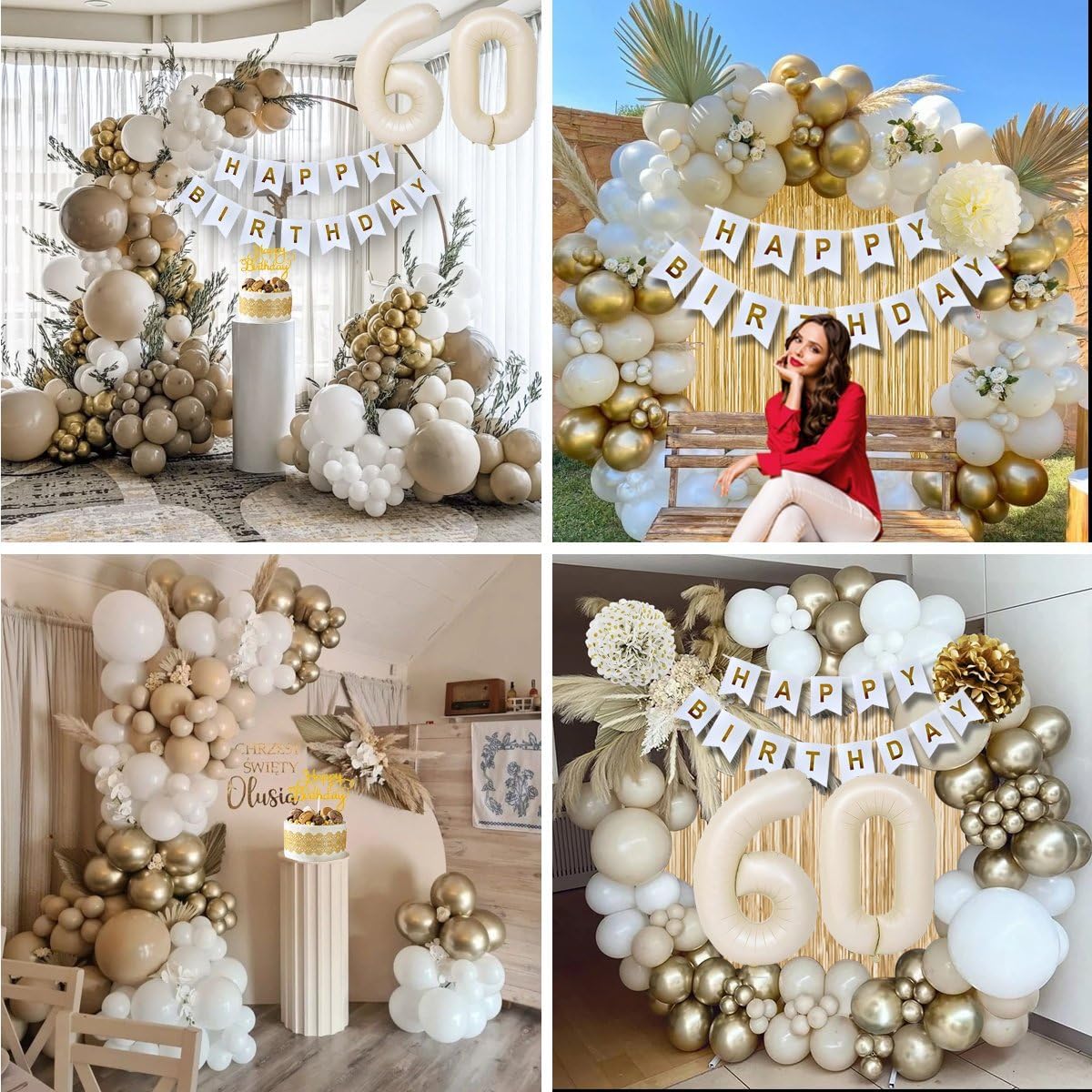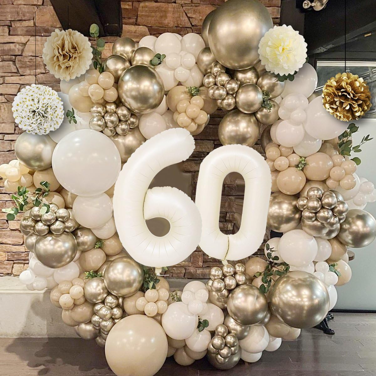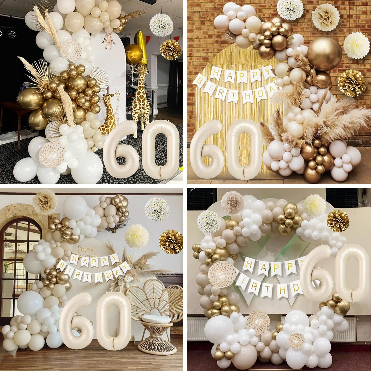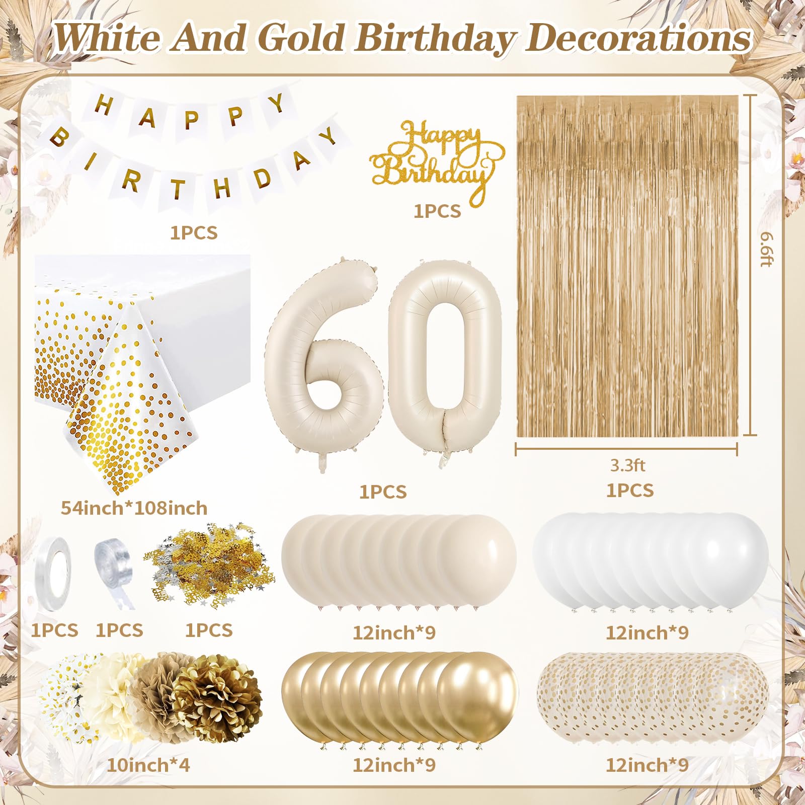 60th Birthday Decorations for Men Women: The package contains 9 x sand white balloons, 9 x white balloons, 9 x gold metallic balloons, 9 x dot balloons, 4 x paper pompom flowers, 1X white sand 60 balloon numbers, 1 x gold happy birthday banner, 1 x white gold tablecloth, 1 x gold rain curtain - 1 x 1 x 2 m, 10g white gold confetti, 1 cake topper, 1 x Ribbon